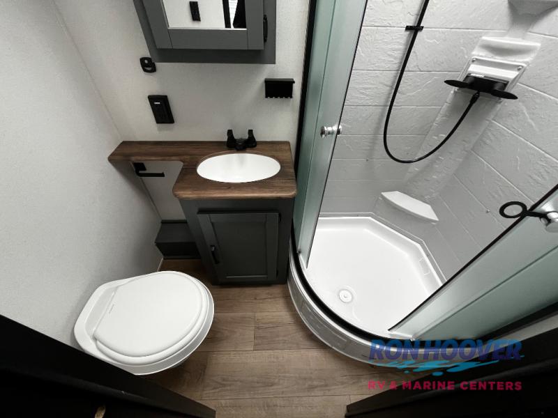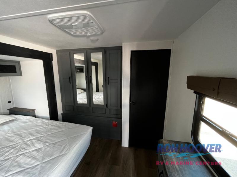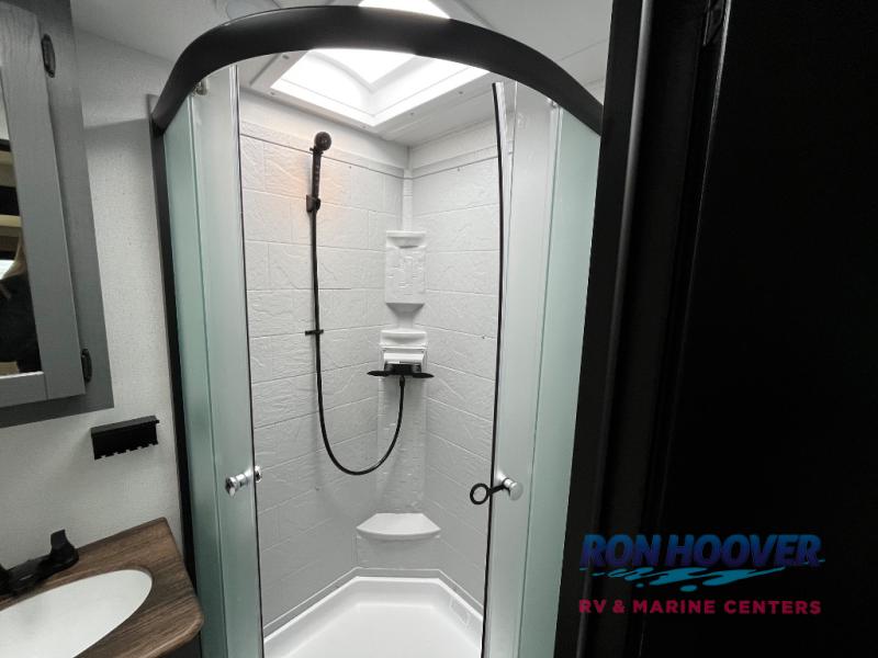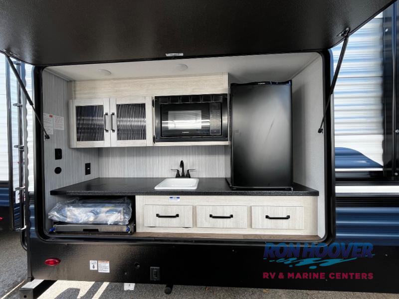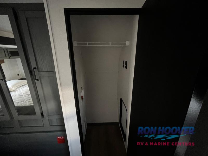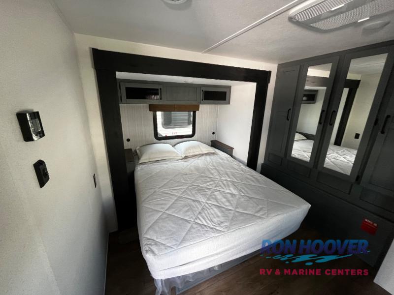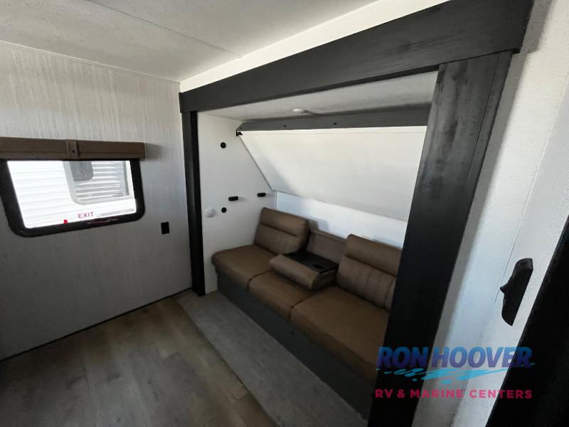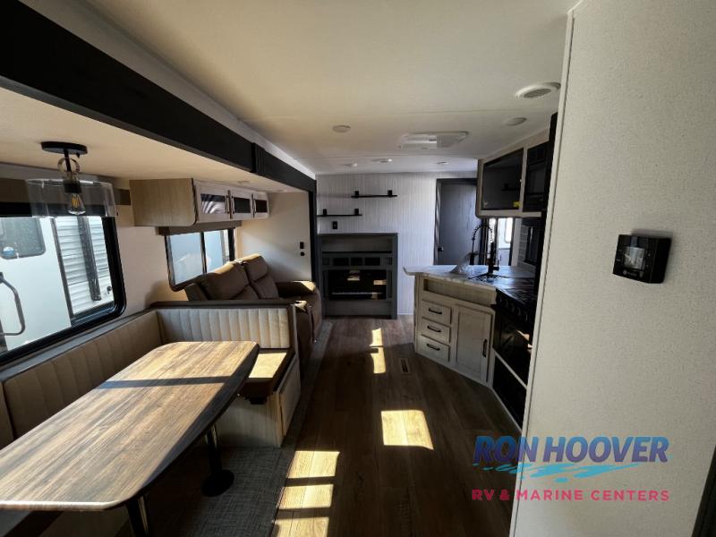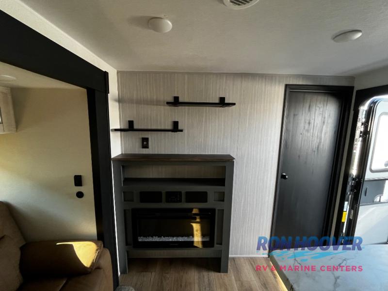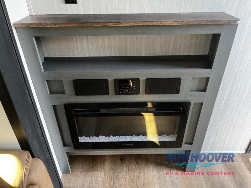 Enjoy your own privacy with two bedrooms in this travel trailer! The front private bedroom has a queen bed slide across from a dresser and a front closet with another closet with washer and dryer prep. The rear private bedroom has a 60" x 74" queen bed slide, a dresser, and a closet. Everyone can stay clean in the full bathroom with the 34" x 34" radius shower and their bellies full with a full kitchen. Enjoy your meals at the U-shaped dinette then relax on the sofa while watching your favorite movies with the entertainment center and fireplace.