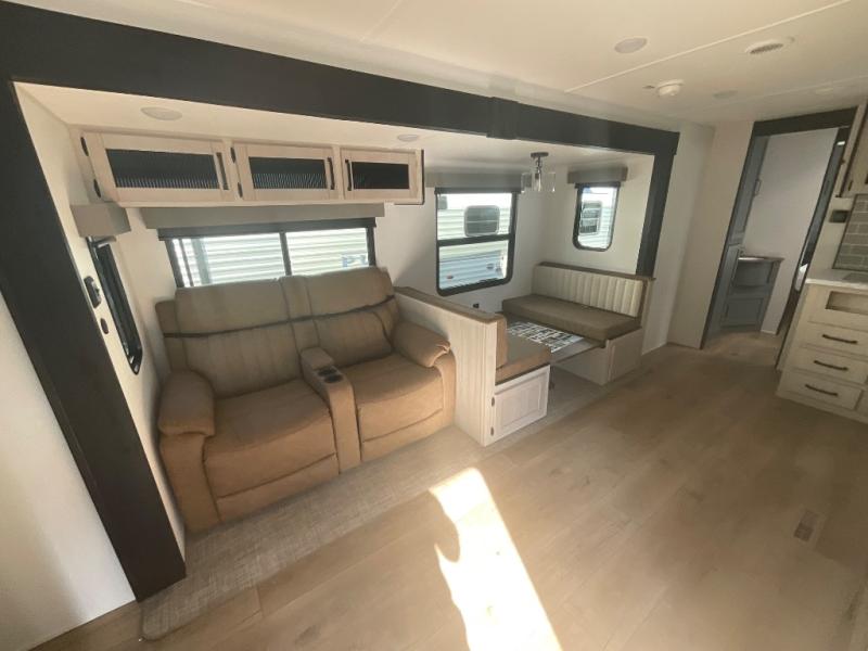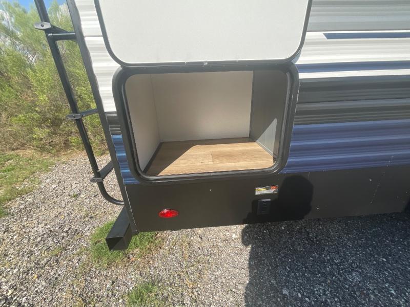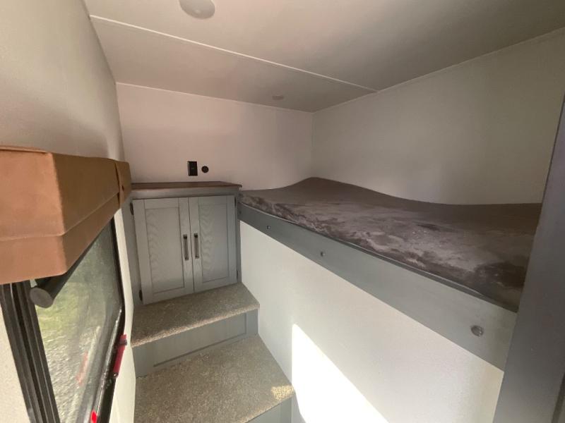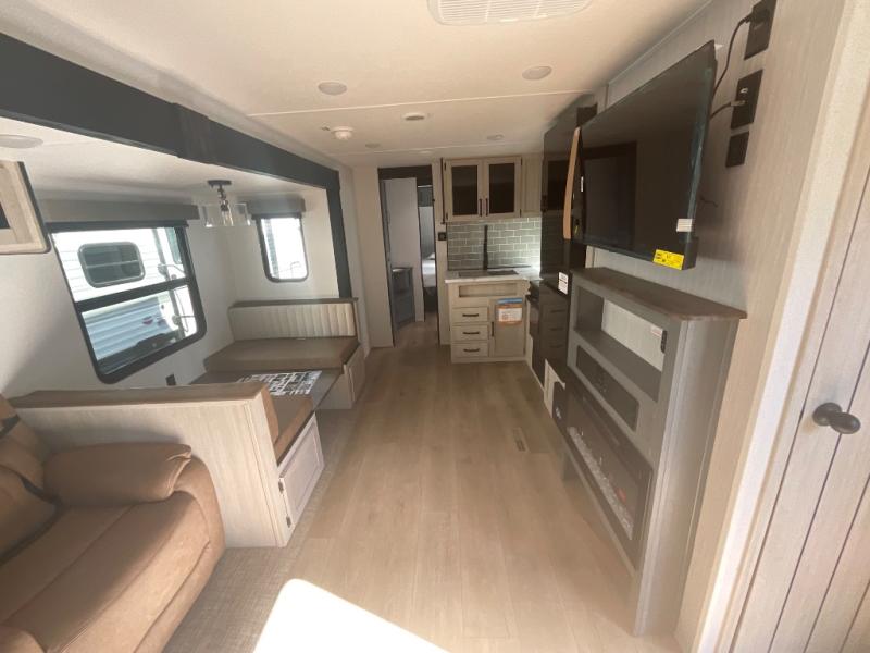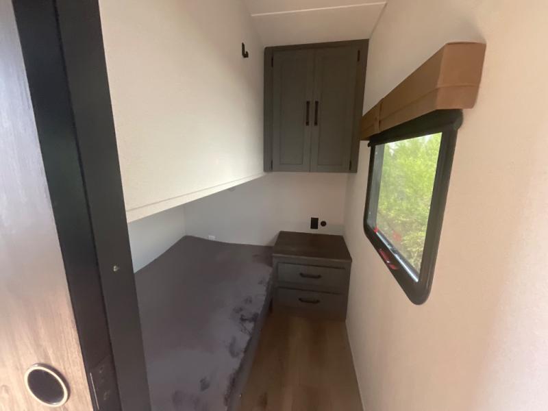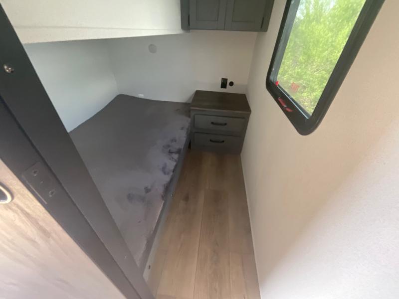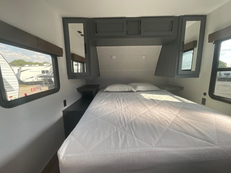 This travel trailer is perfect for camping with a larger group of friends or if you have older kids since there are two private bunkrooms! Each room includes a bunk bed and storage space for clothes, shoes, and more. You'll enjoy your own space up front in the master bedroom that includes a queen bed, dual shirt closets, and one of the dual entry doors to the unit for added convenience. Everyone can come together in the combined living area and kitchen that includes a large slide out with a sofa and booth dinette, plus there is a fireplace to make this space feel more like home. And a full kitchen lets you create home-cooked meals each day.