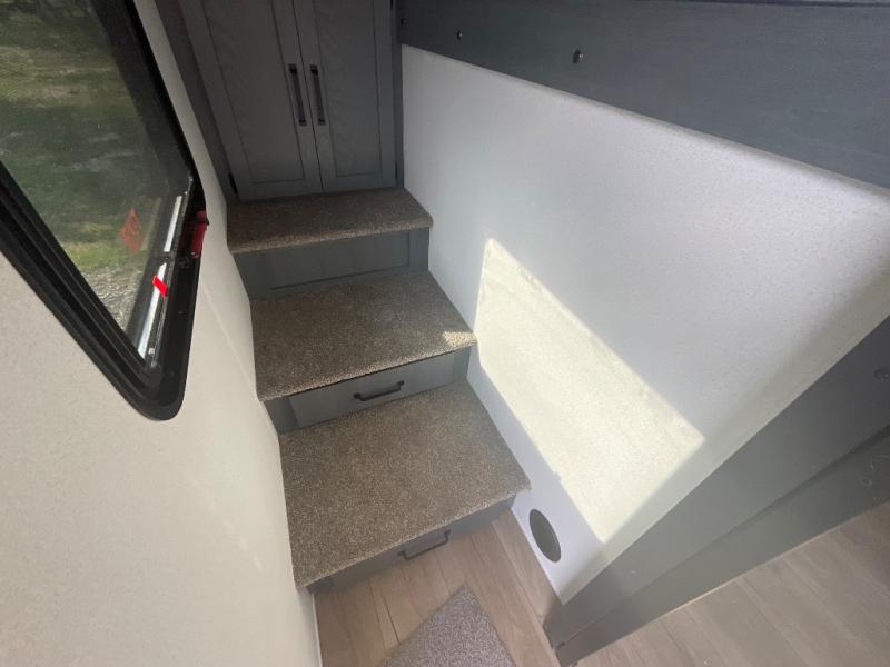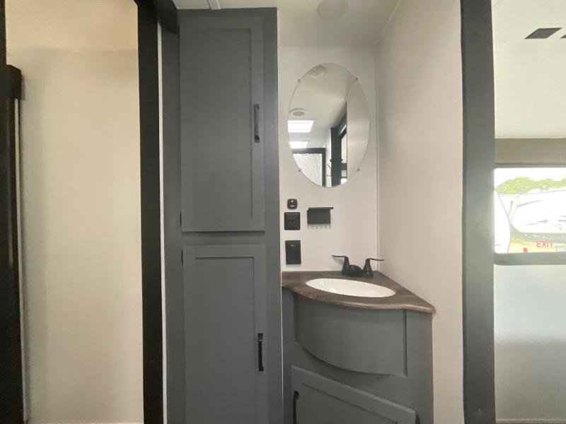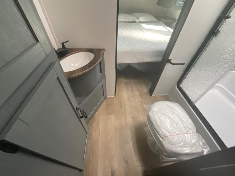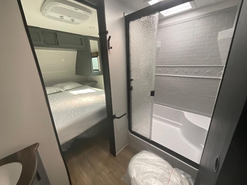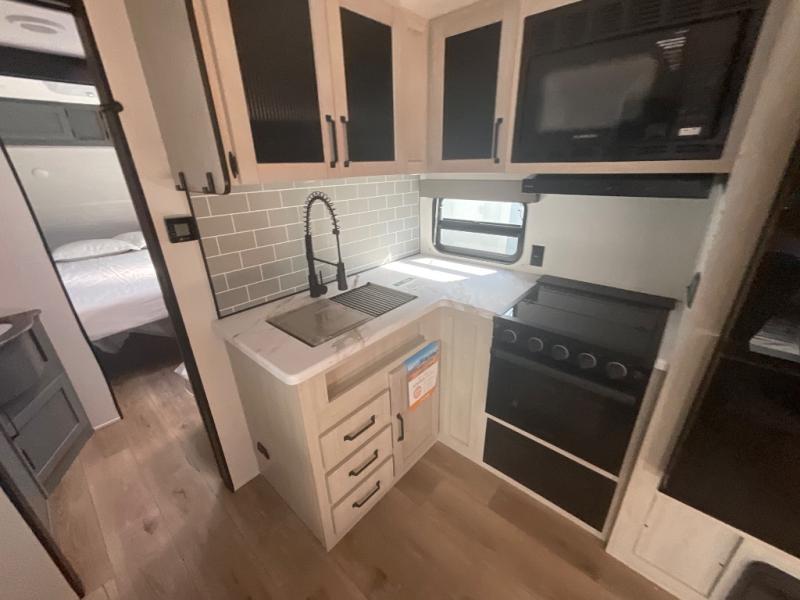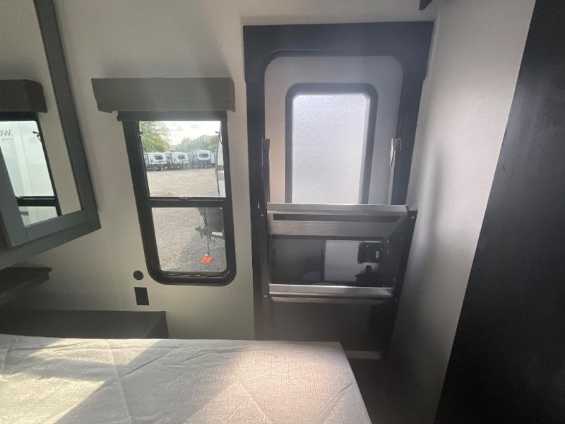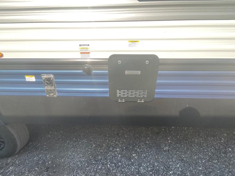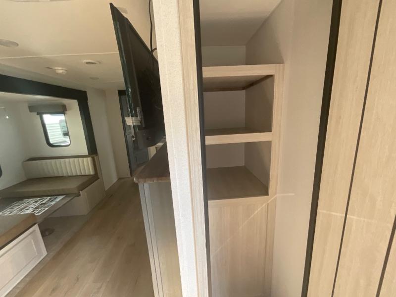 This travel trailer is perfect for camping with a larger group of friends or if you have older kids since there are two private bunkrooms! Each room includes a bunk bed and storage space for clothes, shoes, and more. You'll enjoy your own space up front in the master bedroom that includes a queen bed, dual shirt closets, and one of the dual entry doors to the unit for added convenience. Everyone can come together in the combined living area and kitchen that includes a large slide out with a sofa and booth dinette, plus there is a fireplace to make this space feel more like home. And a full kitchen lets you create home-cooked meals each day.