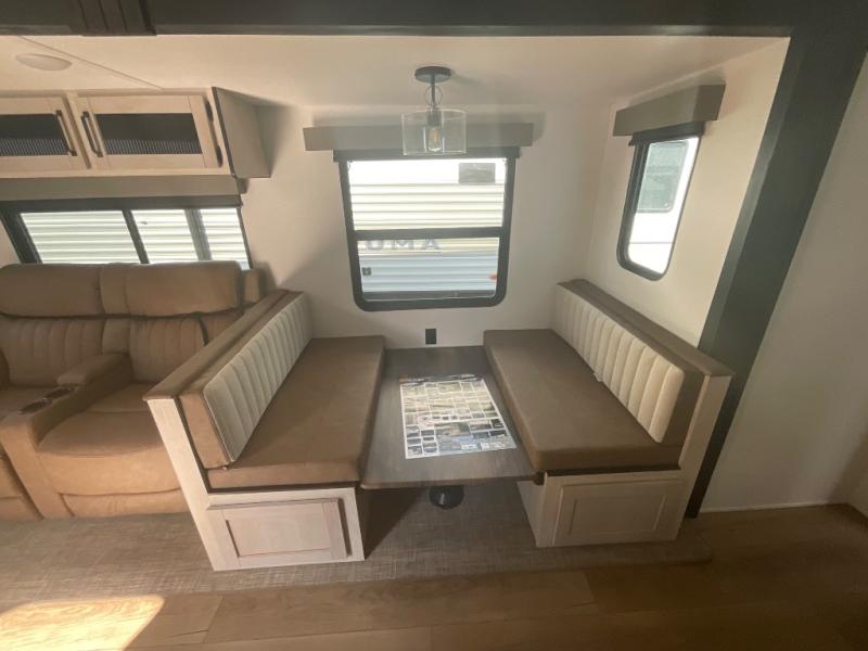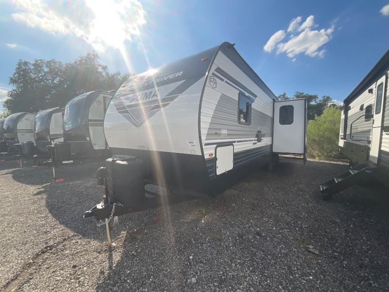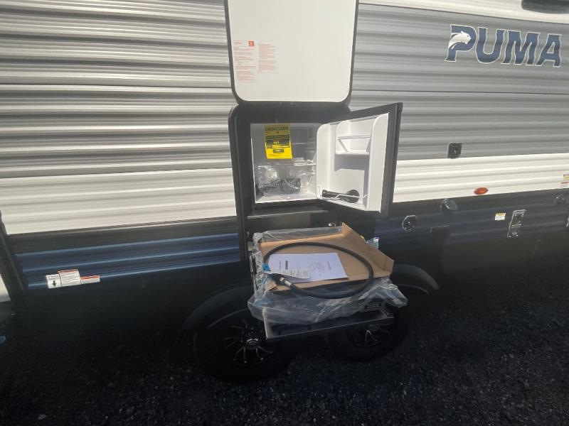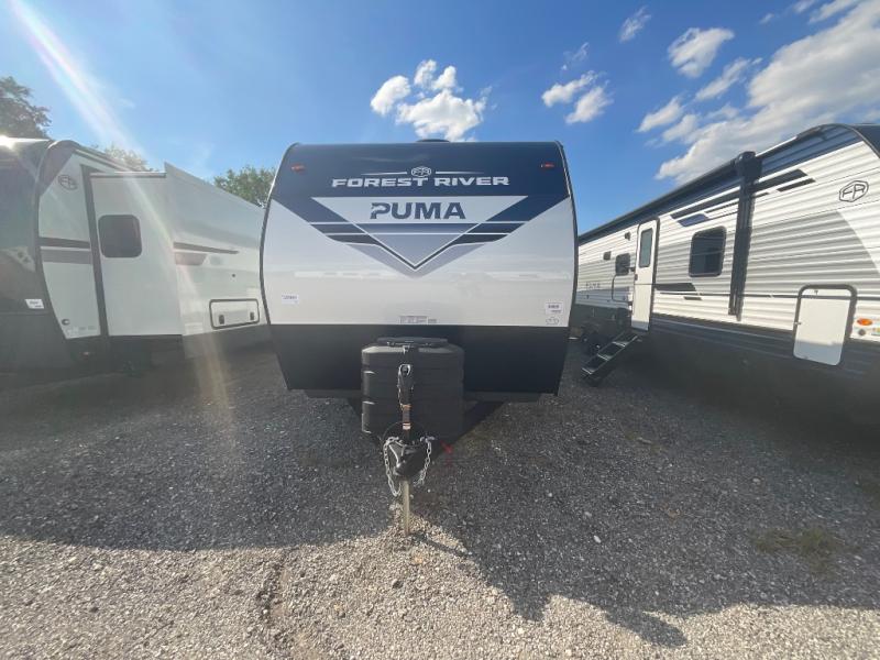 If you're looking for family-fun adventures, then you need one of these Forest River Puma travel trailers! They are built rugged, easy to tow, and jam packed with features. The Darco wrapped underbelly will help protect your unit, and the roof and side mount solar prep gives you the option to add off-grid power. Inside, the Congoleum linoleum will be easy to keep clean, and the night roller shades will provide privacy when it's time to turn in. You'll also enjoy an electric awning with an LED light strip plus an AM/FM/Bluetooth stereo and two outside speakers to keep the party going!