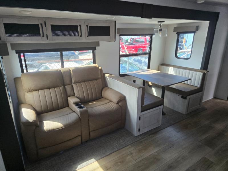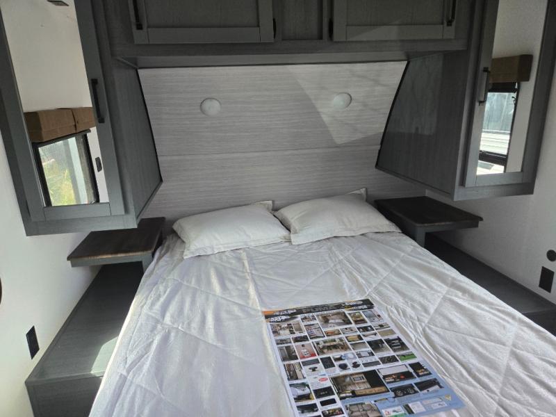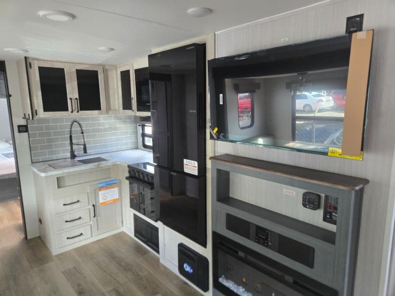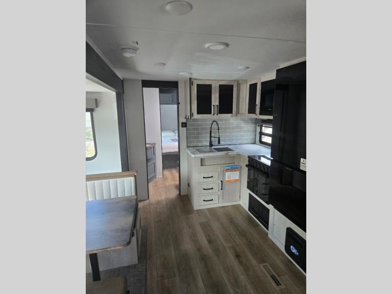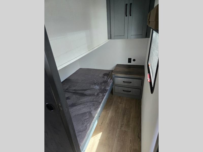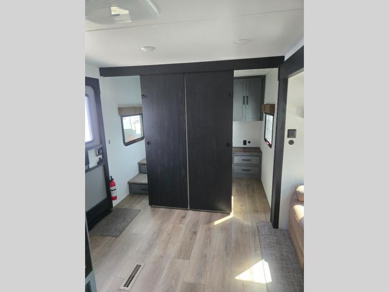 This travel trailer is perfect for camping with a larger group of friends or if you have older kids since there are two private bunkrooms! Each room includes a bunk bed and storage space for clothes, shoes, and more. You'll enjoy your own space up front in the master bedroom that includes a queen bed, dual shirt closets, and one of the dual entry doors to the unit for added convenience. Everyone can come together in the combined living area and kitchen that includes a large slide out with a sofa and booth dinette, plus there is a fireplace to make this space feel more like home. A full kitchen inside lets you create home-cooked meals each day, and you can choose to add the optional micro kitchen with a griddle for a pancake breakfast outdoors!