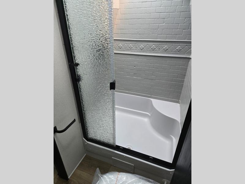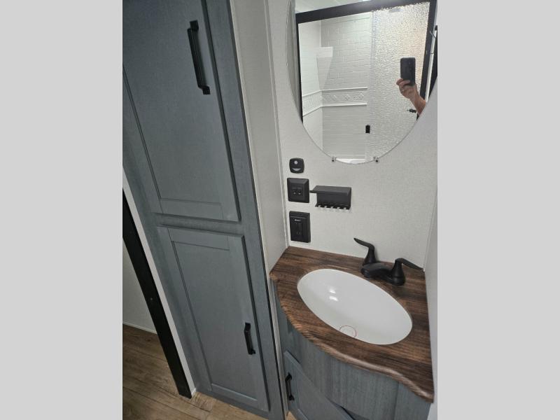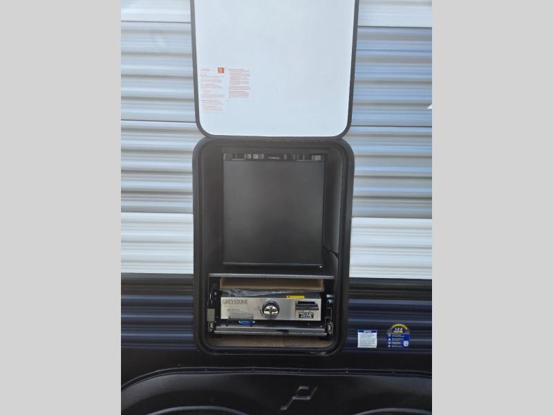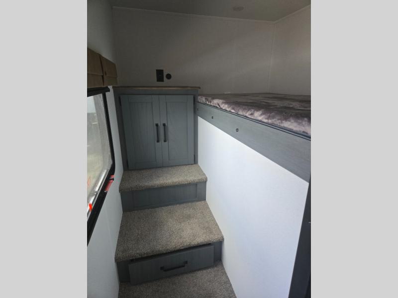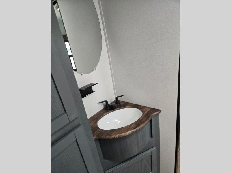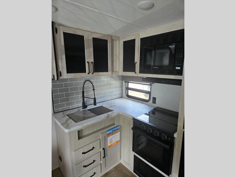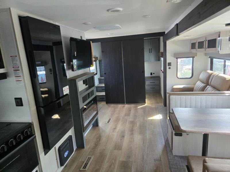This travel trailer is perfect for camping with a larger group of friends or if you have older kids since there are two private bunkrooms! Each room includes a bunk bed and storage space for clothes, shoes, and more. You'll enjoy your own space up front in the master bedroom that includes a queen bed, dual shirt closets, and one of the dual entry doors to the unit for added convenience. Everyone can come together in the combined living area and kitchen that includes a large slide out with a sofa and booth dinette, plus there is a fireplace to make this space feel more like home. A full kitchen inside lets you create home-cooked meals each day, and you can choose to add the optional micro kitchen with a griddle for a pancake breakfast outdoors!