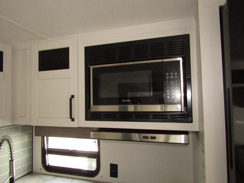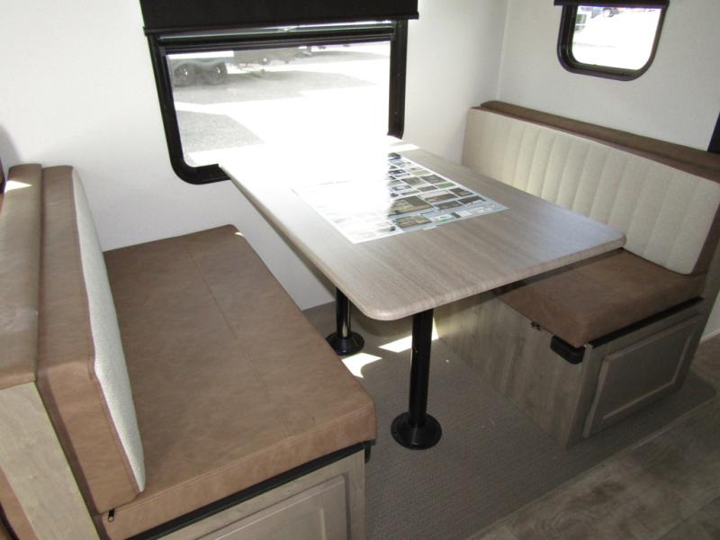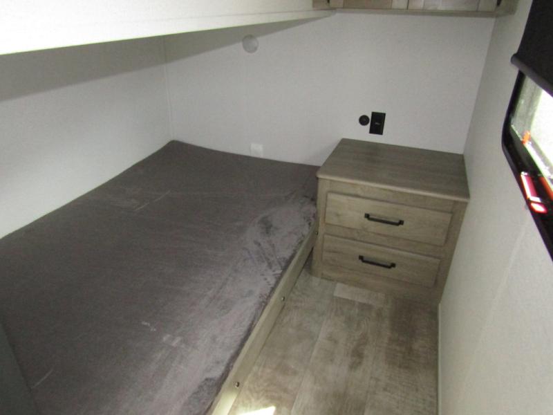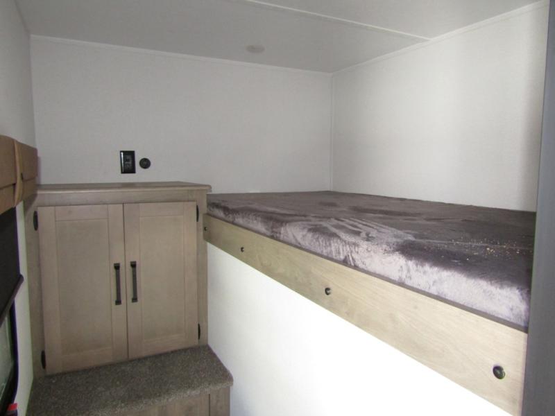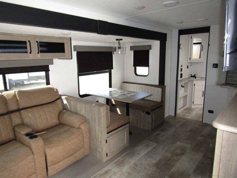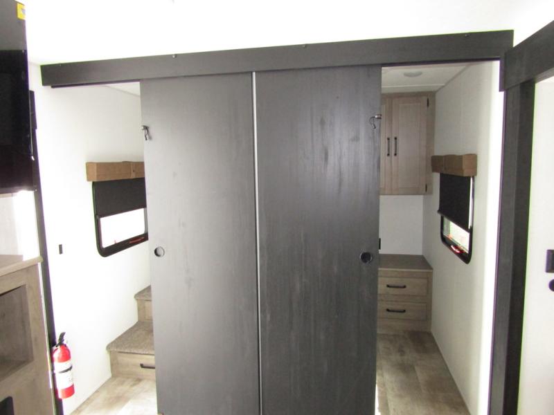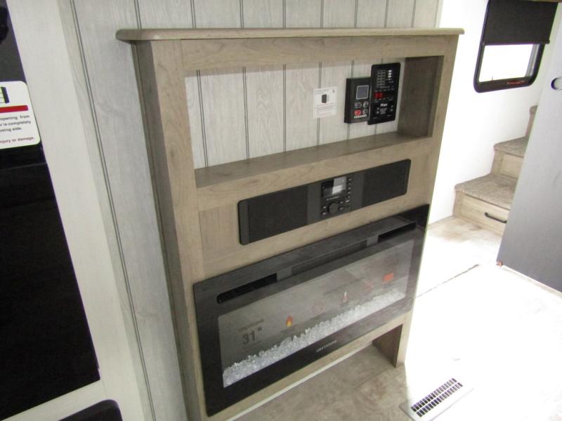 This travel trailer is perfect for camping with a larger group of friends or if you have older kids since there are two private bunkrooms! Each room includes a bunk bed and storage space for clothes, shoes, and more. You'll enjoy your own space up front in the master bedroom that includes a queen bed, dual shirt closets, and one of the dual entry doors to the unit for added convenience. Everyone can come together in the combined living area and kitchen that includes a large slide out with a sofa and booth dinette, plus there is a fireplace to make this space feel more like home. A full kitchen inside lets you create home-cooked meals each day, and you can choose to add the optional micro kitchen with a griddle for a pancake breakfast outdoors!