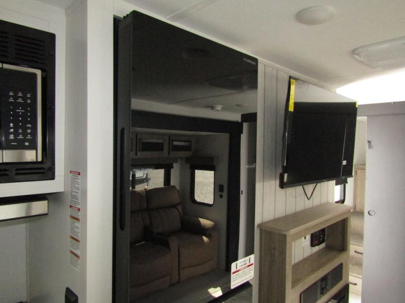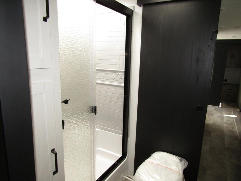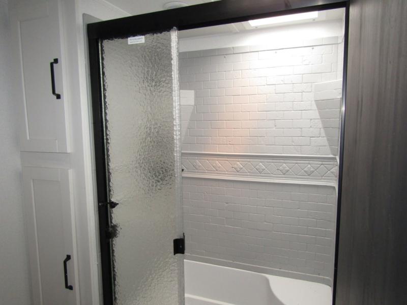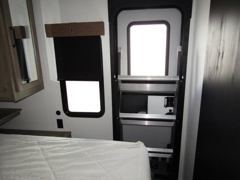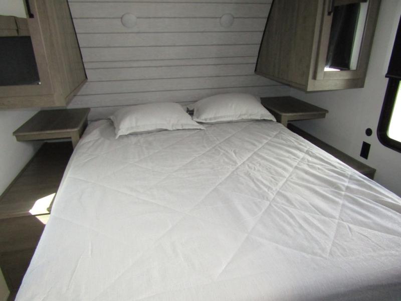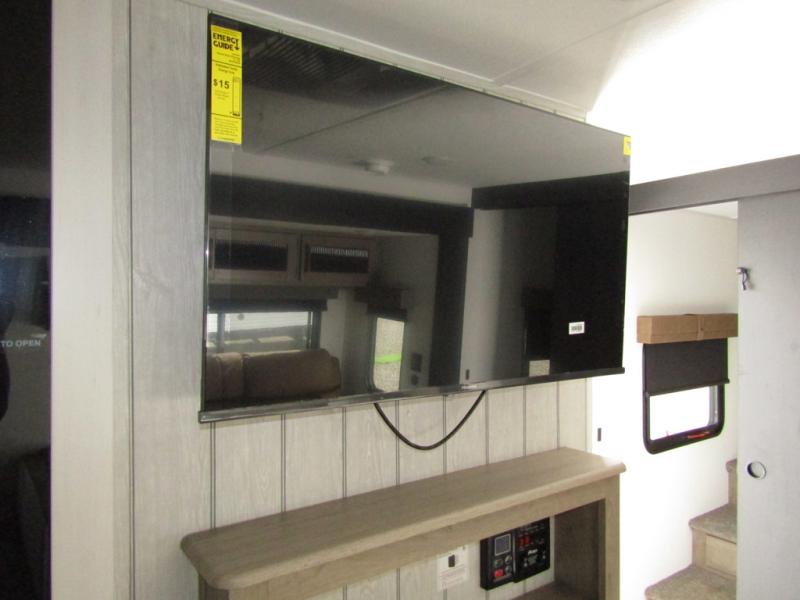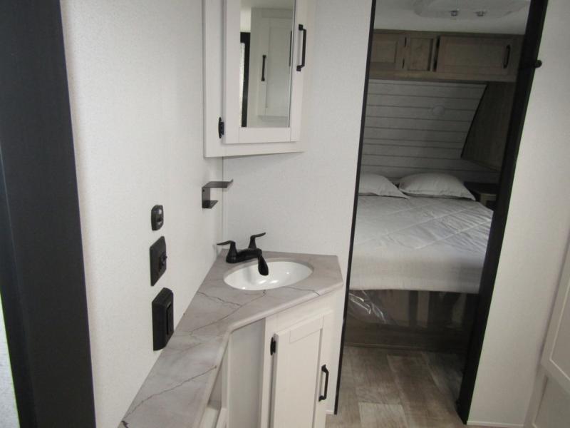 This travel trailer is perfect for camping with a larger group of friends or if you have older kids since there are two private bunkrooms! Each room includes a bunk bed and storage space for clothes, shoes, and more. You'll enjoy your own space up front in the master bedroom that includes a queen bed, dual shirt closets, and one of the dual entry doors to the unit for added convenience. Everyone can come together in the combined living area and kitchen that includes a large slide out with a sofa and booth dinette, plus there is a fireplace to make this space feel more like home. A full kitchen inside lets you create home-cooked meals each day, and you can choose to add the optional micro kitchen with a griddle for a pancake breakfast outdoors!