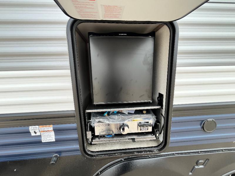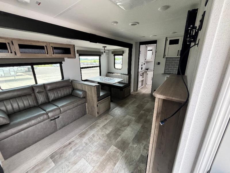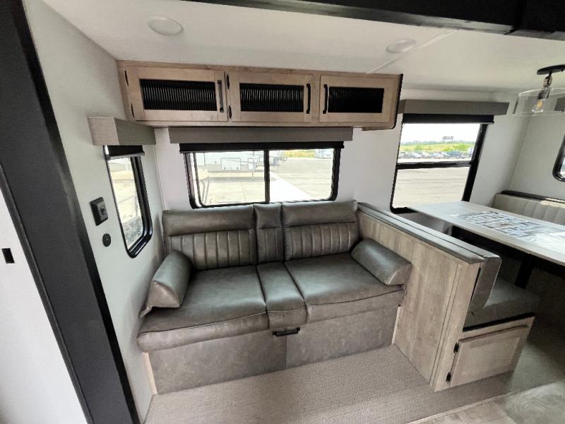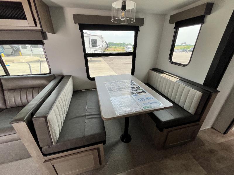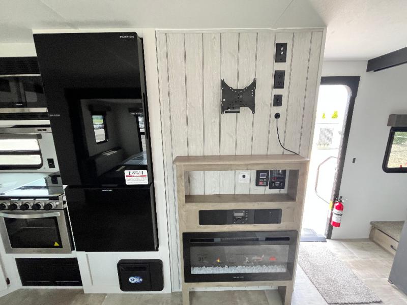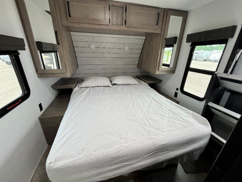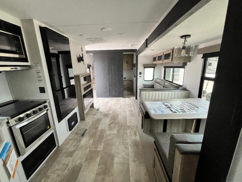This travel trailer is perfect for camping with a larger group of friends or if you have older kids since there are two private bunkrooms! Each room includes a bunk bed and storage space for clothes, shoes, and more. You'll enjoy your own space up front in the master bedroom that includes a queen bed, dual shirt closets, and one of the dual entry doors to the unit for added convenience. Everyone can come together in the combined living area and kitchen that includes a large slide out with a sofa and booth dinette, plus there is a fireplace to make this space feel more like home. A full kitchen inside lets you create home-cooked meals each day, and you can choose to add the optional micro kitchen with a griddle for a pancake breakfast outdoors!