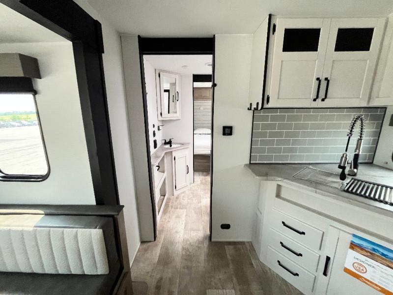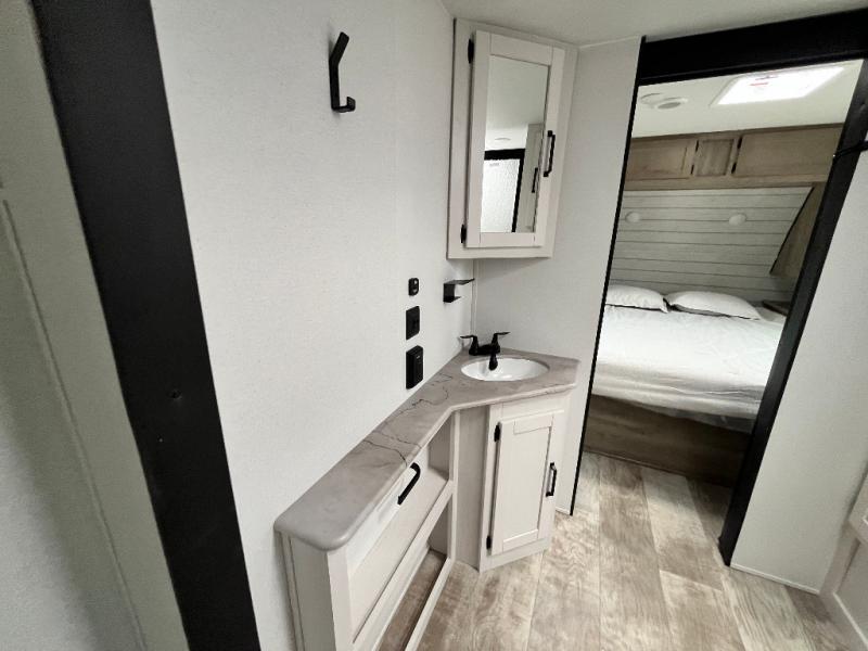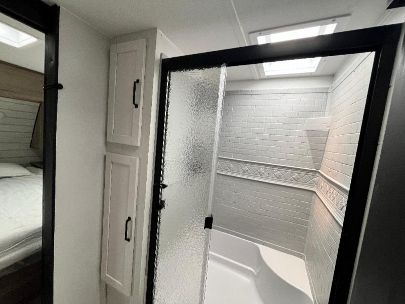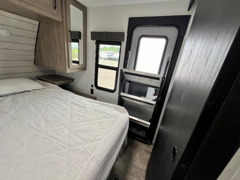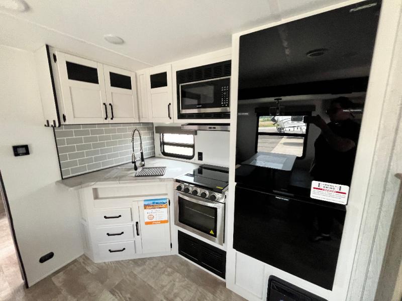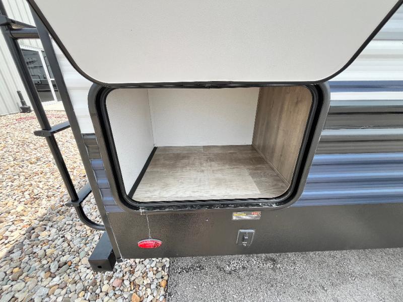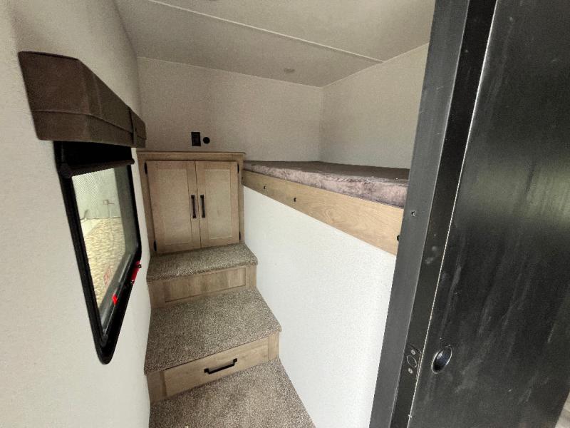 This travel trailer is perfect for camping with a larger group of friends or if you have older kids since there are two private bunkrooms! Each room includes a bunk bed and storage space for clothes, shoes, and more. You'll enjoy your own space up front in the master bedroom that includes a queen bed, dual shirt closets, and one of the dual entry doors to the unit for added convenience. Everyone can come together in the combined living area and kitchen that includes a large slide out with a sofa and booth dinette, plus there is a fireplace to make this space feel more like home. A full kitchen inside lets you create home-cooked meals each day, and you can choose to add the optional micro kitchen with a griddle for a pancake breakfast outdoors!