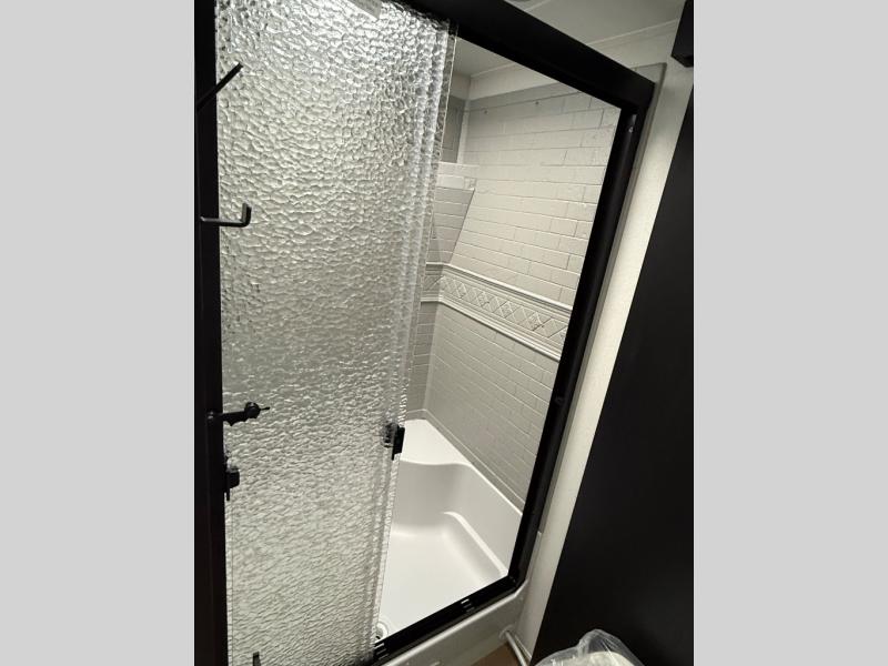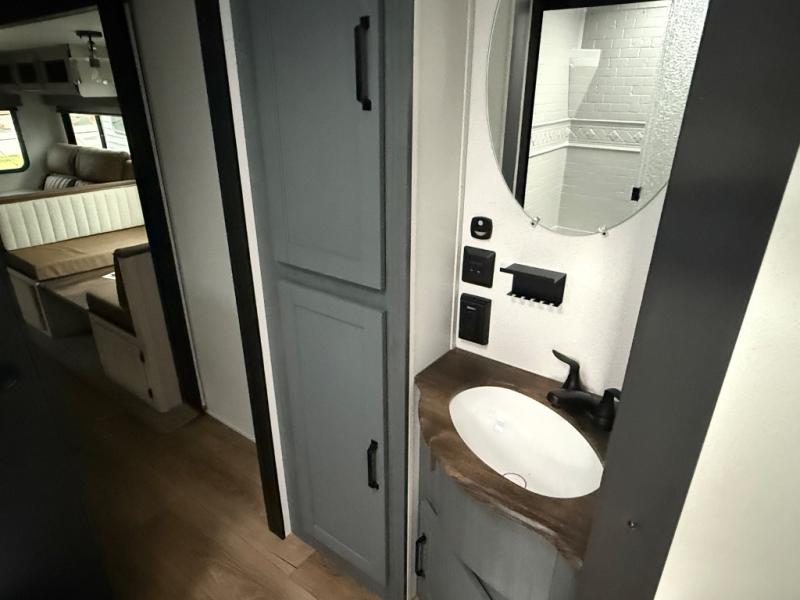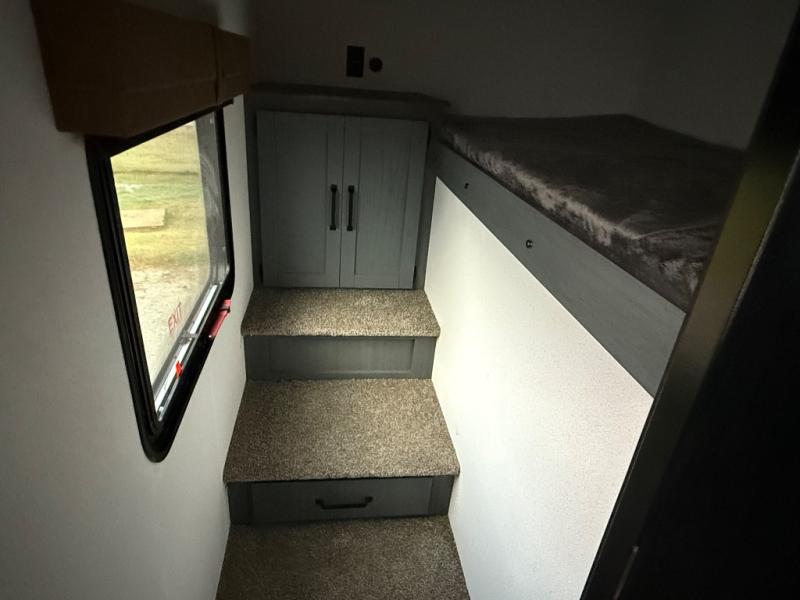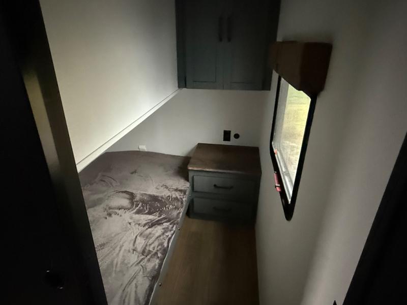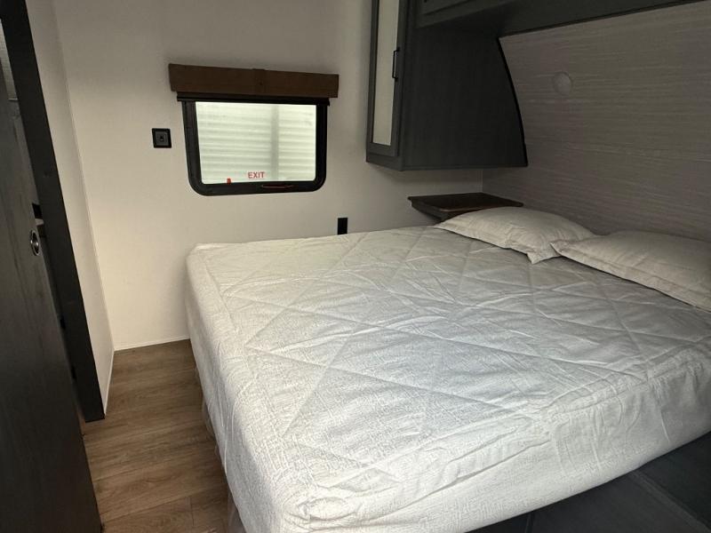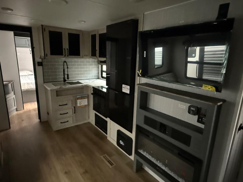This travel trailer is perfect for camping with a larger group of friends or if you have older kids since there are two private bunkrooms! Each room includes a bunk bed and storage space for clothes, shoes, and more. You'll enjoy your own space up front in the master bedroom that includes a queen bed, dual shirt closets, and one of the dual entry doors to the unit for added convenience. Everyone can come together in the combined living area and kitchen that includes a large slide out with a sofa and booth dinette, plus there is a fireplace to make this space feel more like home. And a full kitchen lets you create home-cooked meals each day.