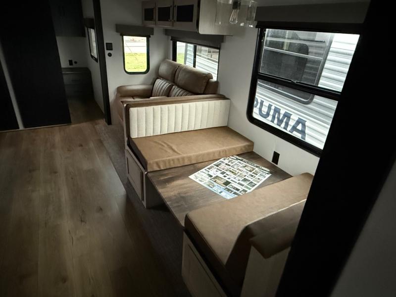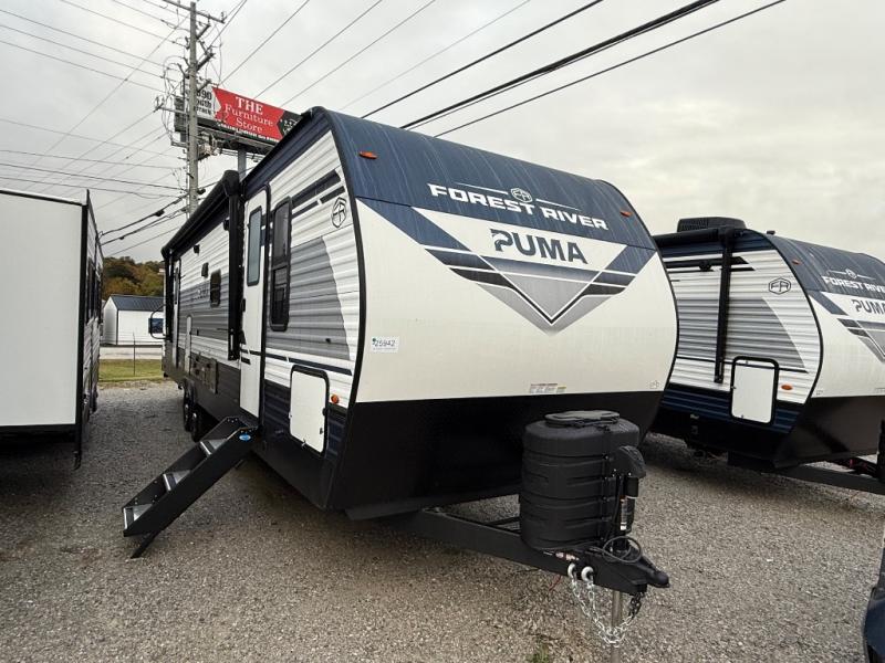 If you're looking for family-fun adventures, then you need one of these Forest River Puma travel trailers! They are built rugged, easy to tow, and jam packed with features. The Darco wrapped underbelly will help protect your unit, and the roof and side mount solar prep gives you the option to add off-grid power. Inside, the Congoleum linoleum will be easy to keep clean, and the night roller shades will provide privacy when it's time to turn in. You'll also enjoy an electric awning with an LED light strip plus an AM/FM/Bluetooth stereo and two outside speakers to keep the party going!
