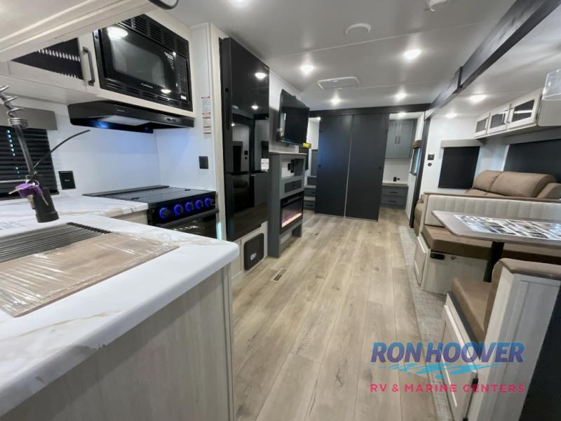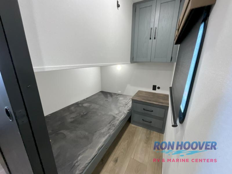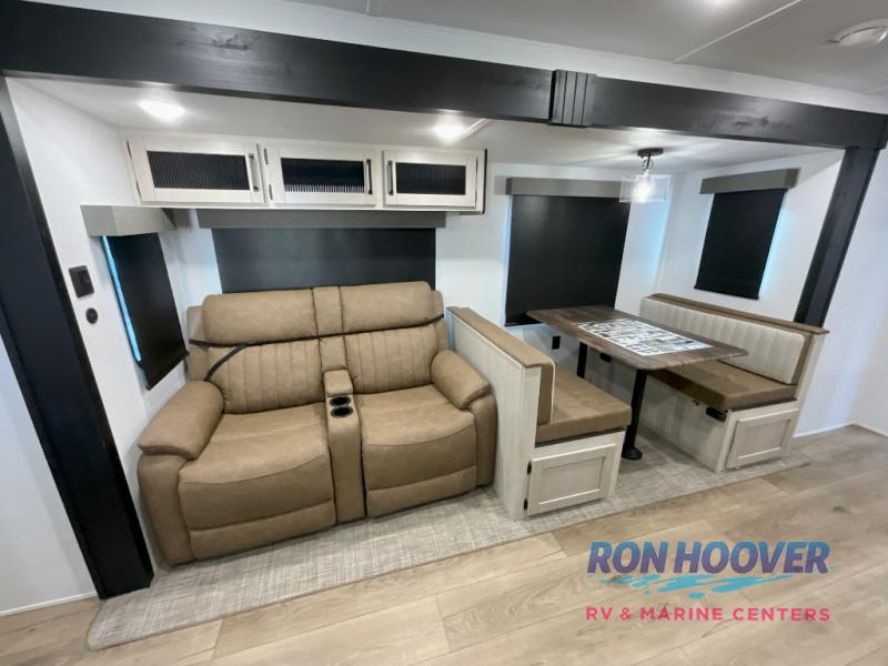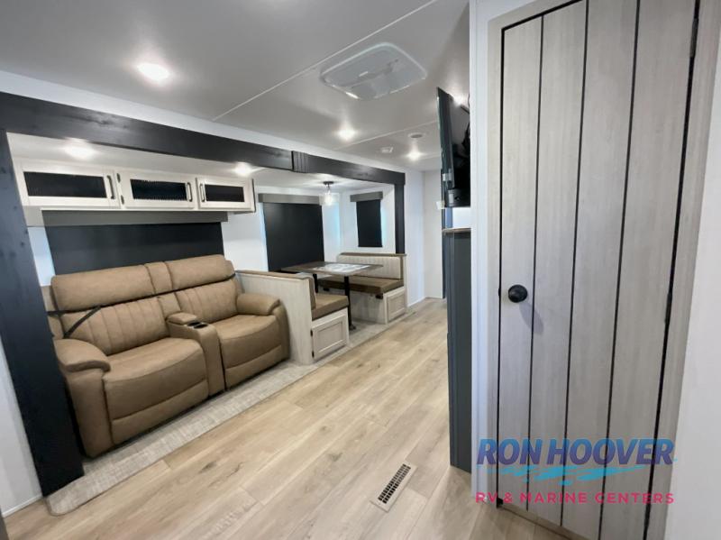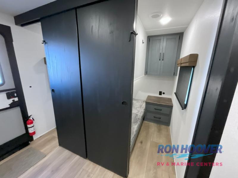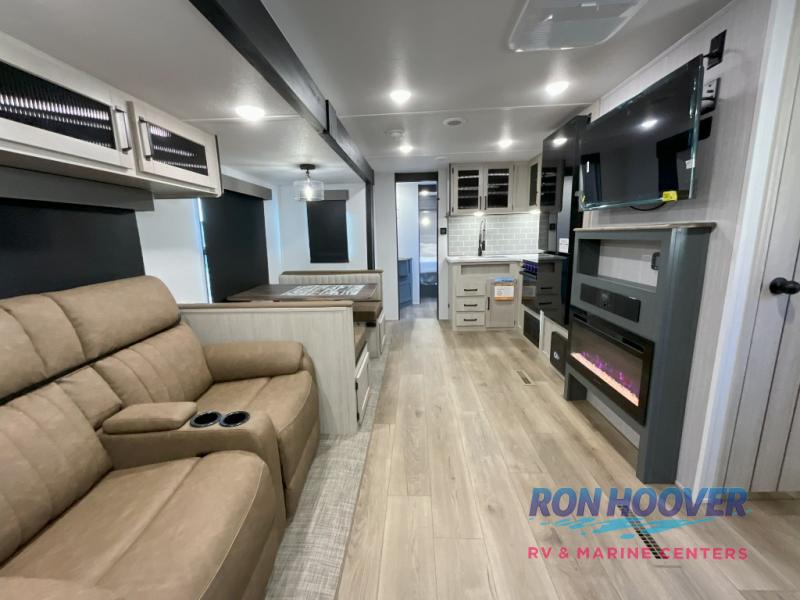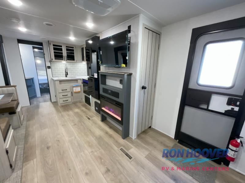 This travel trailer is perfect for camping with a larger group of friends or if you have older kids since there are two private bunkrooms! Each room includes a bunk bed and storage space for clothes, shoes, and more. You'll enjoy your own space up front in the master bedroom that includes a queen bed, dual shirt closets, and one of the dual entry doors to the unit for added convenience. Everyone can come together in the combined living area and kitchen that includes a large slide out with a sofa and booth dinette, plus there is a fireplace to make this space feel more like home. A full kitchen inside lets you create home-cooked meals each day, and you can choose to add the optional micro kitchen with a griddle for a pancake breakfast outdoors!