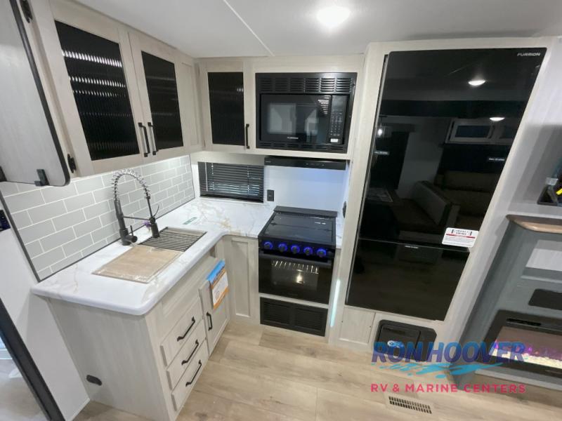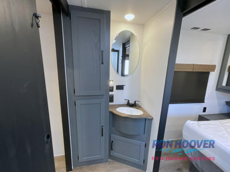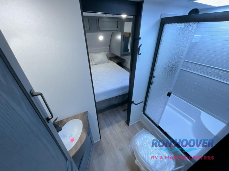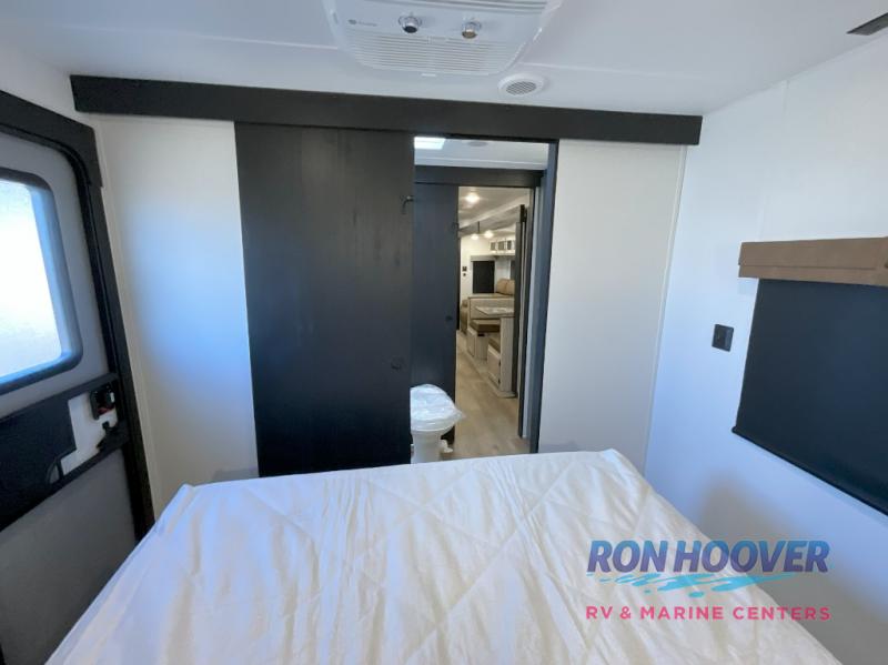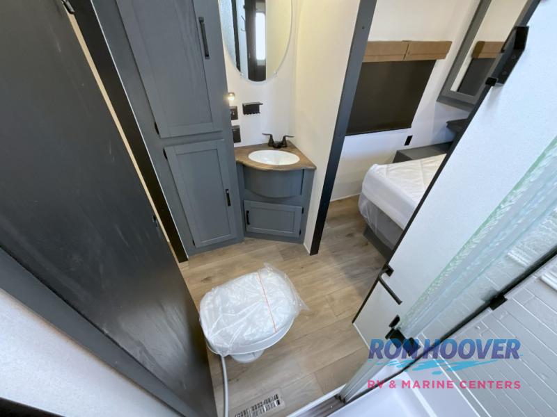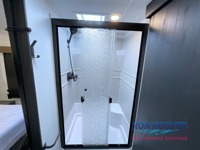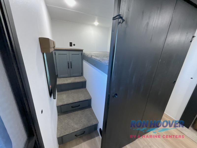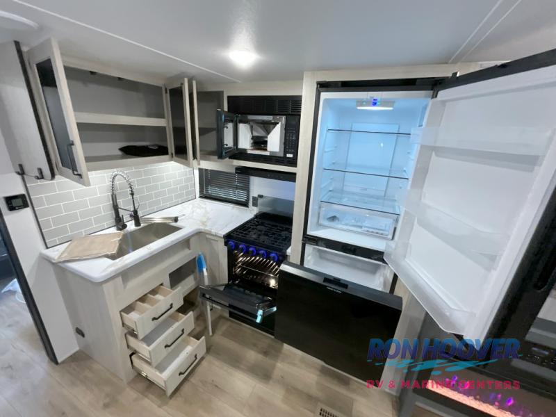 This travel trailer is perfect for camping with a larger group of friends or if you have older kids since there are two private bunkrooms! Each room includes a bunk bed and storage space for clothes, shoes, and more. You'll enjoy your own space up front in the master bedroom that includes a queen bed, dual shirt closets, and one of the dual entry doors to the unit for added convenience. Everyone can come together in the combined living area and kitchen that includes a large slide out with a sofa and booth dinette, plus there is a fireplace to make this space feel more like home. A full kitchen inside lets you create home-cooked meals each day, and you can choose to add the optional micro kitchen with a griddle for a pancake breakfast outdoors!