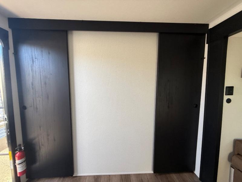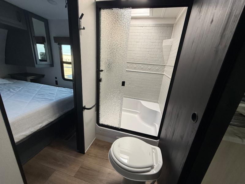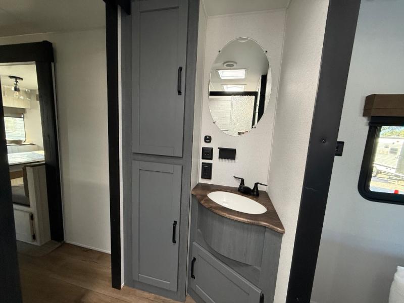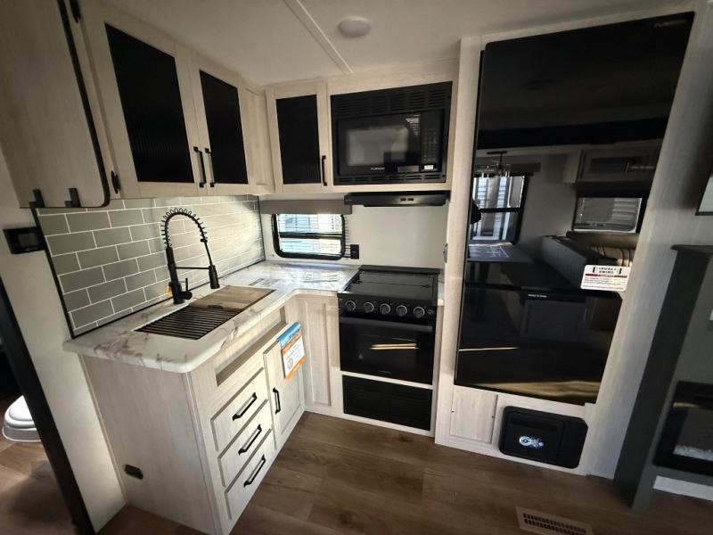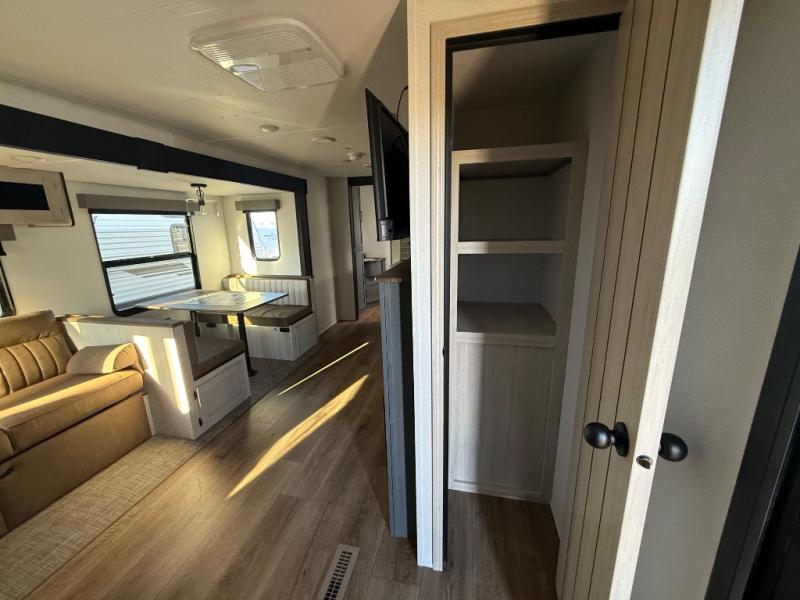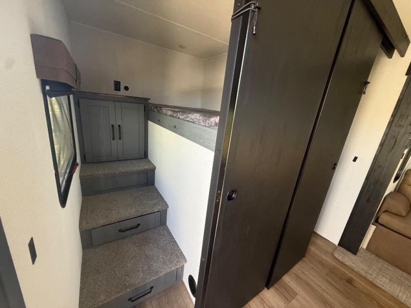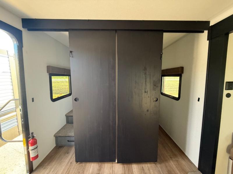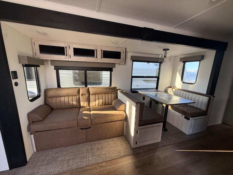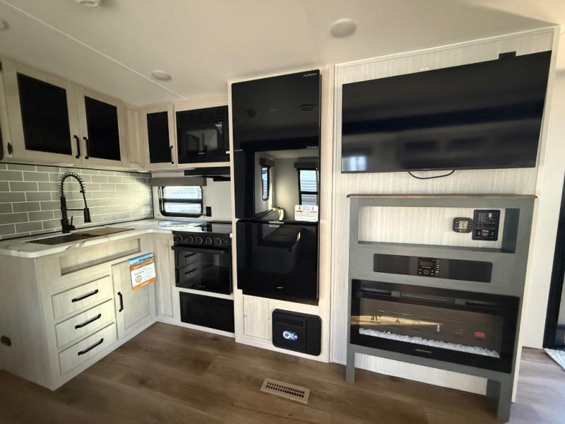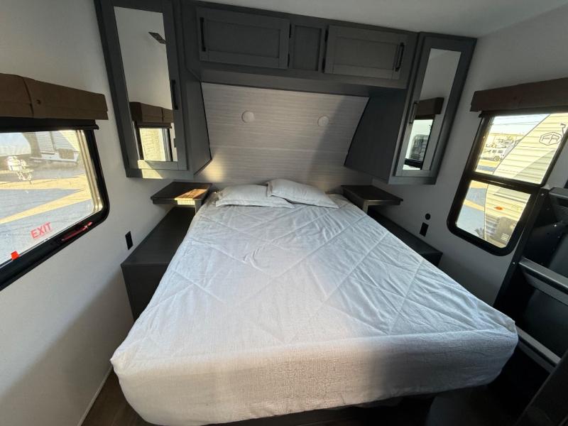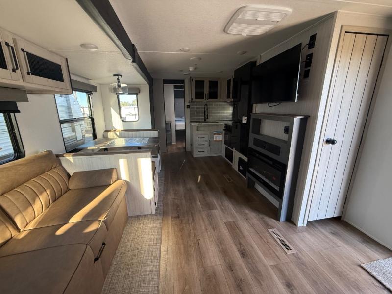 This travel trailer is perfect for camping with a larger group of friends or if you have older kids since there are two private bunkrooms! Each room includes a bunk bed and storage space for clothes, shoes, and more. You'll enjoy your own space up front in the master bedroom that includes a queen bed, dual shirt closets, and one of the dual entry doors to the unit for added convenience. Everyone can come together in the combined living area and kitchen that includes a large slide out with a sofa and booth dinette, plus there is a fireplace to make this space feel more like home. A full kitchen inside lets you create home-cooked meals each day, and you can choose to add the optional micro kitchen with a griddle for a pancake breakfast outdoors!