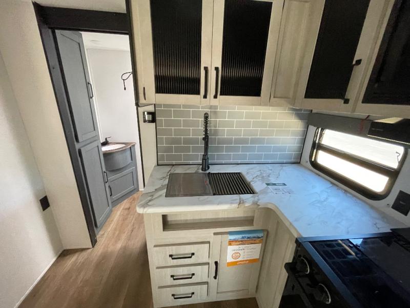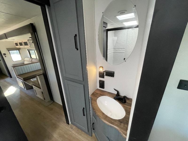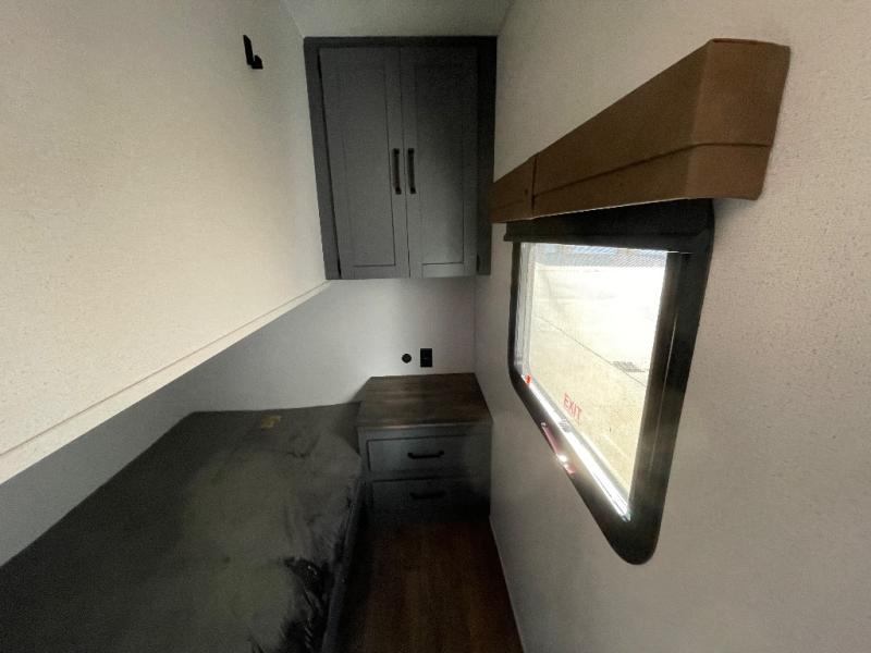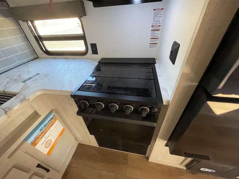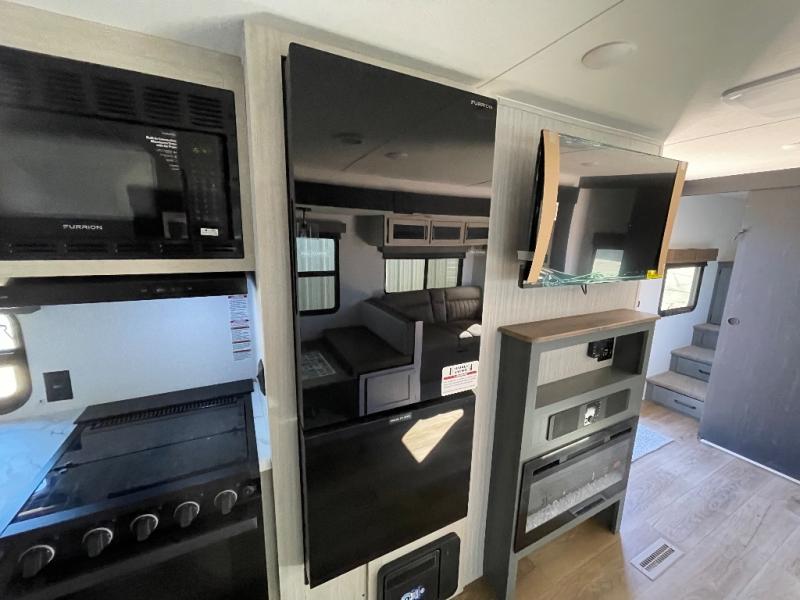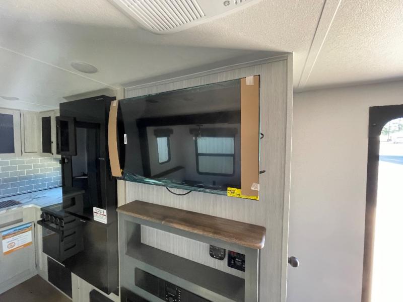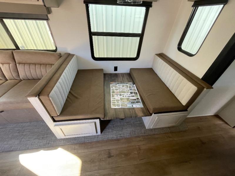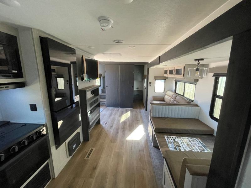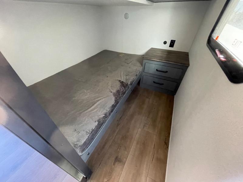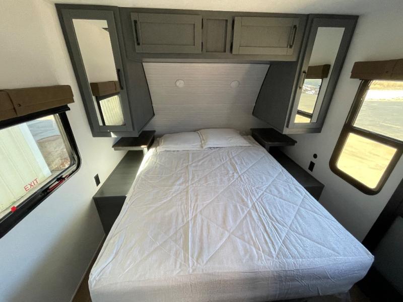 This travel trailer is perfect for camping with a larger group of friends or if you have older kids since there are two private bunkrooms! Each room includes a bunk bed and storage space for clothes, shoes, and more. You'll enjoy your own space up front in the master bedroom that includes a queen bed, dual shirt closets, and one of the dual entry doors to the unit for added convenience. Everyone can come together in the combined living area and kitchen that includes a large slide out with a sofa and booth dinette, plus there is a fireplace to make this space feel more like home. A full kitchen inside lets you create home-cooked meals each day, and you can choose to add the optional micro kitchen with a griddle for a pancake breakfast outdoors!