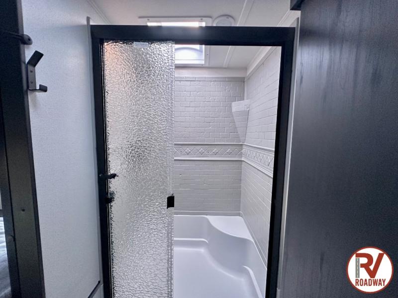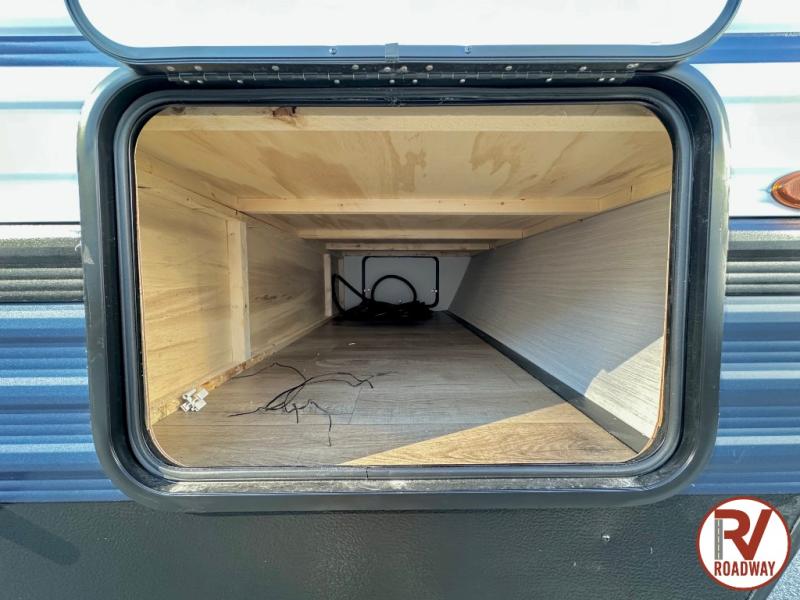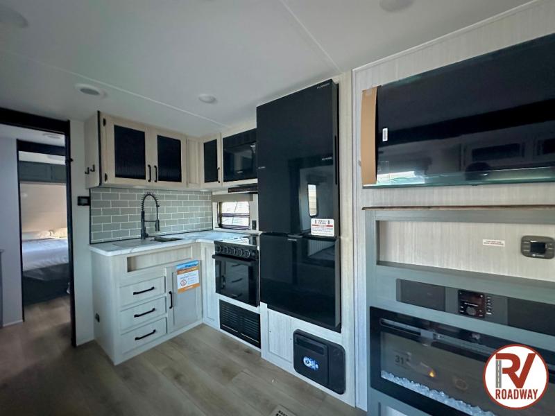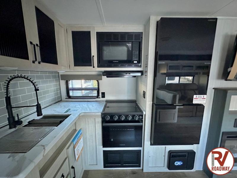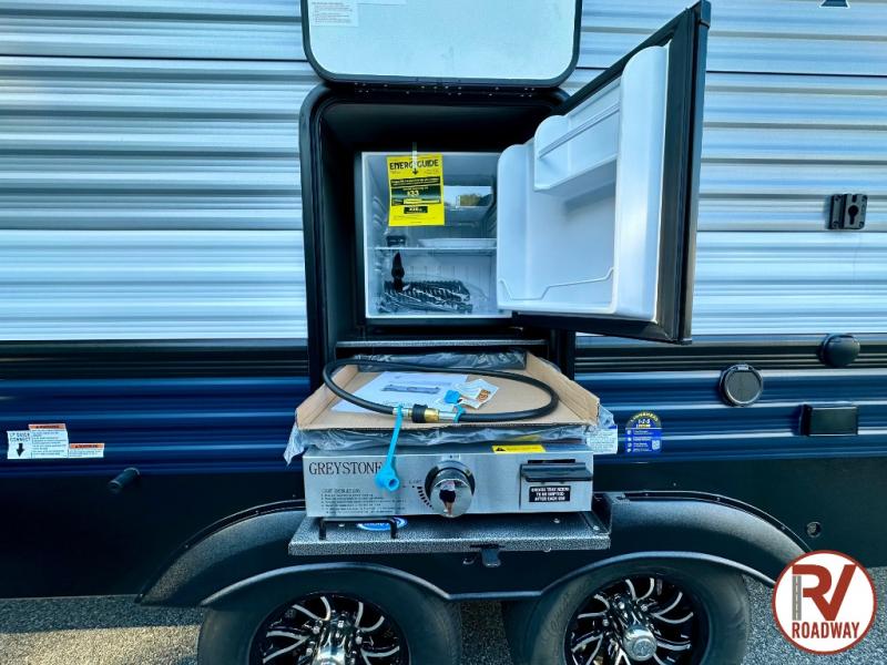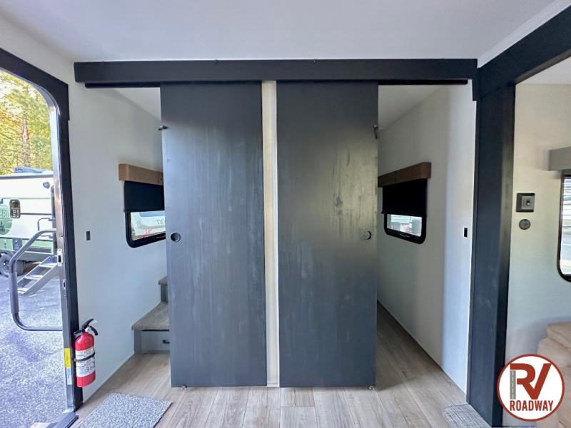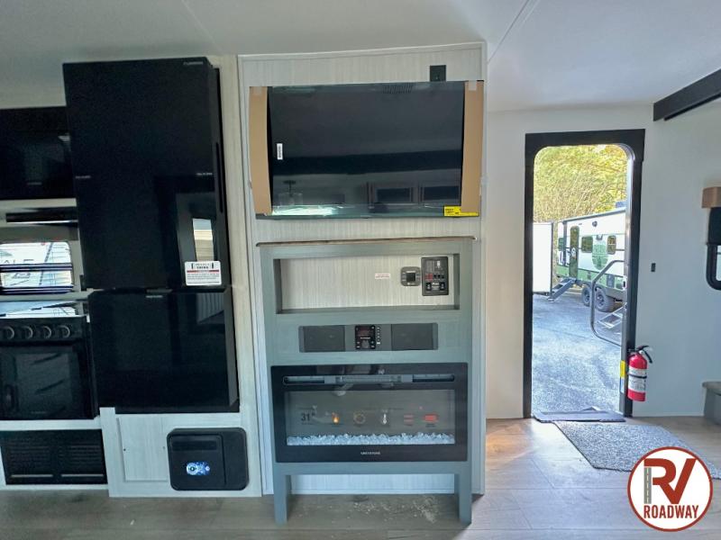 This travel trailer is perfect for camping with a larger group of friends or if you have older kids since there are two private bunkrooms! Each room includes a bunk bed and storage space for clothes, shoes, and more. You'll enjoy your own space up front in the master bedroom that includes a queen bed, dual shirt closets, and one of the dual entry doors to the unit for added convenience. Everyone can come together in the combined living area and kitchen that includes a large slide out with a sofa and booth dinette, plus there is a fireplace to make this space feel more like home. A full kitchen inside lets you create home-cooked meals each day, and you can choose to add the optional micro kitchen with a griddle for a pancake breakfast outdoors!