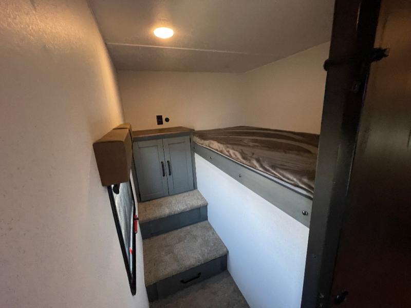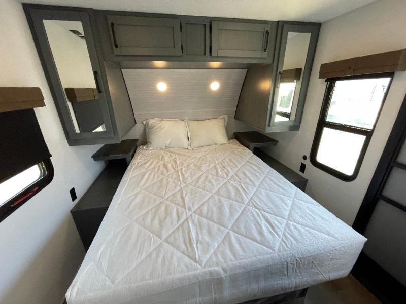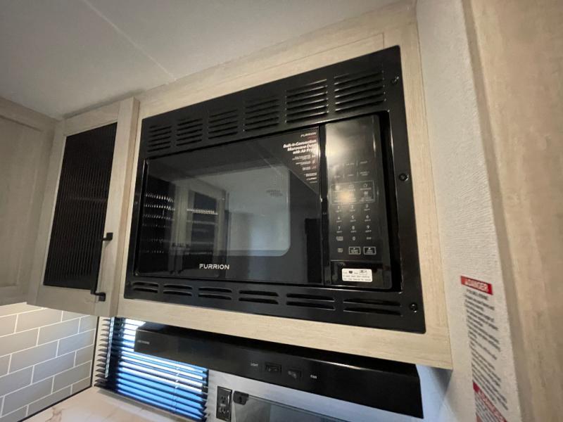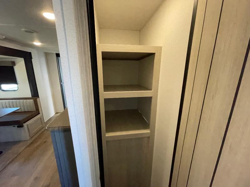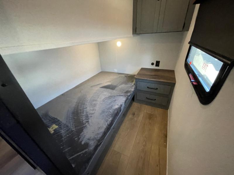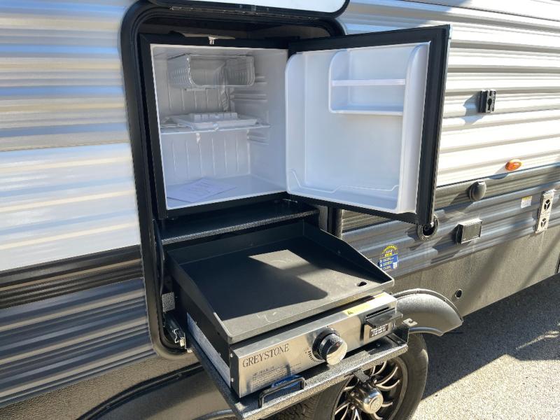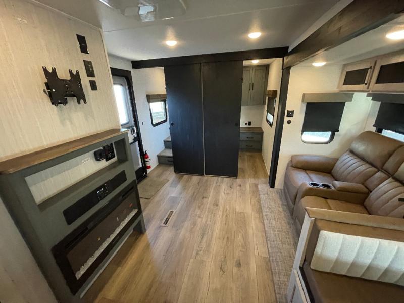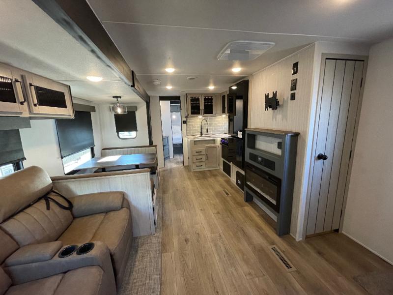 This travel trailer is perfect for camping with a larger group of friends or if you have older kids since there are two private bunkrooms! Each room includes a bunk bed and storage space for clothes, shoes, and more. You'll enjoy your own space up front in the master bedroom that includes a queen bed, dual shirt closets, and one of the dual entry doors to the unit for added convenience. Everyone can come together in the combined living area and kitchen that includes a large slide out with a sofa and booth dinette, plus there is a fireplace to make this space feel more like home. A full kitchen inside lets you create home-cooked meals each day, and you can choose to add the optional micro kitchen with a griddle for a pancake breakfast outdoors!