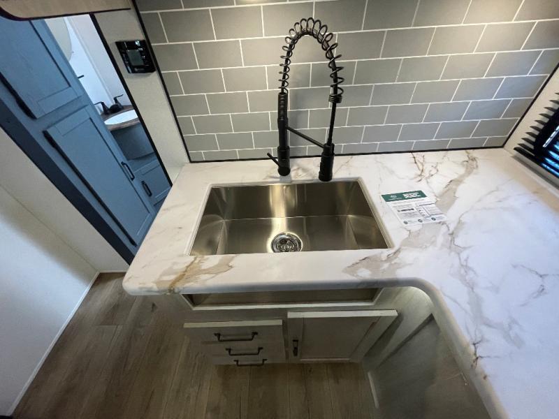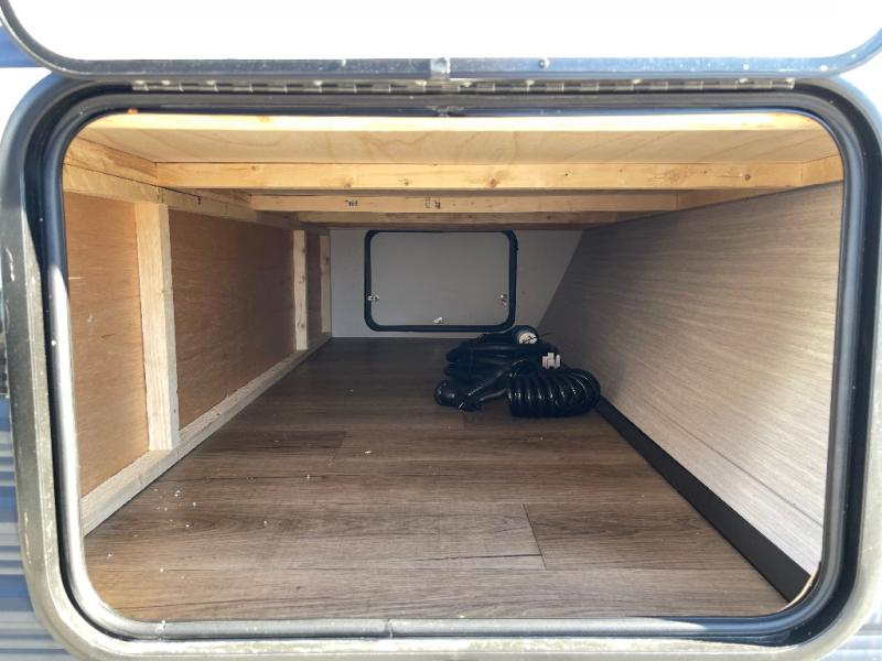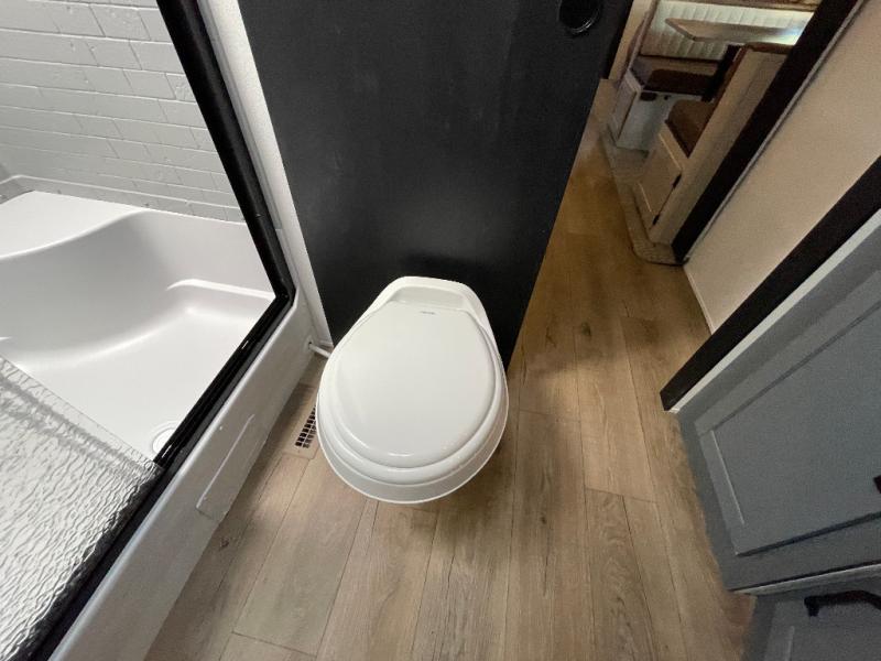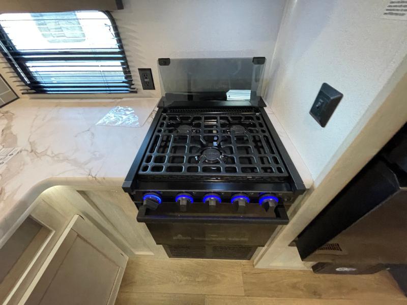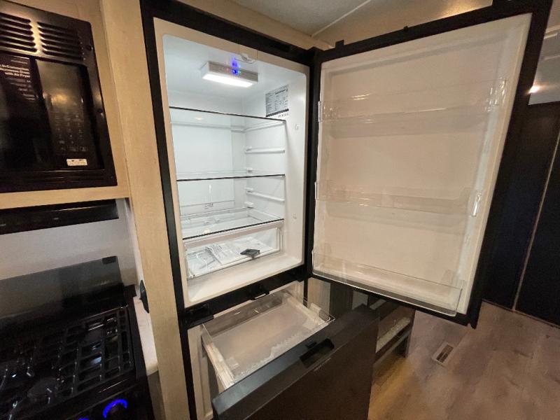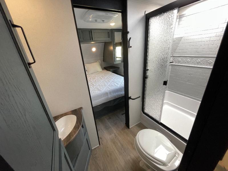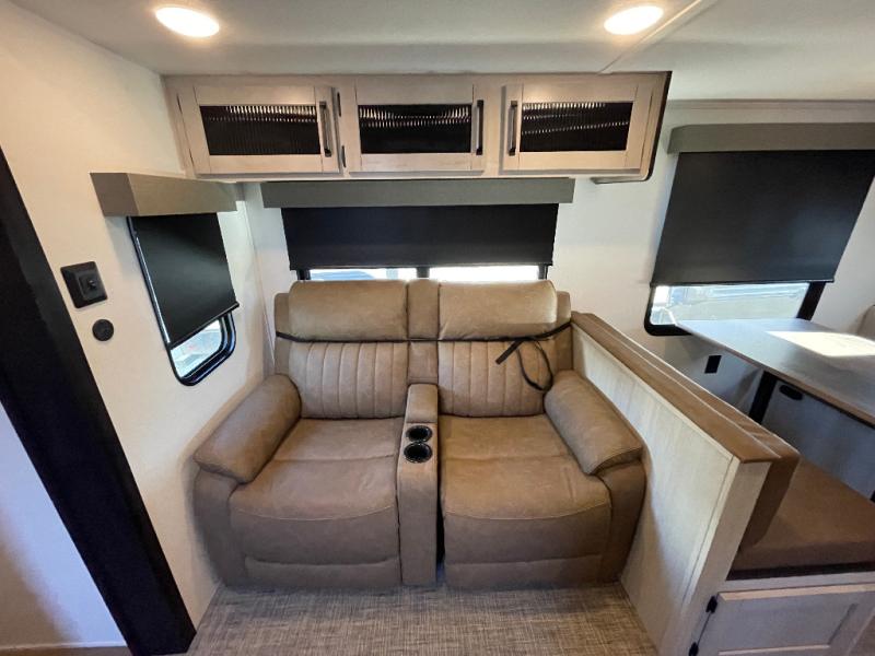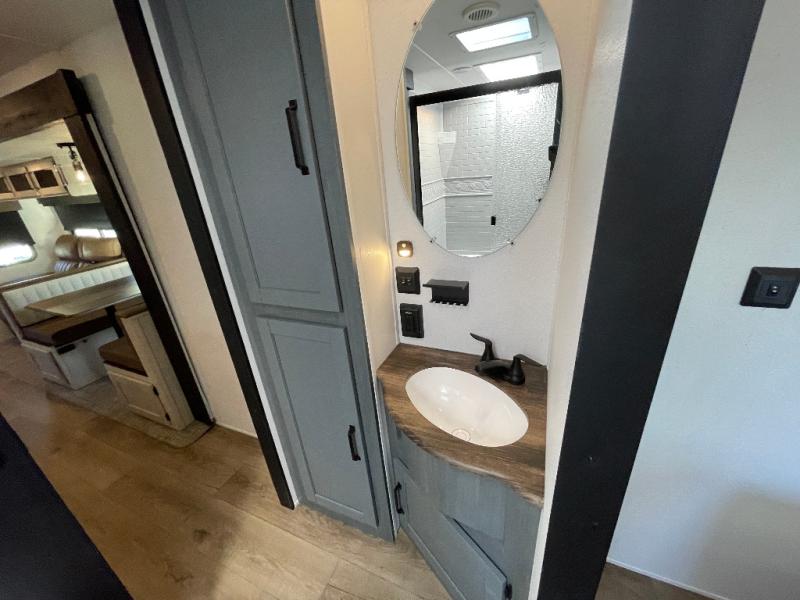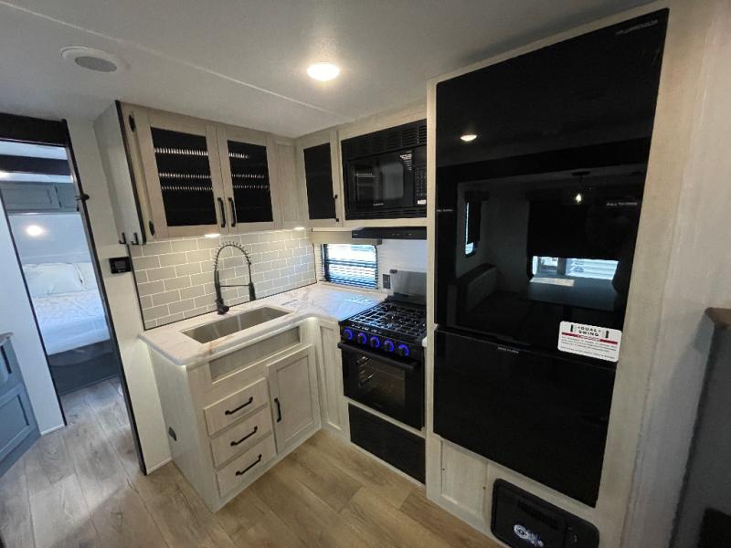 This travel trailer is perfect for camping with a larger group of friends or if you have older kids since there are two private bunkrooms! Each room includes a bunk bed and storage space for clothes, shoes, and more. You'll enjoy your own space up front in the master bedroom that includes a queen bed, dual shirt closets, and one of the dual entry doors to the unit for added convenience. Everyone can come together in the combined living area and kitchen that includes a large slide out with a sofa and booth dinette, plus there is a fireplace to make this space feel more like home. A full kitchen inside lets you create home-cooked meals each day, and you can choose to add the optional micro kitchen with a griddle for a pancake breakfast outdoors!