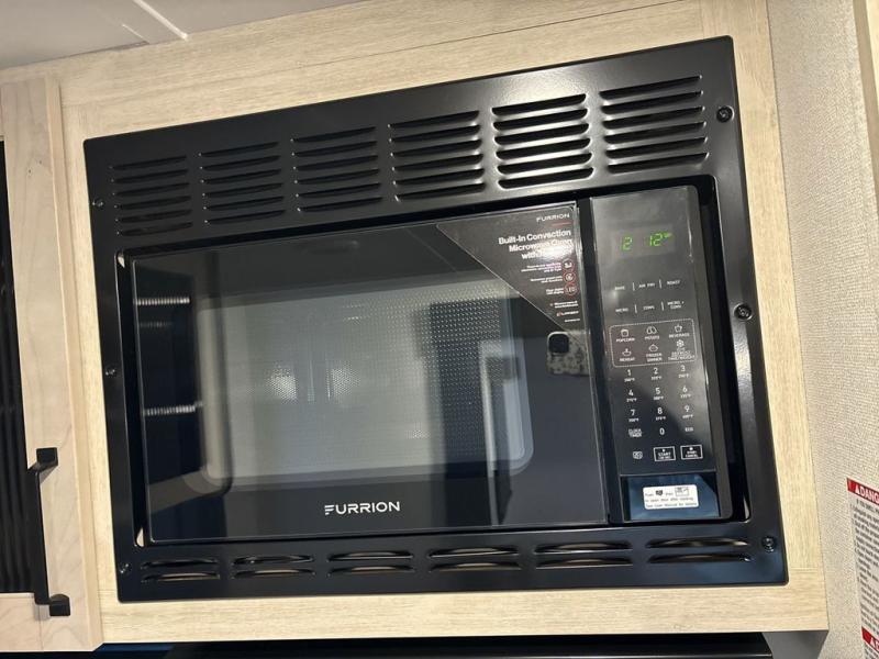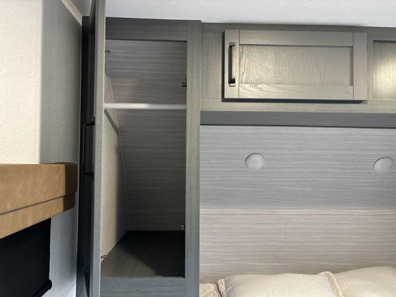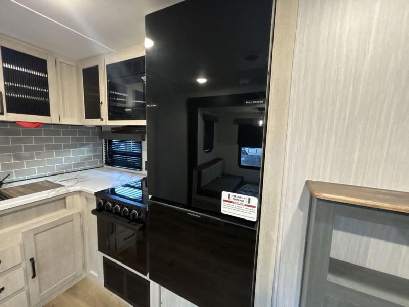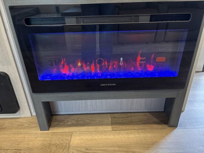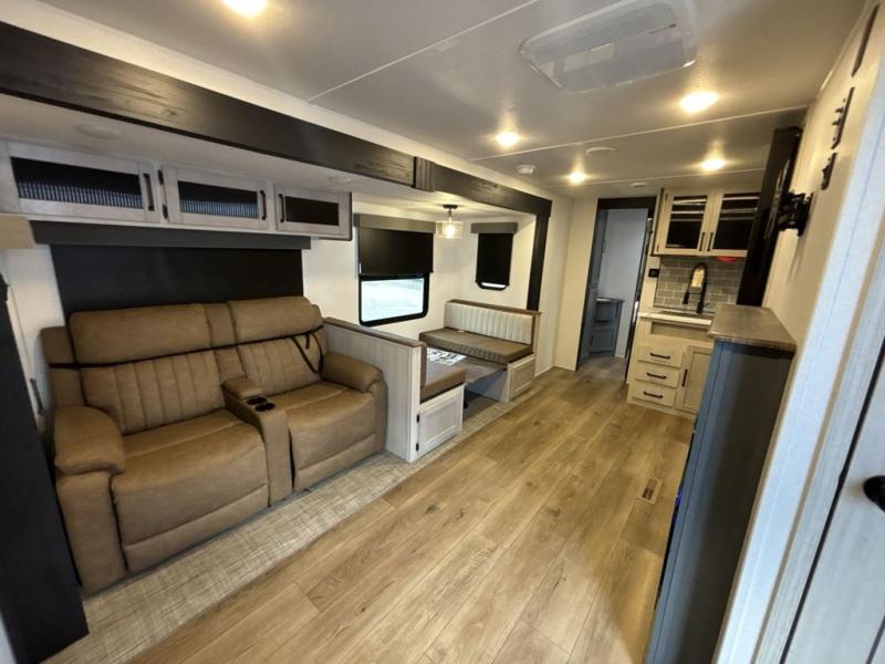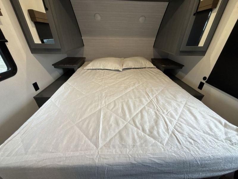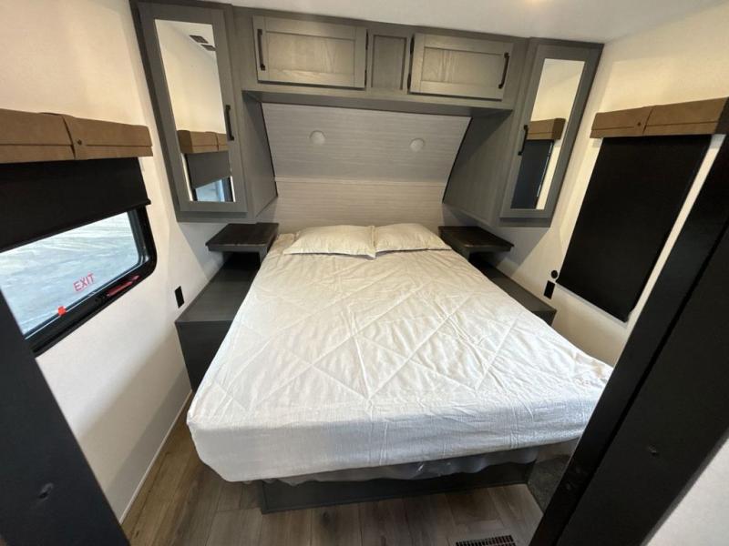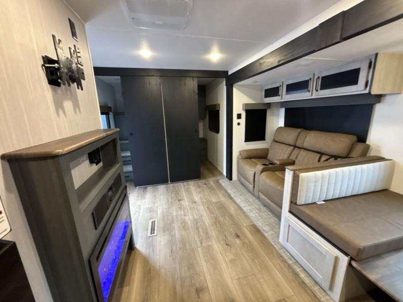 This travel trailer is perfect for camping with a larger group of friends or if you have older kids since there are two private bunkrooms! Each room includes a bunk bed and storage space for clothes, shoes, and more. You'll enjoy your own space up front in the master bedroom that includes a queen bed, dual shirt closets, and one of the dual entry doors to the unit for added convenience. Everyone can come together in the combined living area and kitchen that includes a large slide out with a sofa and booth dinette, plus there is a fireplace to make this space feel more like home. A full kitchen inside lets you create home-cooked meals each day, and you can choose to add the optional micro kitchen with a griddle for a pancake breakfast outdoors!