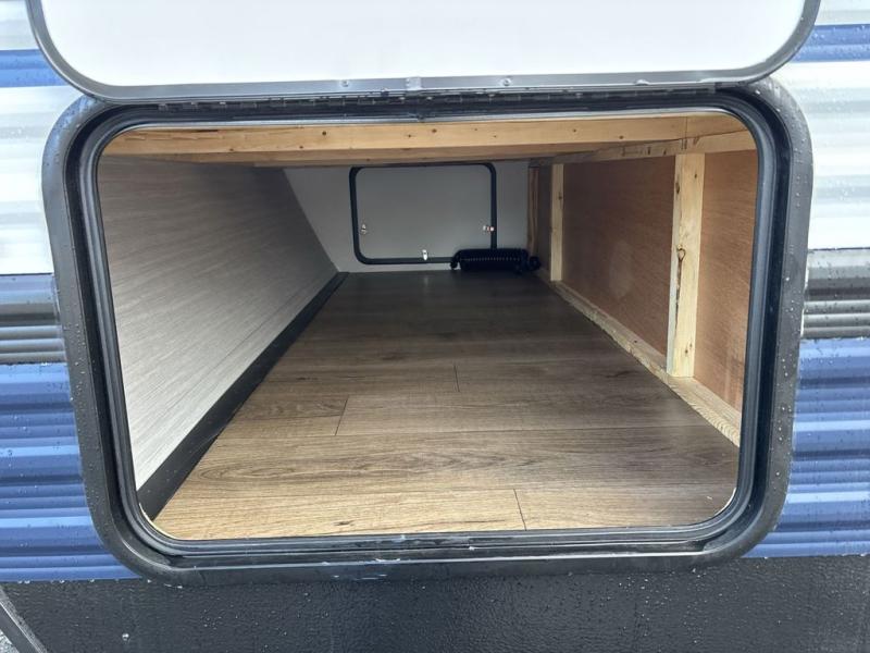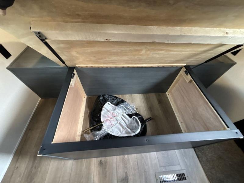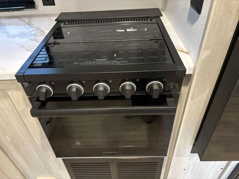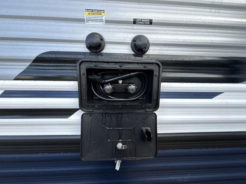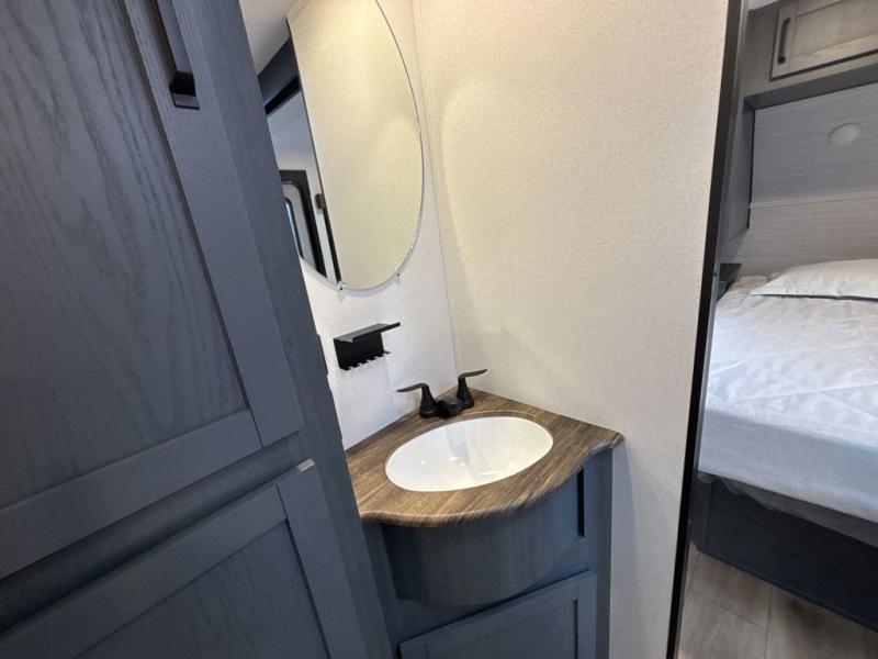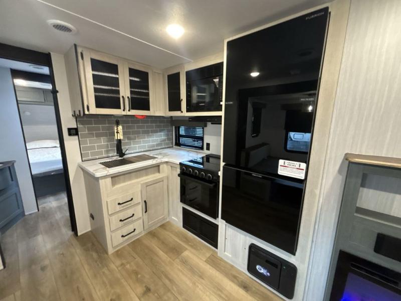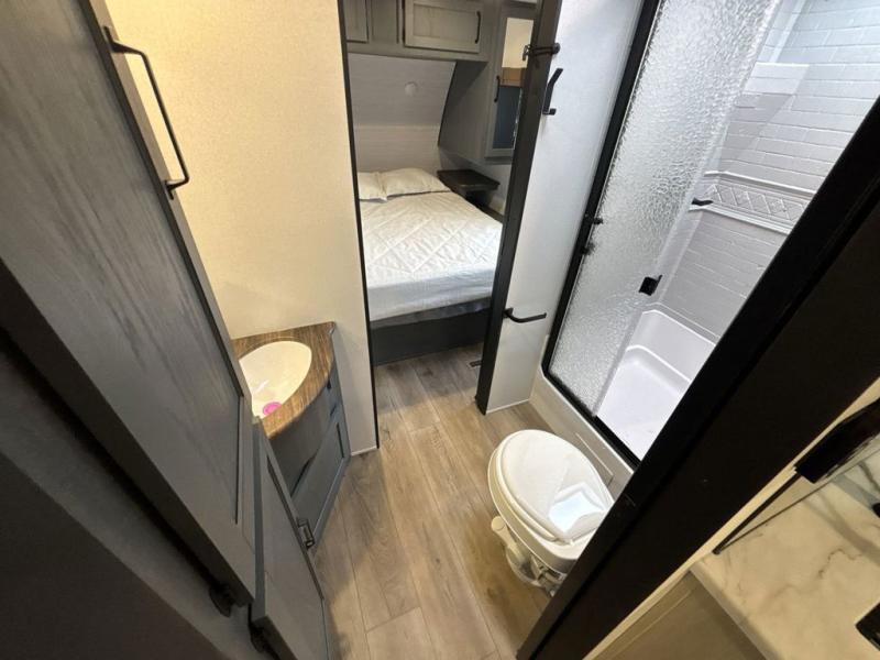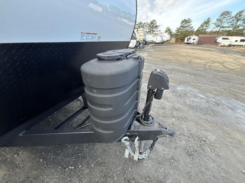 This travel trailer is perfect for camping with a larger group of friends or if you have older kids since there are two private bunkrooms! Each room includes a bunk bed and storage space for clothes, shoes, and more. You'll enjoy your own space up front in the master bedroom that includes a queen bed, dual shirt closets, and one of the dual entry doors to the unit for added convenience. Everyone can come together in the combined living area and kitchen that includes a large slide out with a sofa and booth dinette, plus there is a fireplace to make this space feel more like home. A full kitchen inside lets you create home-cooked meals each day, and you can choose to add the optional micro kitchen with a griddle for a pancake breakfast outdoors!