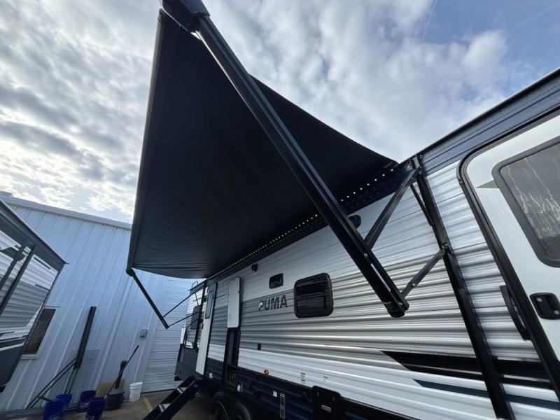 If you're looking for family-fun adventures then you need one of these Palomino Puma fifth wheels or travel trailers! They are built rugged, easy to tow, and jam packed with features. The Darco wrapped underbelly will protect your units vitals and the AlphaPly roofing membrane covers it. They also have new aluminum wheels and a powder coated steel I-beam frame. Inside, the Congoleum linoleum will be easy to keep clean, and the night roller shades will provide privacy when it's time to turn in. You'll also enjoy an electric awning with an LED light strip plus an AM/FM/Bluetooth stereo and two outside speakers to keep the party going!