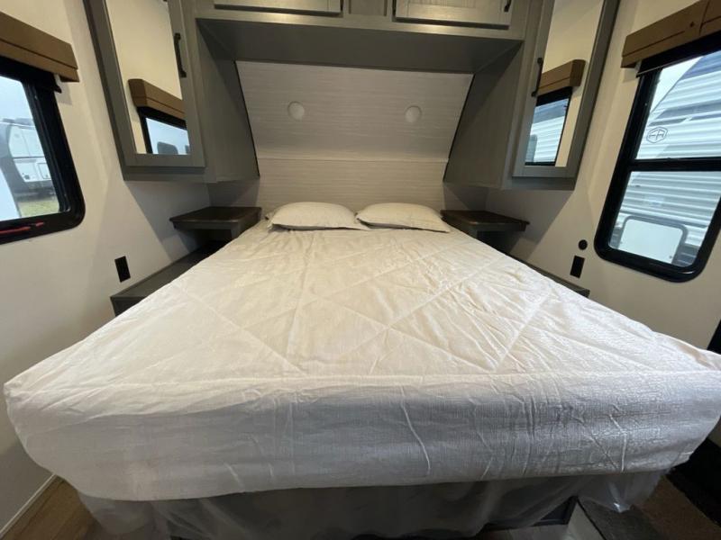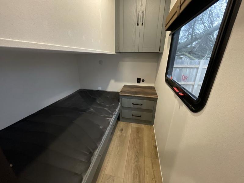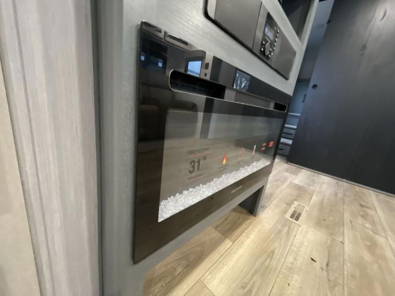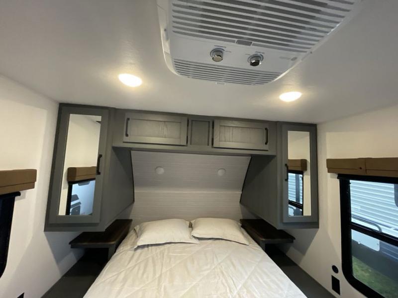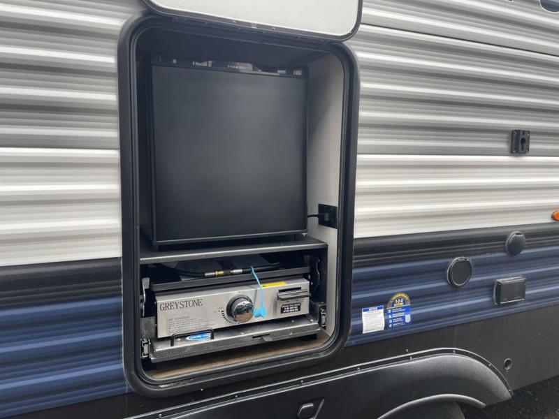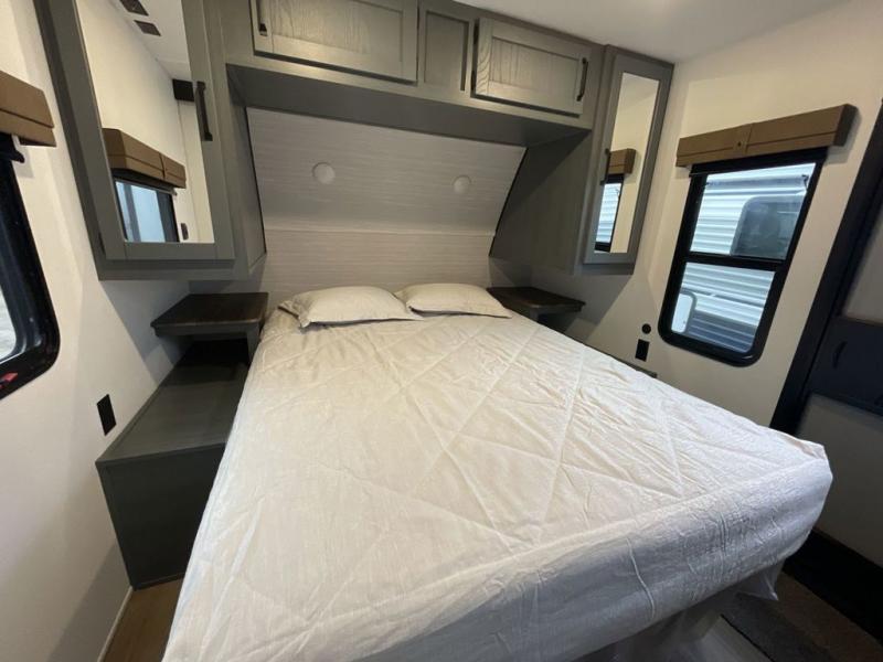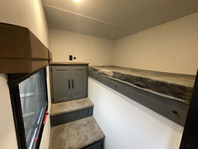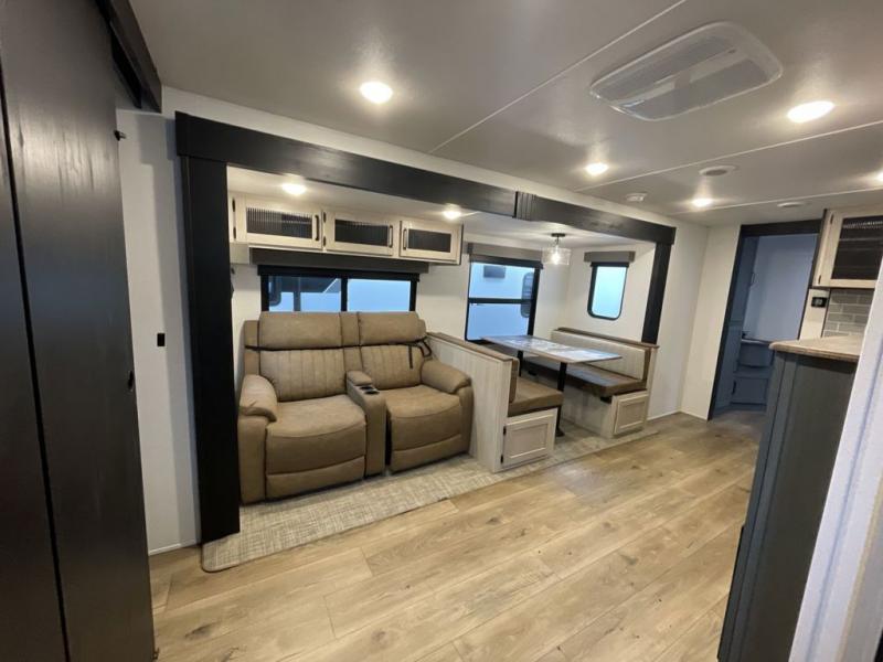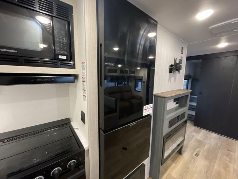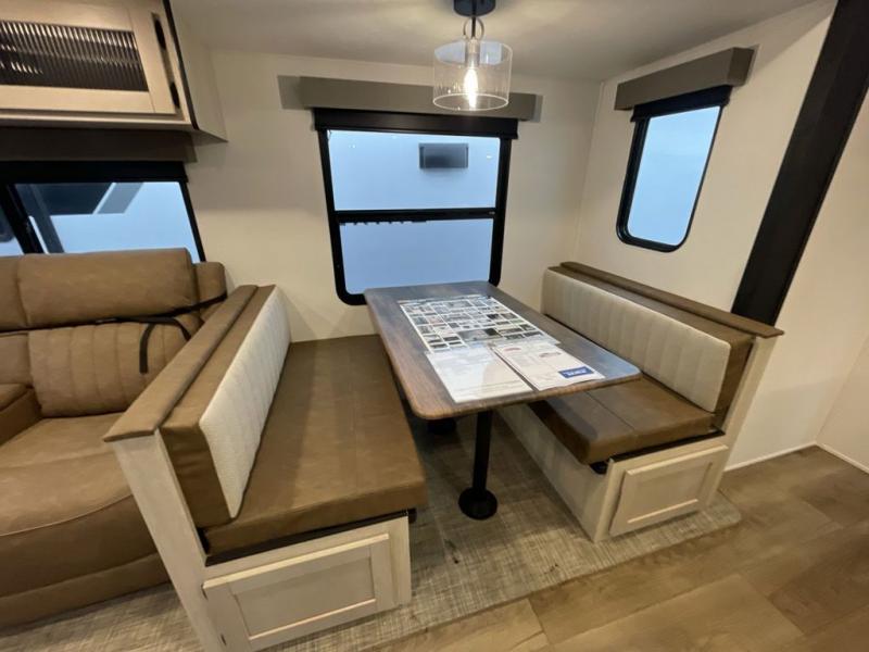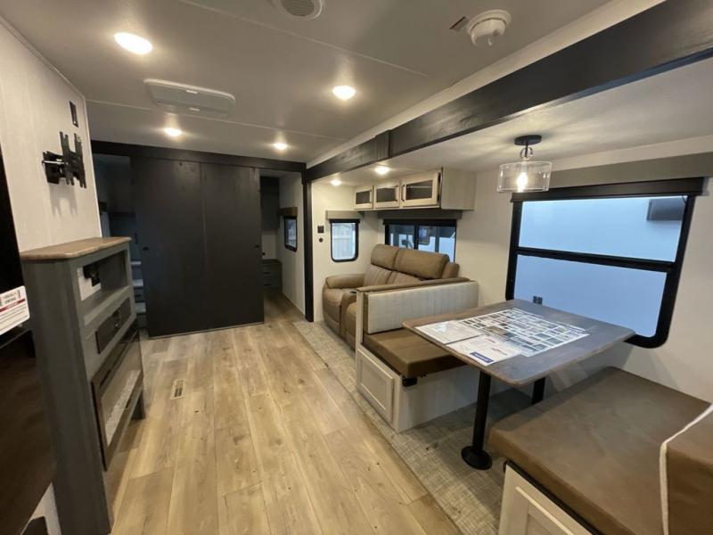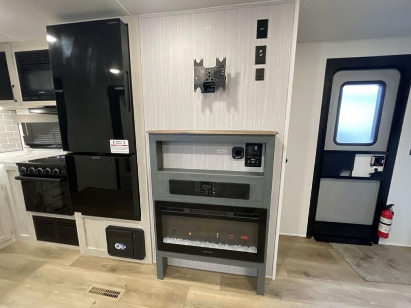 This travel trailer is perfect for camping with a larger group of friends or if you have older kids since there are two private bunkrooms! Each room includes a bunk bed and storage space for clothes, shoes, and more. You'll enjoy your own space up front in the master bedroom that includes a queen bed, dual shirt closets, and one of the dual entry doors to the unit for added convenience. Everyone can come together in the combined living area and kitchen that includes a large slide out with a sofa and booth dinette, plus there is a fireplace to make this space feel more like home. A full kitchen inside lets you create home-cooked meals each day, and you can choose to add the optional micro kitchen with a griddle for a pancake breakfast outdoors!