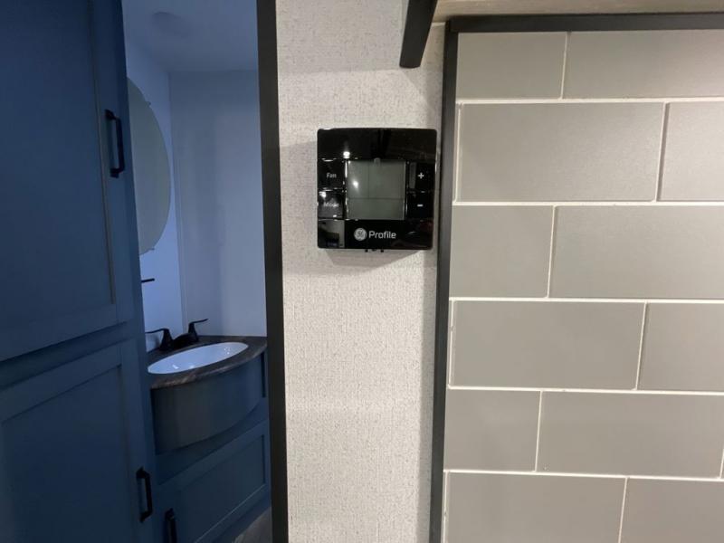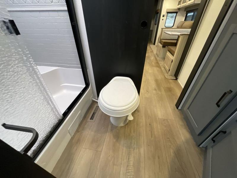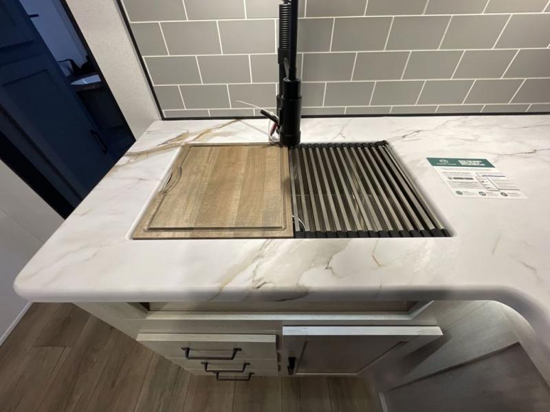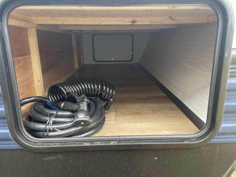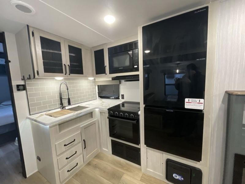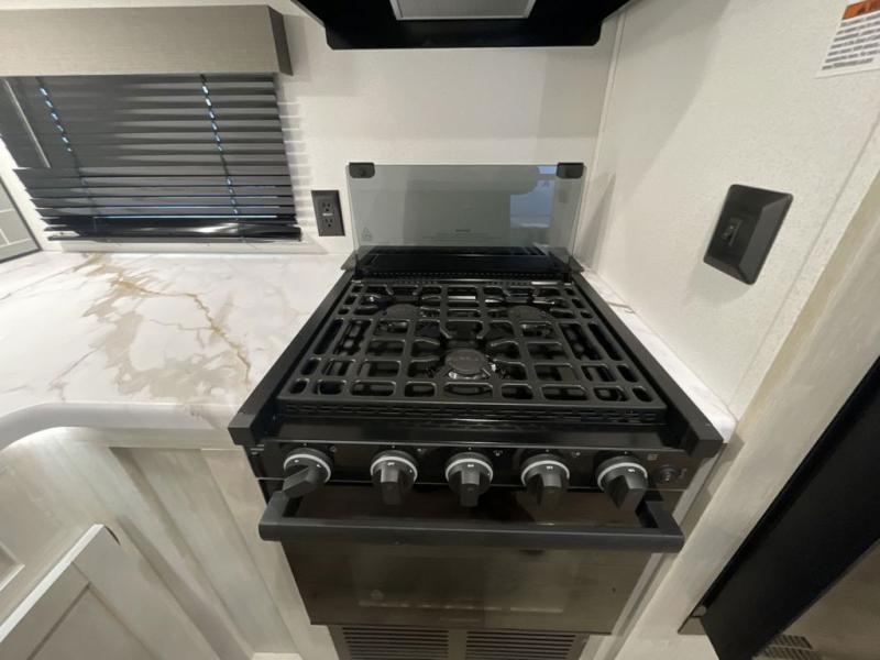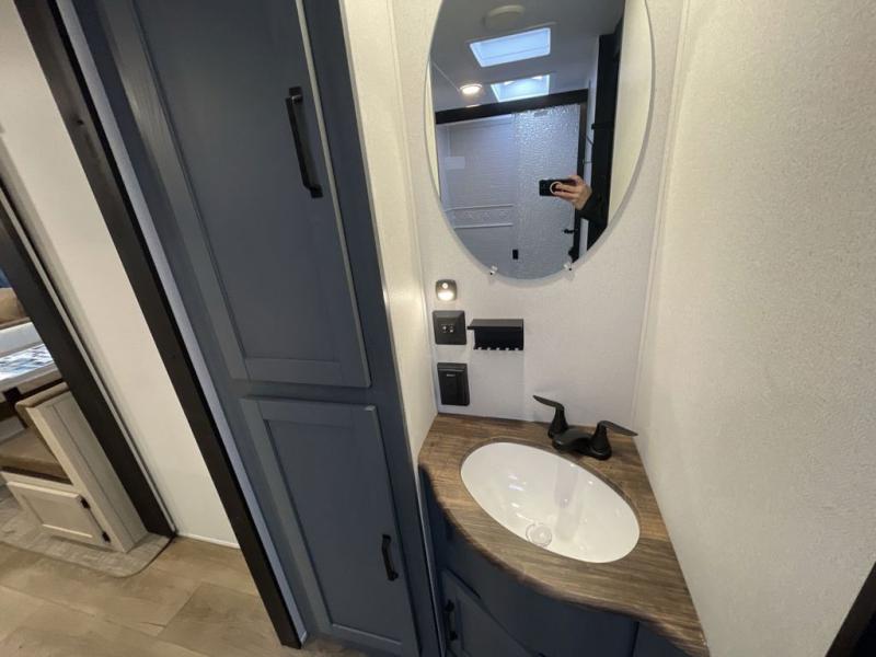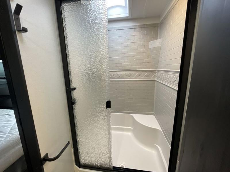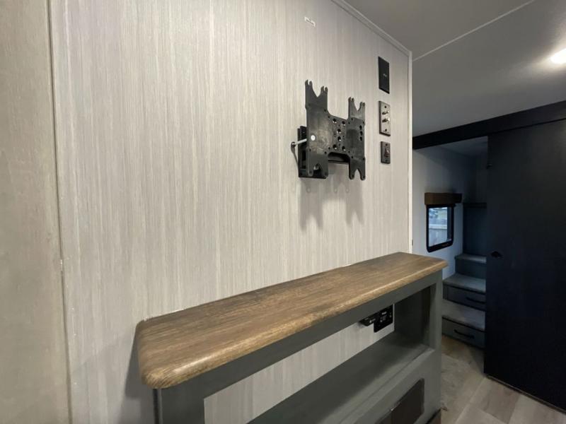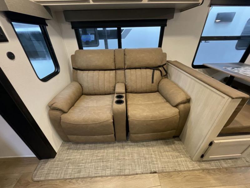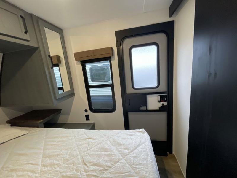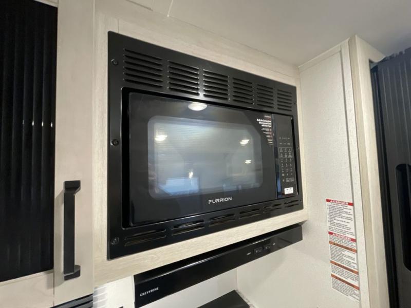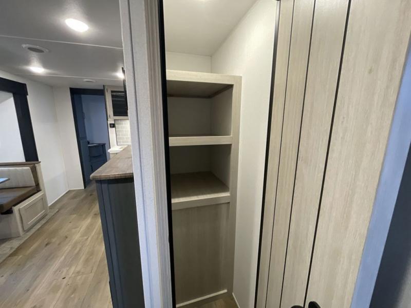 This travel trailer is perfect for camping with a larger group of friends or if you have older kids since there are two private bunkrooms! Each room includes a bunk bed and storage space for clothes, shoes, and more. You'll enjoy your own space up front in the master bedroom that includes a queen bed, dual shirt closets, and one of the dual entry doors to the unit for added convenience. Everyone can come together in the combined living area and kitchen that includes a large slide out with a sofa and booth dinette, plus there is a fireplace to make this space feel more like home. A full kitchen inside lets you create home-cooked meals each day, and you can choose to add the optional micro kitchen with a griddle for a pancake breakfast outdoors!