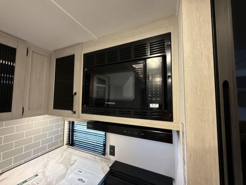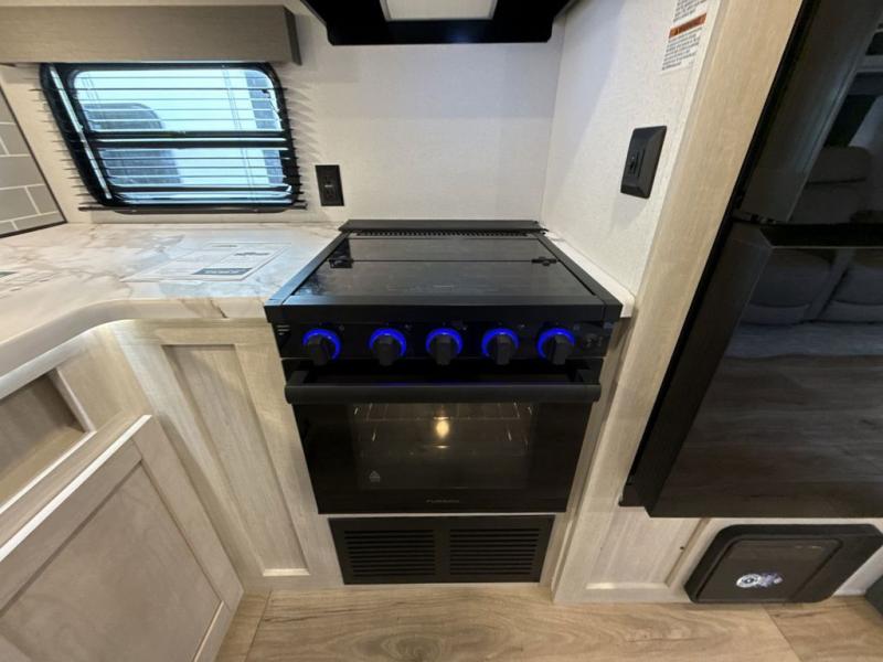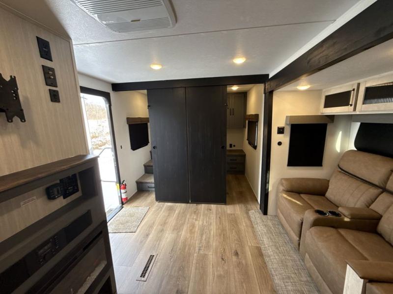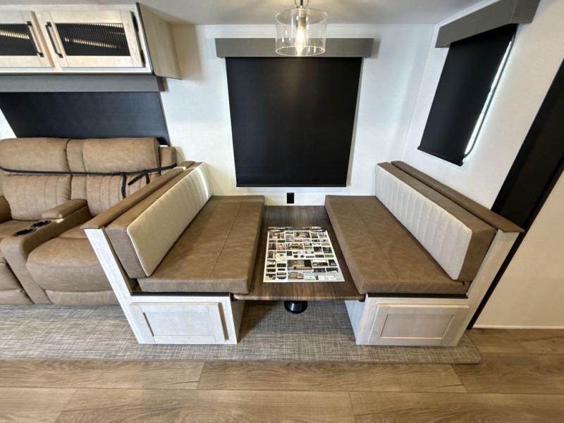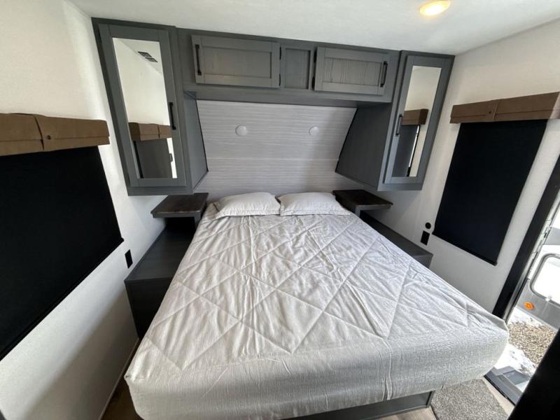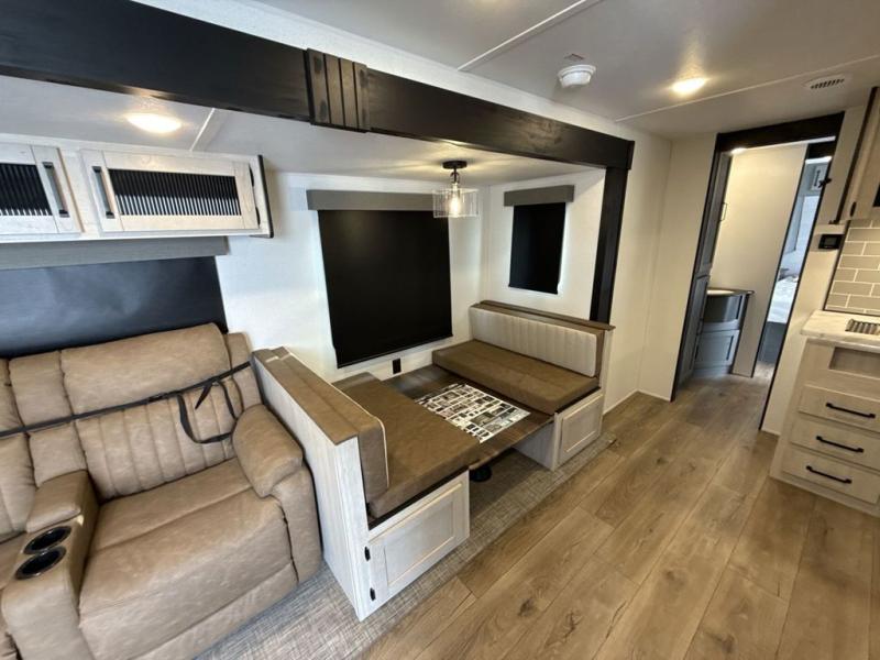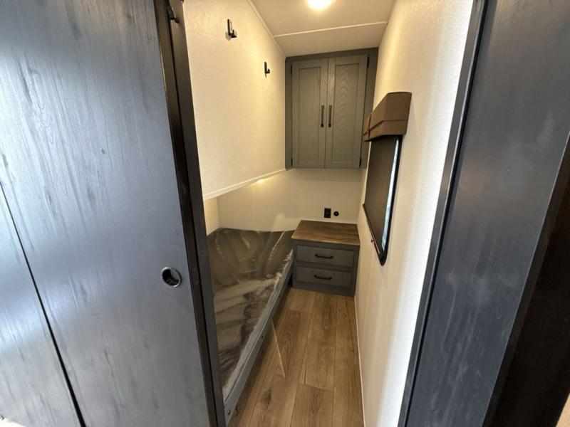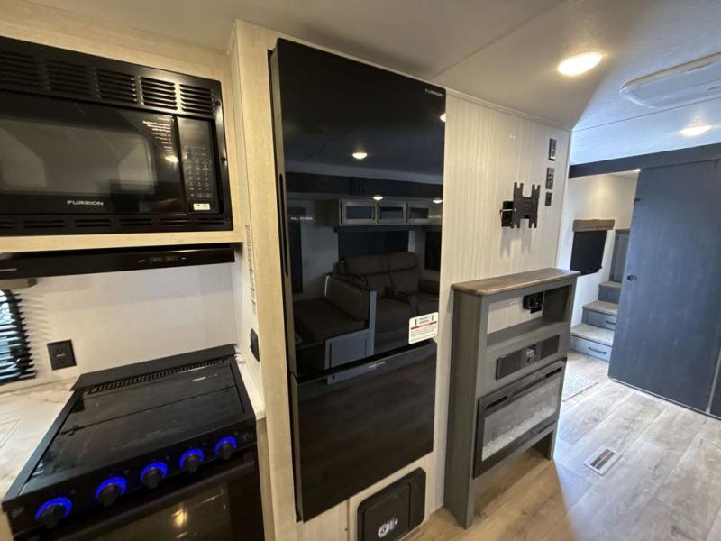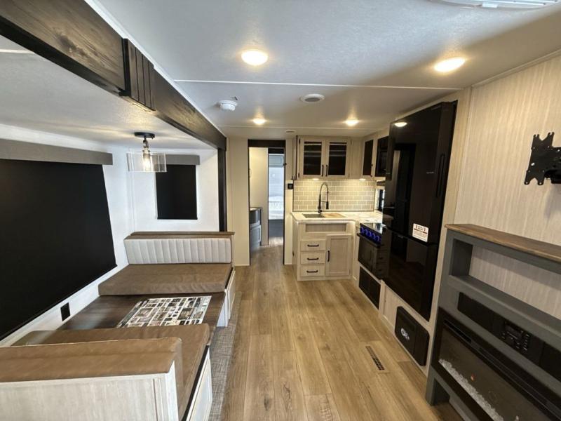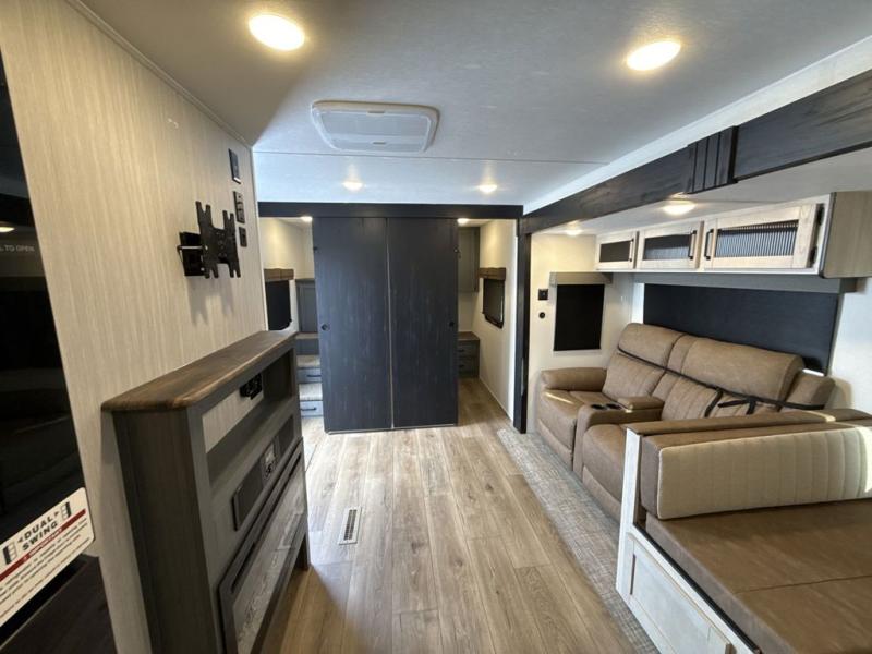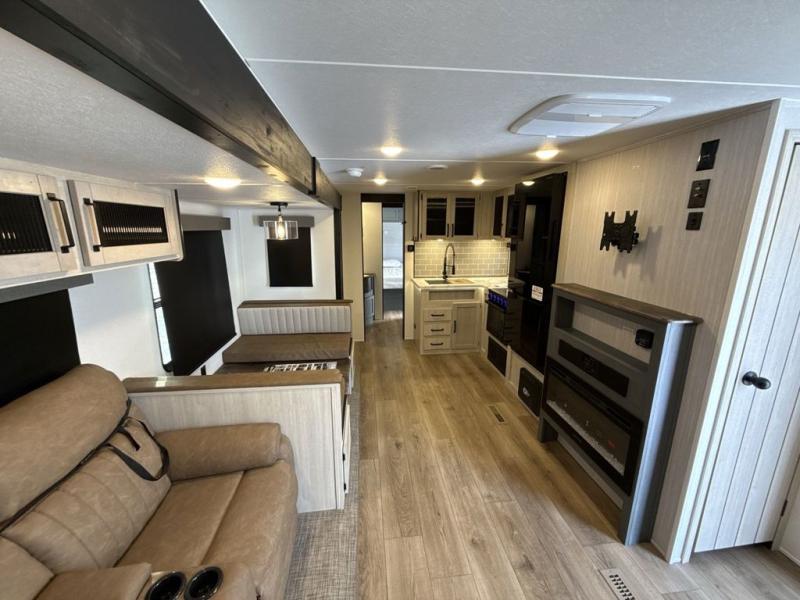 This travel trailer is perfect for camping with a larger group of friends or if you have older kids since there are two private bunkrooms! Each room includes a bunk bed and storage space for clothes, shoes, and more. You'll enjoy your own space up front in the master bedroom that includes a queen bed, dual shirt closets, and one of the dual entry doors to the unit for added convenience. Everyone can come together in the combined living area and kitchen that includes a large slide out with a sofa and booth dinette, plus there is a fireplace to make this space feel more like home. A full kitchen inside lets you create home-cooked meals each day, and you can choose to add the optional micro kitchen with a griddle for a pancake breakfast outdoors!
