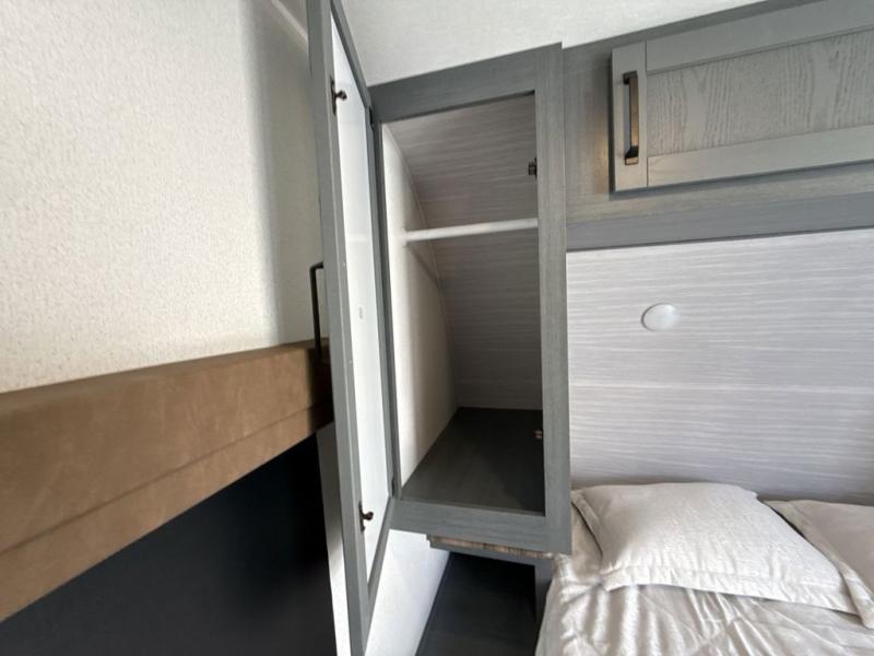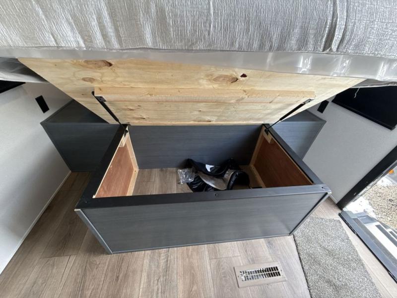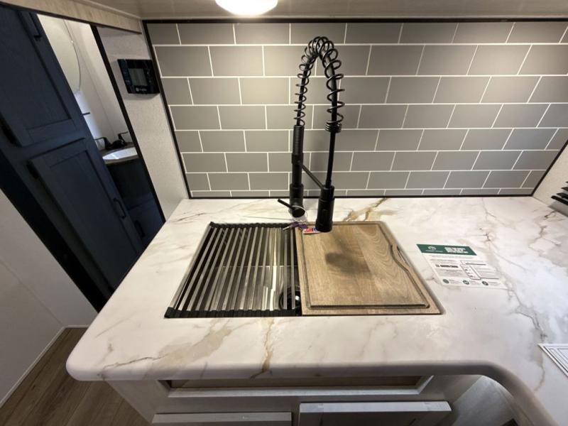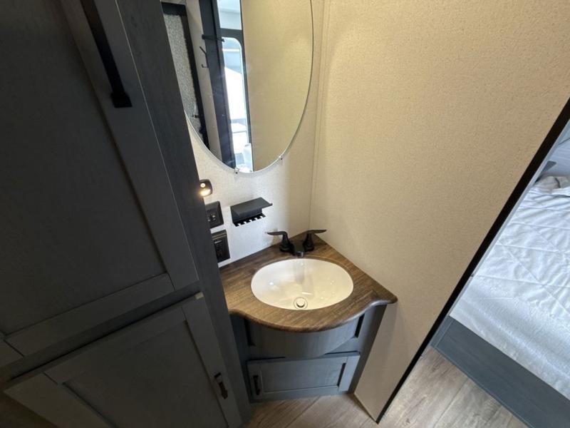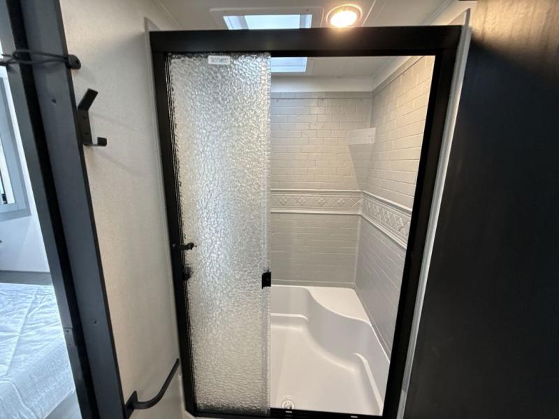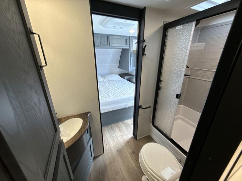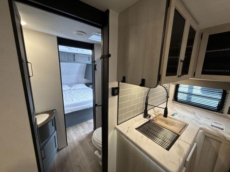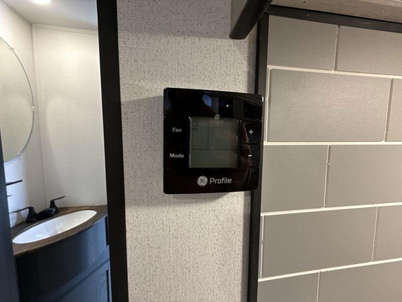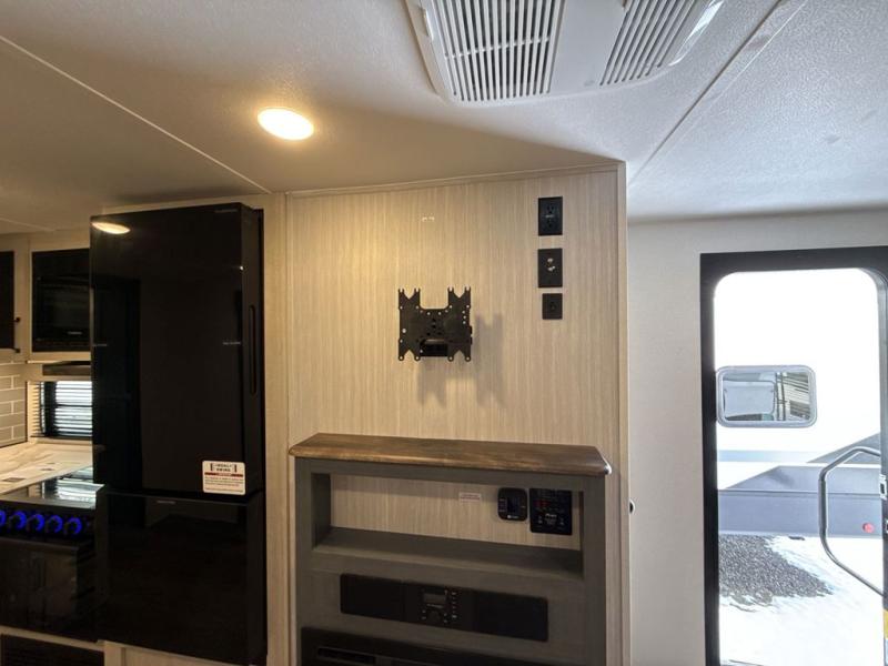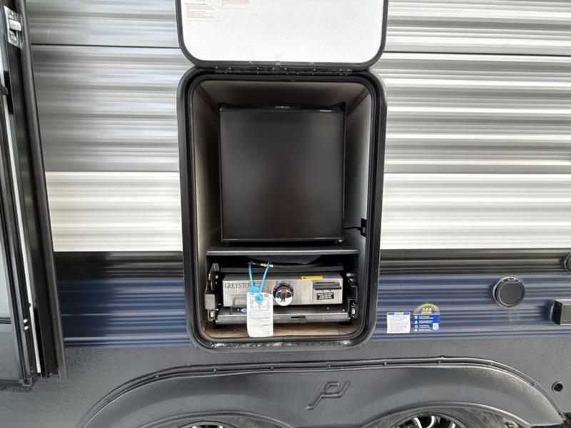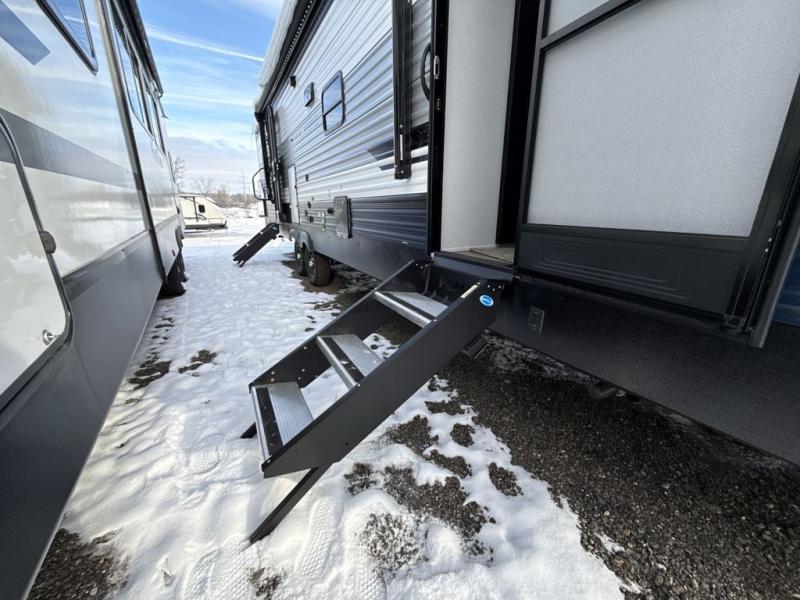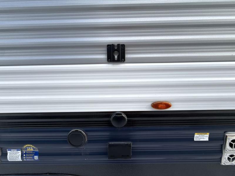 This travel trailer is perfect for camping with a larger group of friends or if you have older kids since there are two private bunkrooms! Each room includes a bunk bed and storage space for clothes, shoes, and more. You'll enjoy your own space up front in the master bedroom that includes a queen bed, dual shirt closets, and one of the dual entry doors to the unit for added convenience. Everyone can come together in the combined living area and kitchen that includes a large slide out with a sofa and booth dinette, plus there is a fireplace to make this space feel more like home. A full kitchen inside lets you create home-cooked meals each day, and you can choose to add the optional micro kitchen with a griddle for a pancake breakfast outdoors!