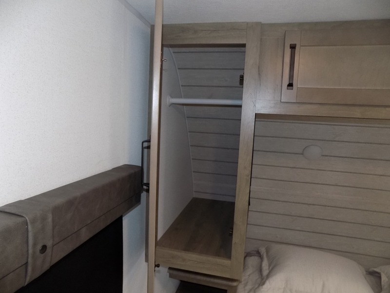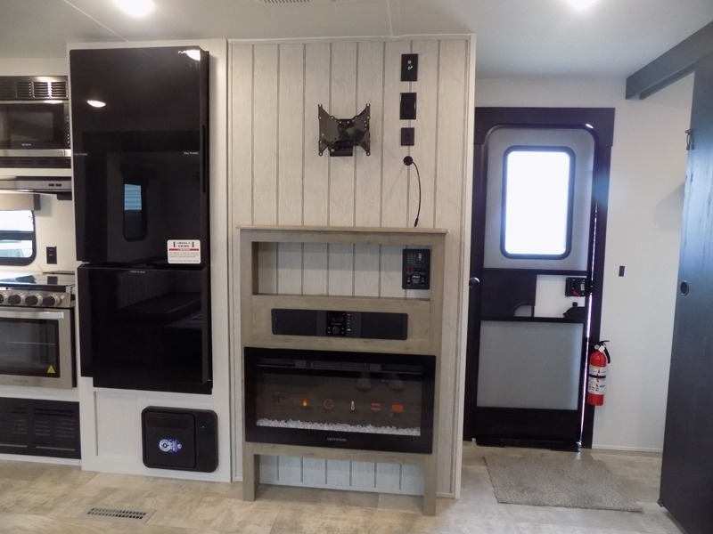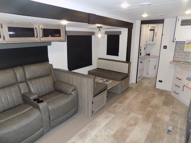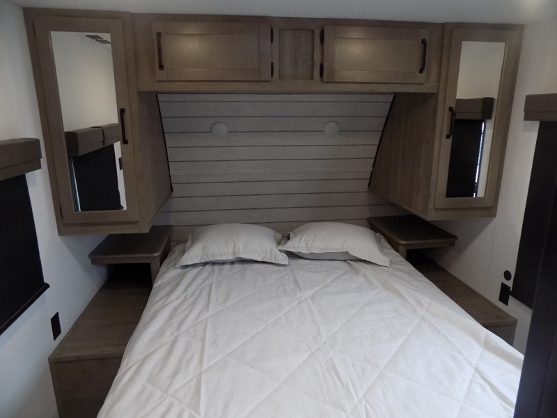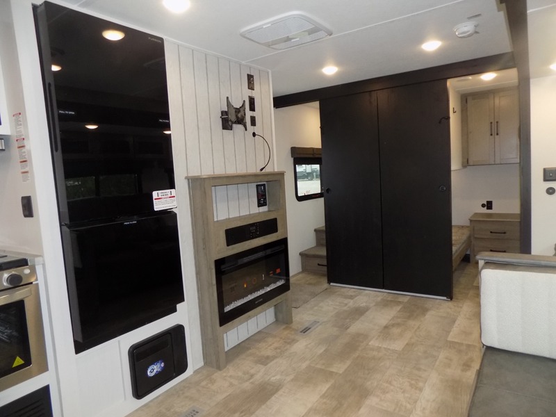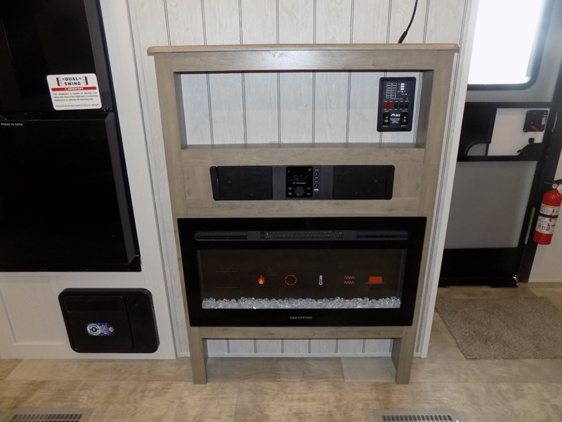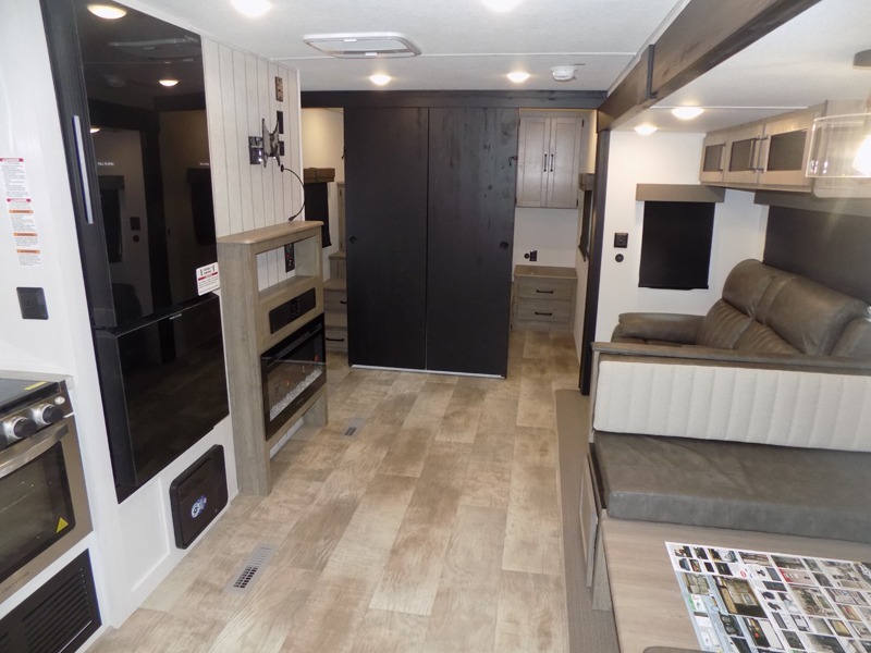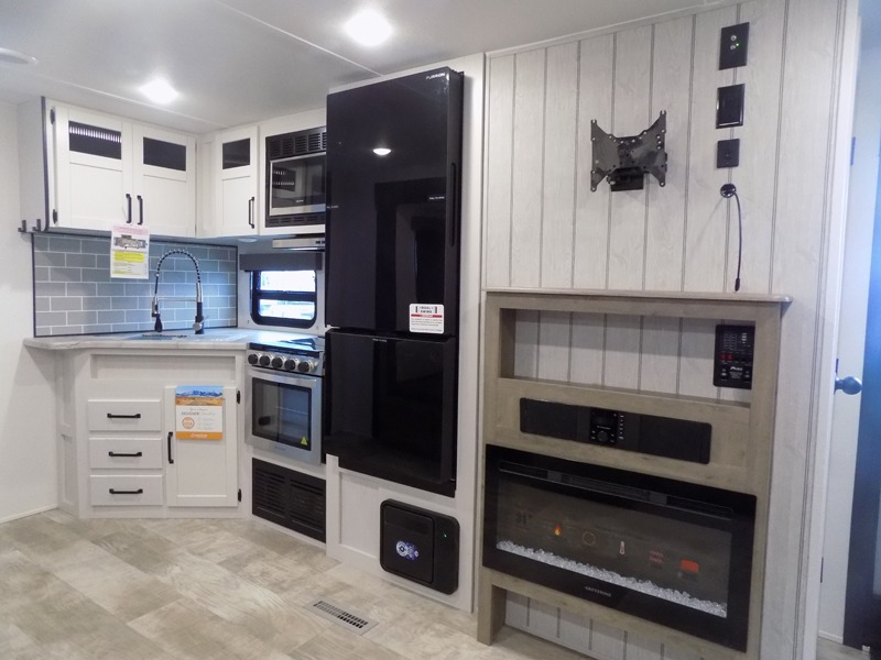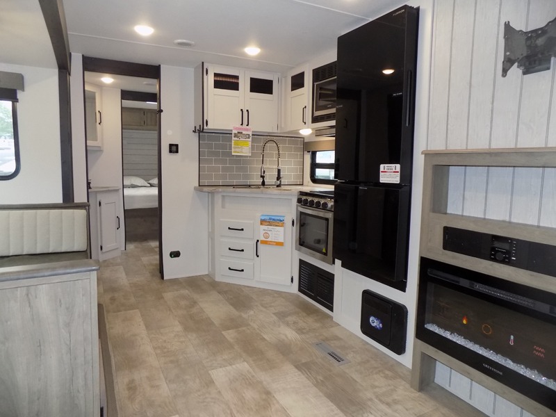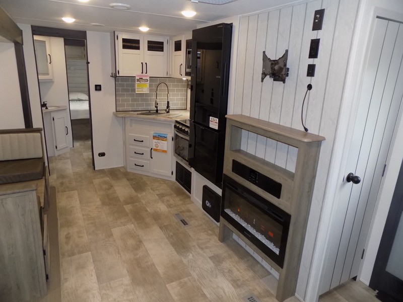This travel trailer is perfect for camping with a larger group of friends or if you have older kids since there are two private bunkrooms! Each room includes a bunk bed and storage space for clothes, shoes, and more. You'll enjoy your own space up front in the master bedroom that includes a queen bed, dual shirt closets, and one of the dual entry doors to the unit for added convenience. Everyone can come together in the combined living area and kitchen that includes a large slide out with a sofa and booth dinette, plus there is a fireplace to make this space feel more like home. A full kitchen inside lets you create home-cooked meals each day, and you can choose to add the optional micro kitchen with a griddle for a pancake breakfast outdoors!