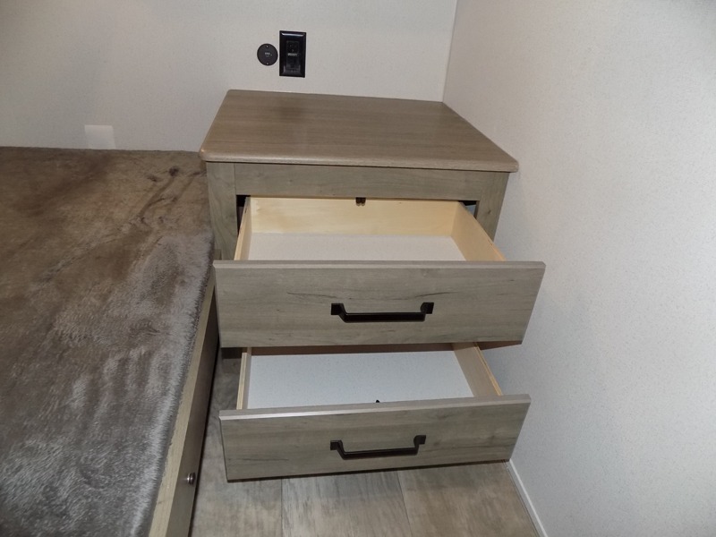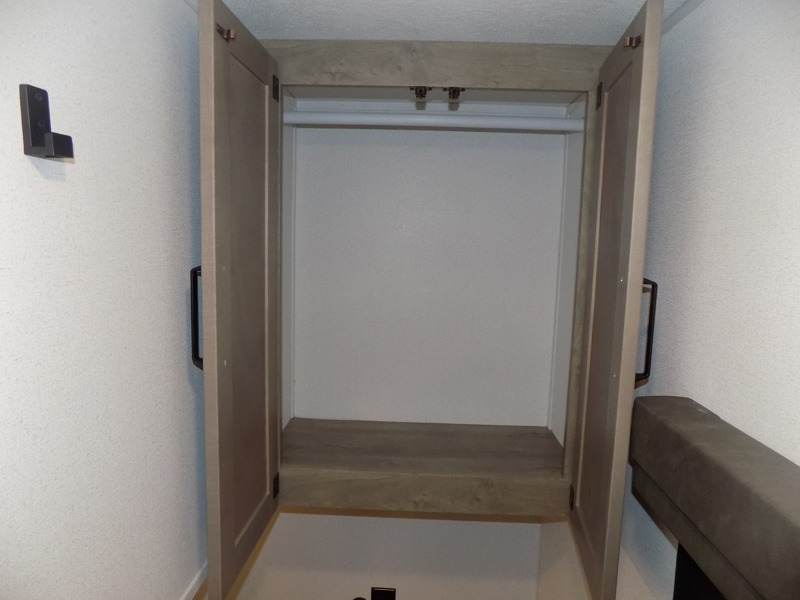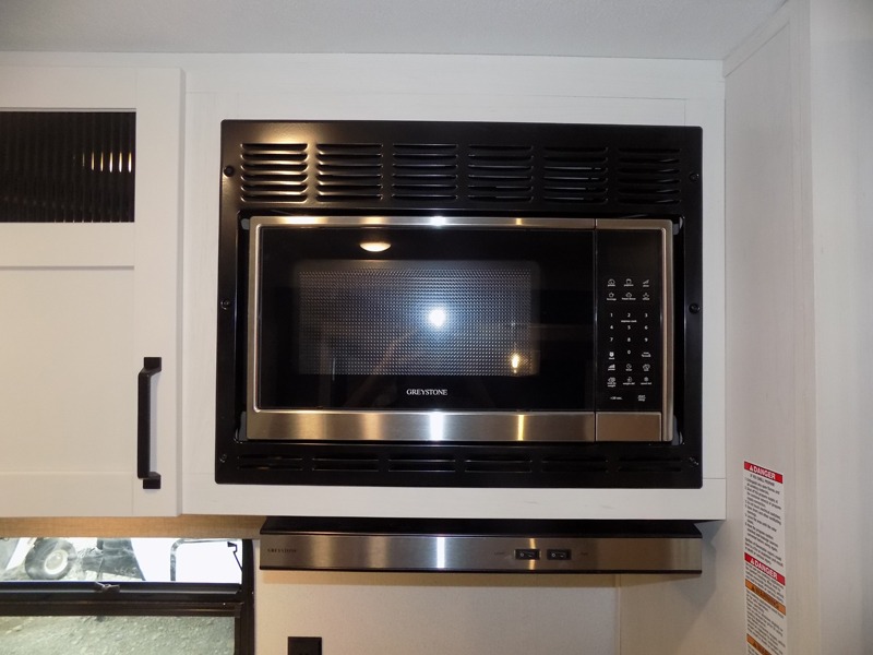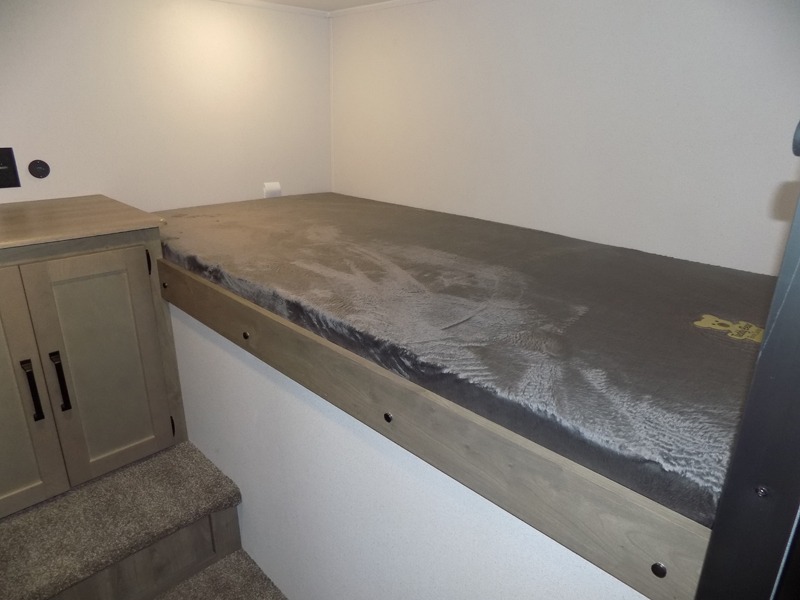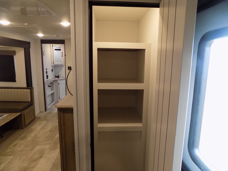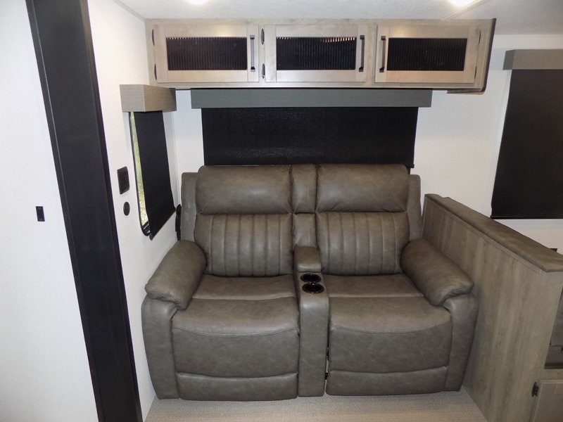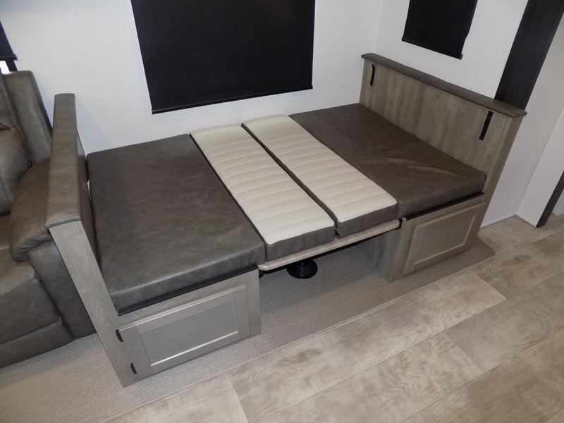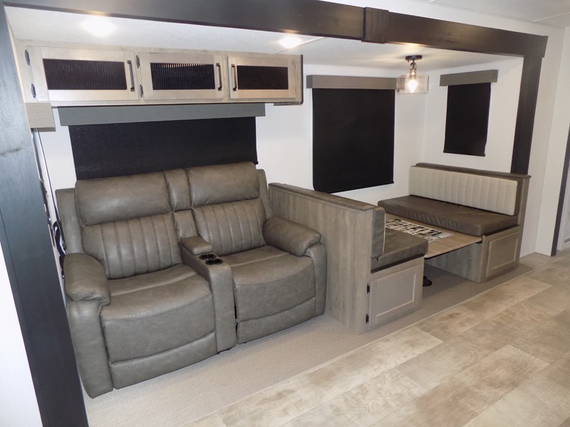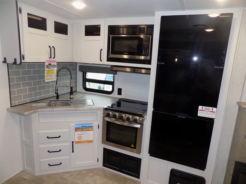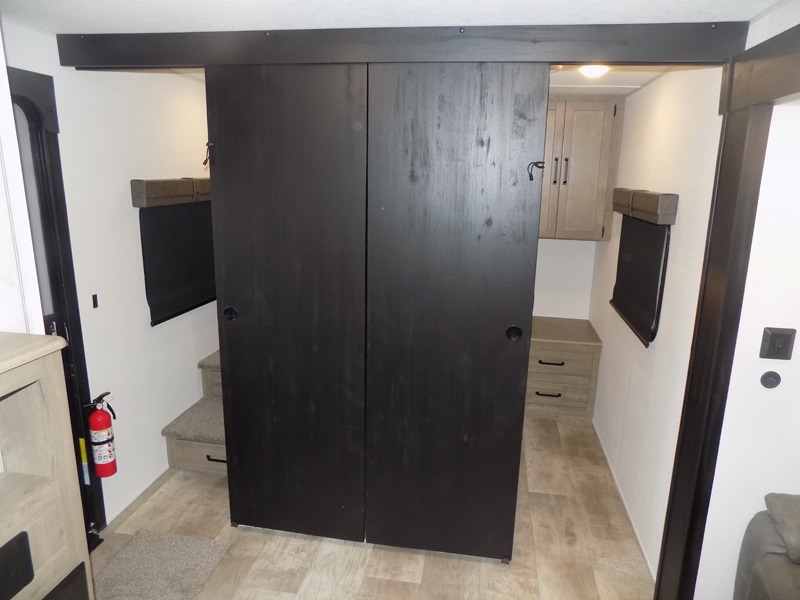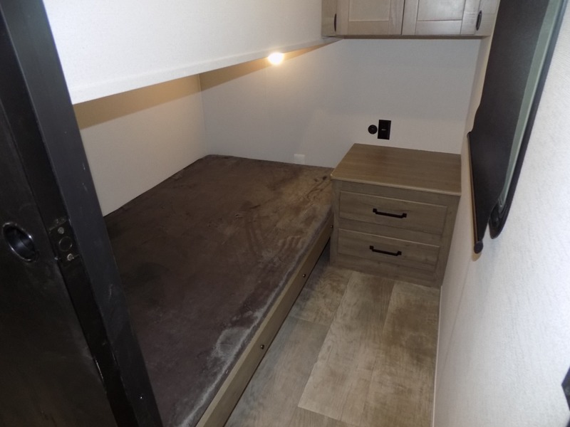 This travel trailer is perfect for camping with a larger group of friends or if you have older kids since there are two private bunkrooms! Each room includes a bunk bed and storage space for clothes, shoes, and more. You'll enjoy your own space up front in the master bedroom that includes a queen bed, dual shirt closets, and one of the dual entry doors to the unit for added convenience. Everyone can come together in the combined living area and kitchen that includes a large slide out with a sofa and booth dinette, plus there is a fireplace to make this space feel more like home. A full kitchen inside lets you create home-cooked meals each day, and you can choose to add the optional micro kitchen with a griddle for a pancake breakfast outdoors!