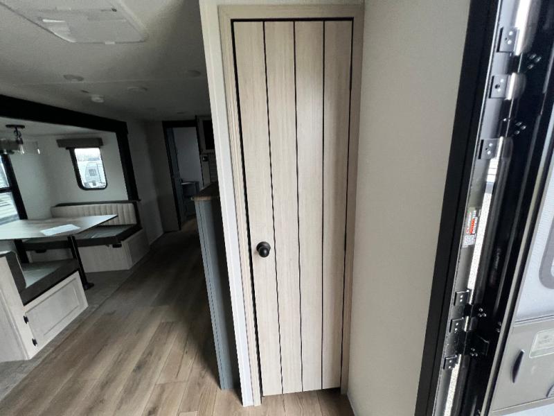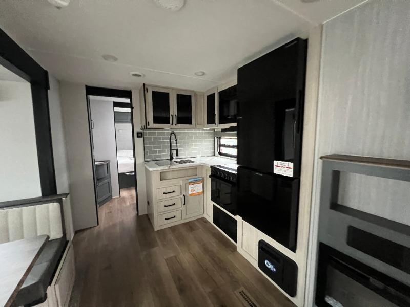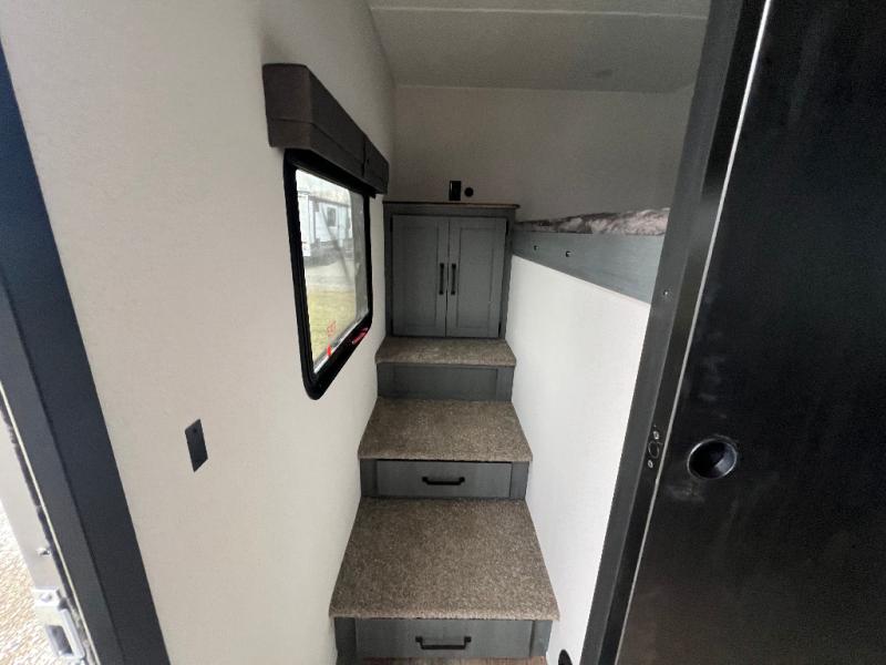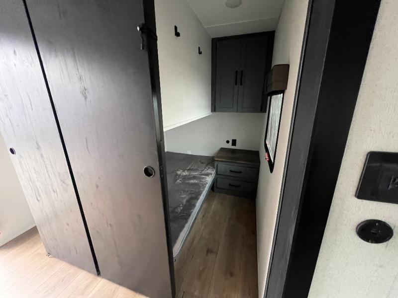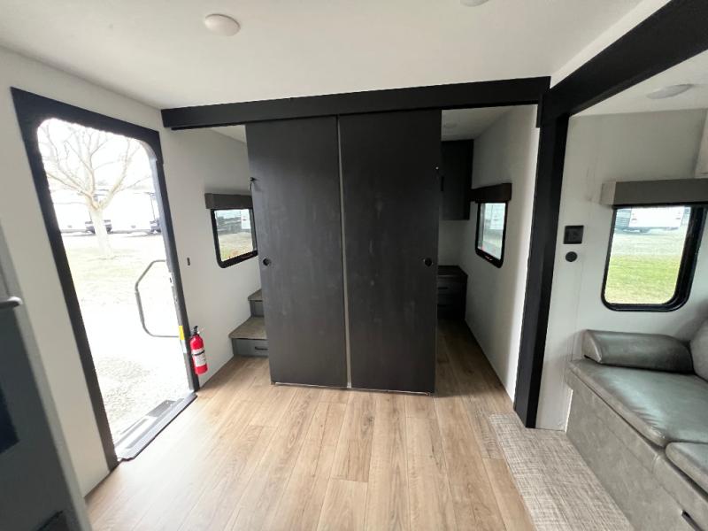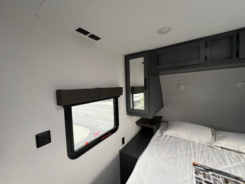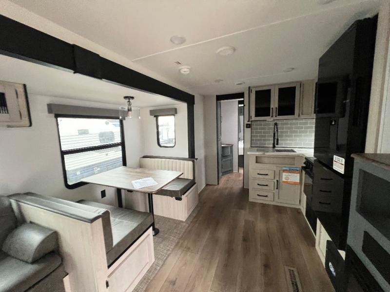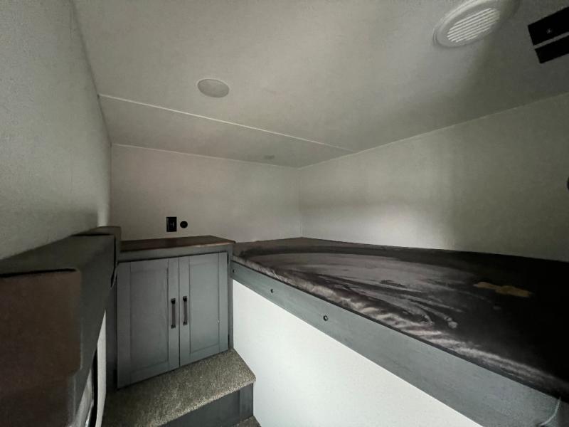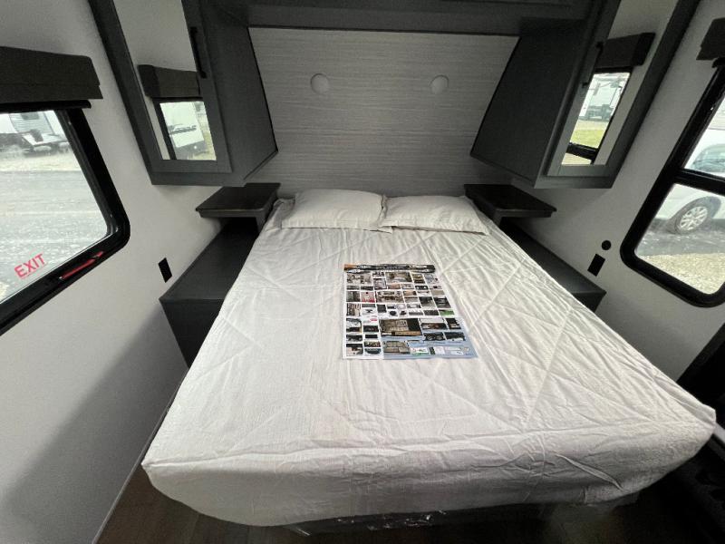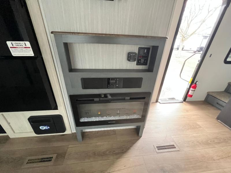 This travel trailer is perfect for camping with a larger group of friends or if you have older kids since there are two private bunkrooms! Each room includes a bunk bed and storage space for clothes, shoes, and more. You'll enjoy your own space up front in the master bedroom that includes a queen bed, dual shirt closets, and one of the dual entry doors to the unit for added convenience. Everyone can come together in the combined living area and kitchen that includes a large slide out with a sofa and booth dinette, plus there is a fireplace to make this space feel more like home. And a full kitchen lets you create home-cooked meals each day.