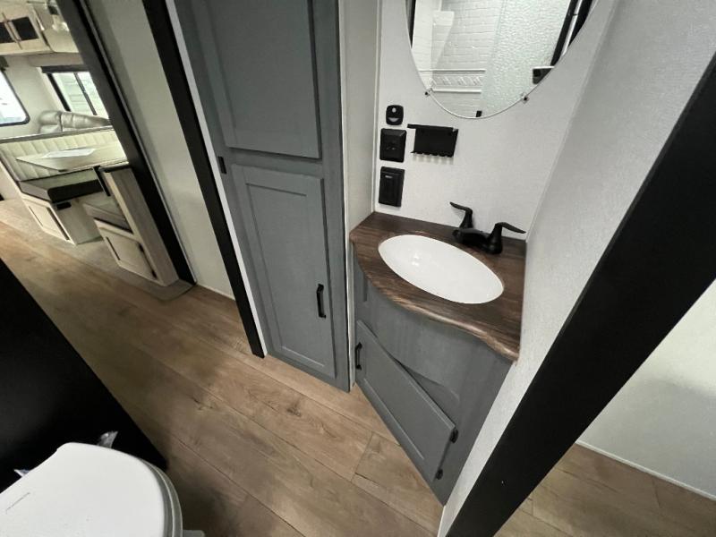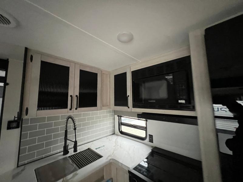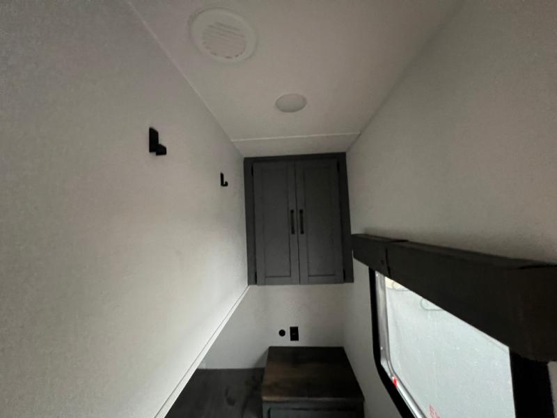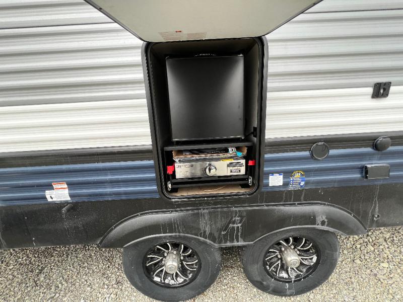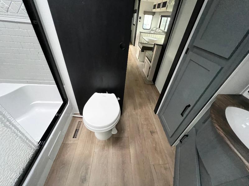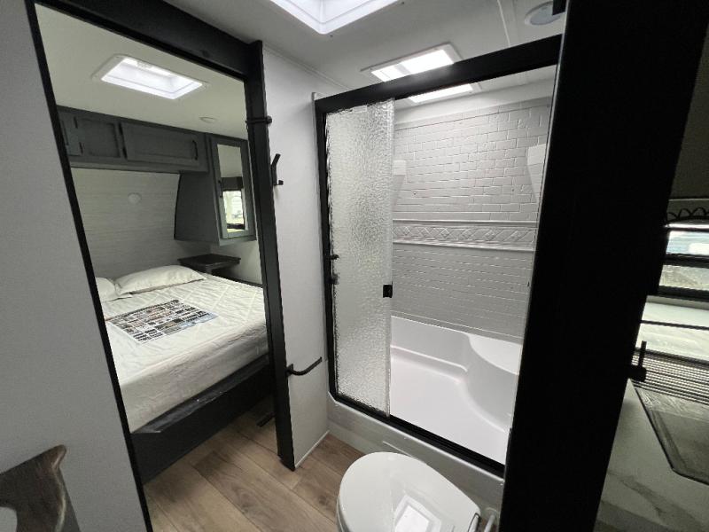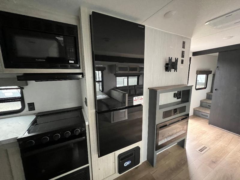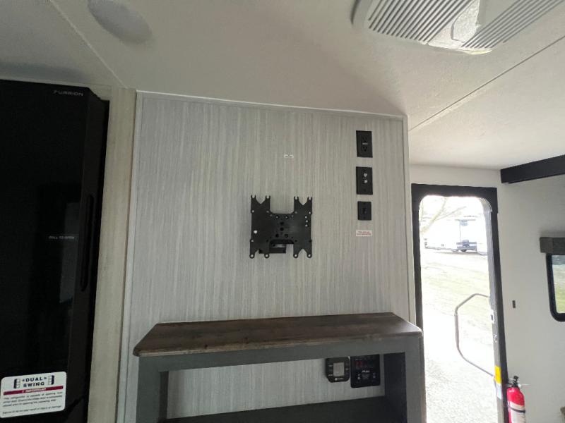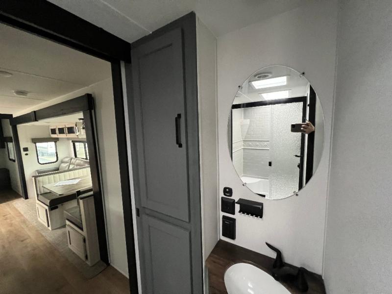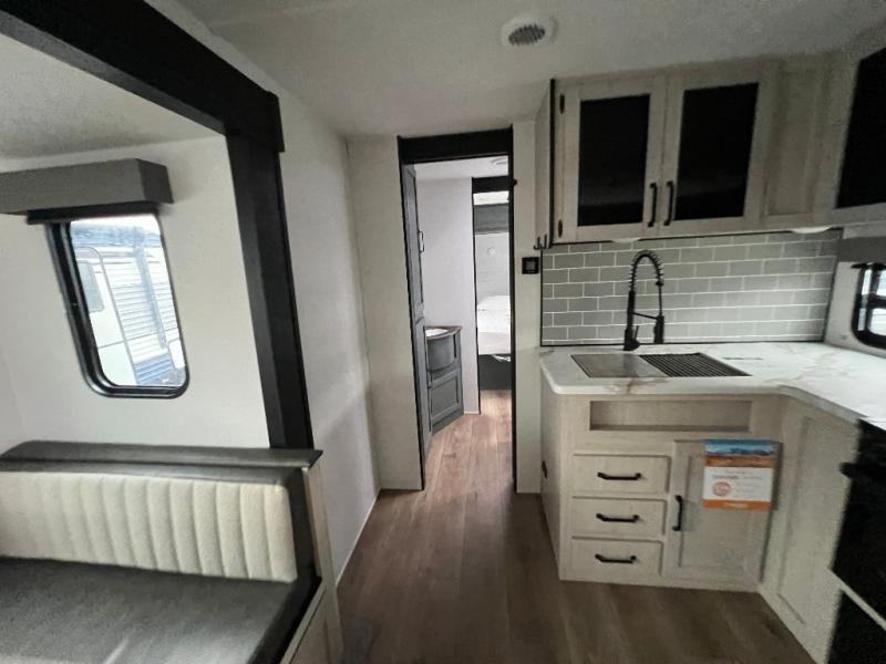 This travel trailer is perfect for camping with a larger group of friends or if you have older kids since there are two private bunkrooms! Each room includes a bunk bed and storage space for clothes, shoes, and more. You'll enjoy your own space up front in the master bedroom that includes a queen bed, dual shirt closets, and one of the dual entry doors to the unit for added convenience. Everyone can come together in the combined living area and kitchen that includes a large slide out with a sofa and booth dinette, plus there is a fireplace to make this space feel more like home. And a full kitchen lets you create home-cooked meals each day.
