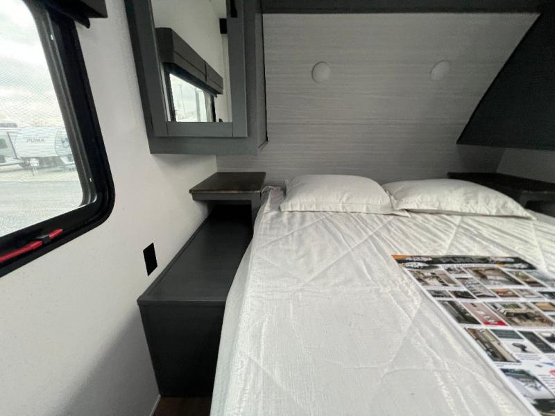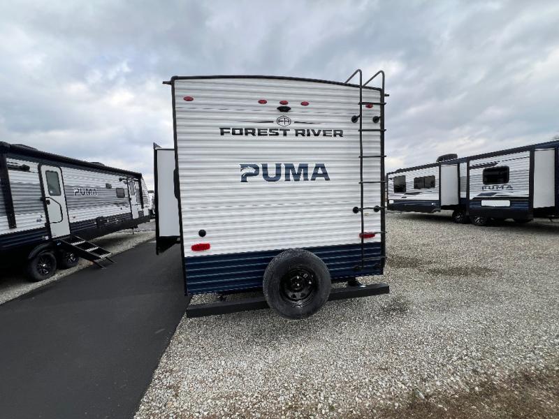 If you're looking for family-fun adventures, then you need one of these Forest River Puma travel trailers! They are built rugged, easy to tow, and jam packed with features. The Darco wrapped underbelly will help protect your unit, and the roof and side mount solar prep gives you the option to add off-grid power. Inside, the Congoleum linoleum will be easy to keep clean, and the night roller shades will provide privacy when it's time to turn in. You'll also enjoy an electric awning with an LED light strip plus an AM/FM/Bluetooth stereo and two outside speakers to keep the party going!