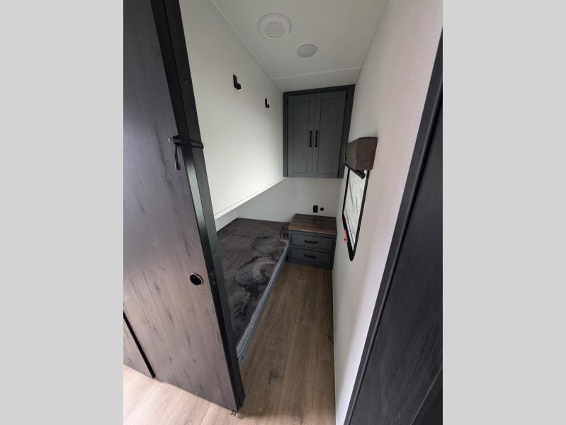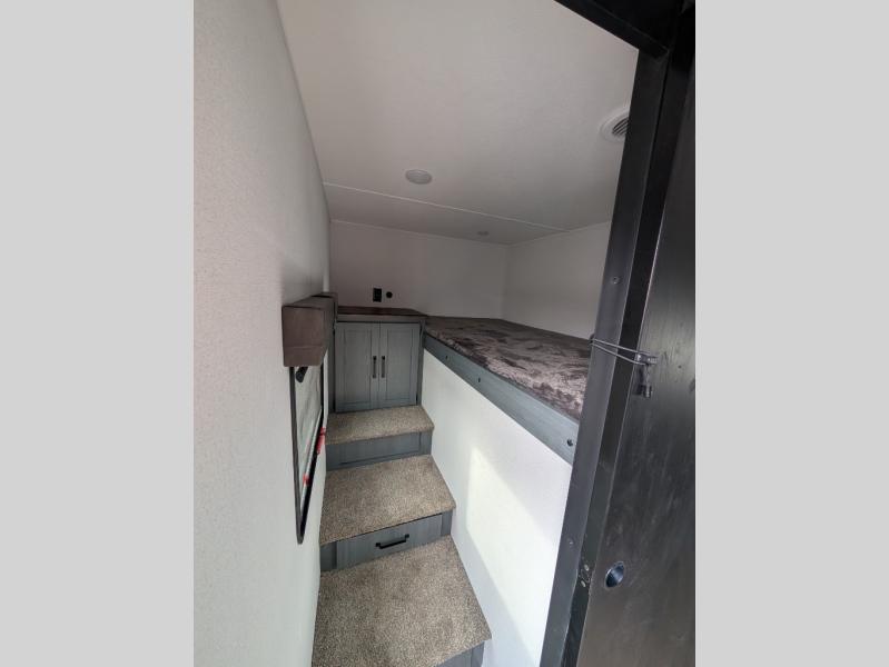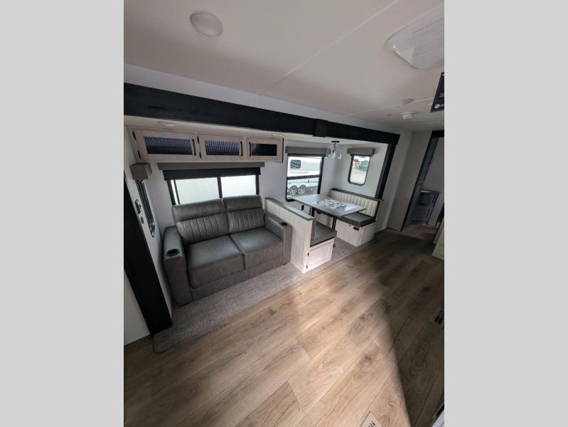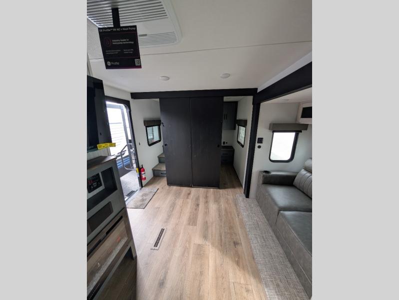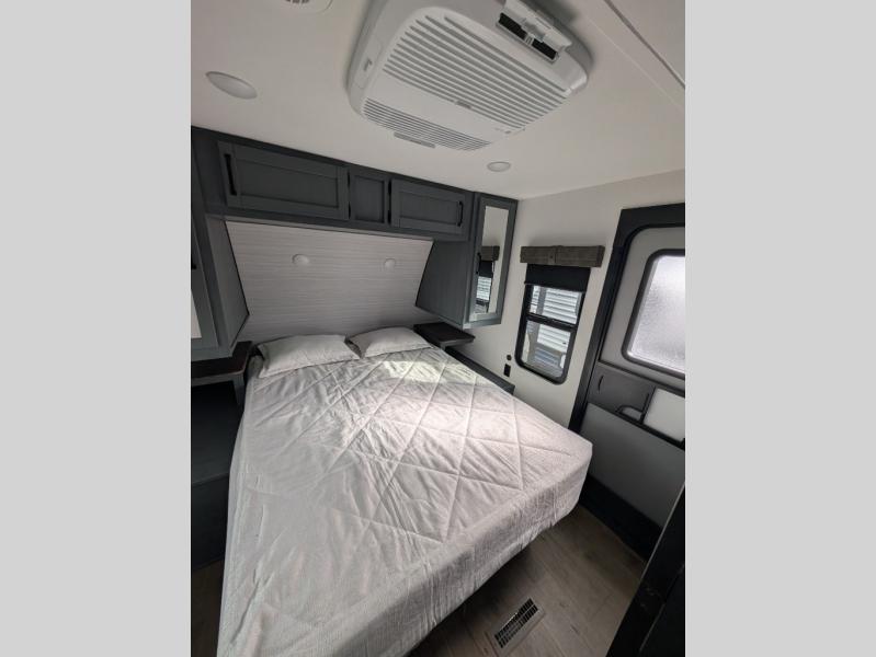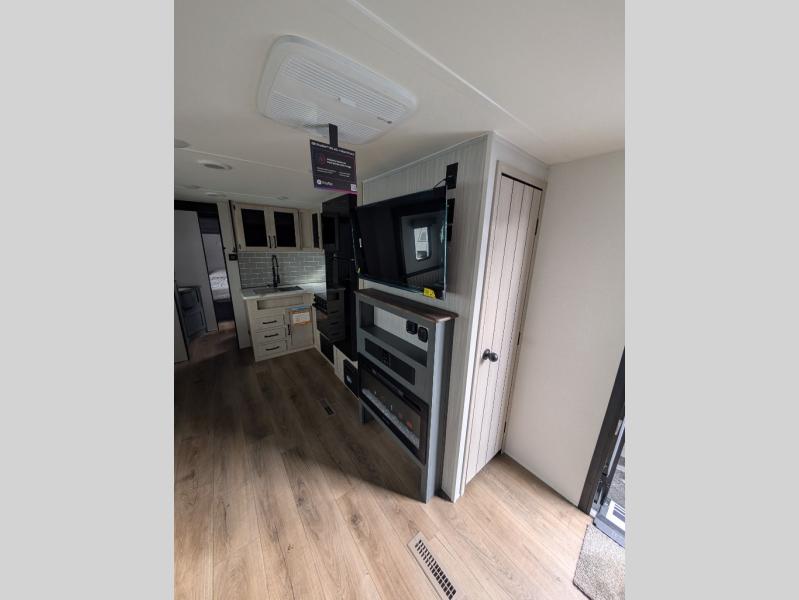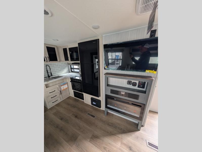 This travel trailer is perfect for camping with a larger group of friends or if you have older kids since there are two private bunkrooms! Each room includes a bunk bed and storage space for clothes, shoes, and more. You'll enjoy your own space up front in the master bedroom that includes a queen bed, dual shirt closets, and one of the dual entry doors to the unit for added convenience. Everyone can come together in the combined living area and kitchen that includes a large slide out with a sofa and booth dinette, plus there is a fireplace to make this space feel more like home. And a full kitchen lets you create home-cooked meals each day.