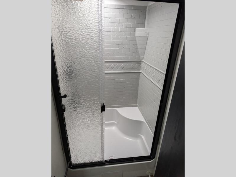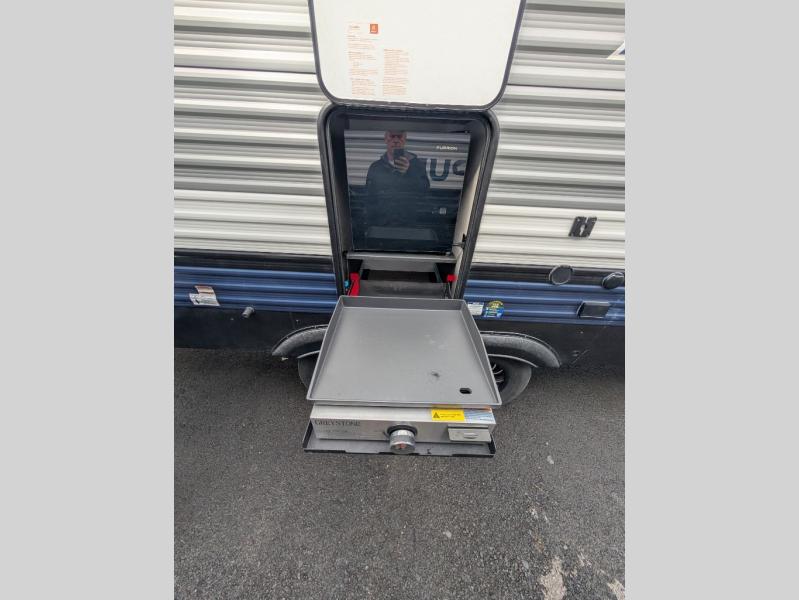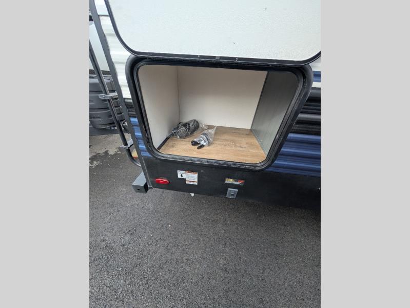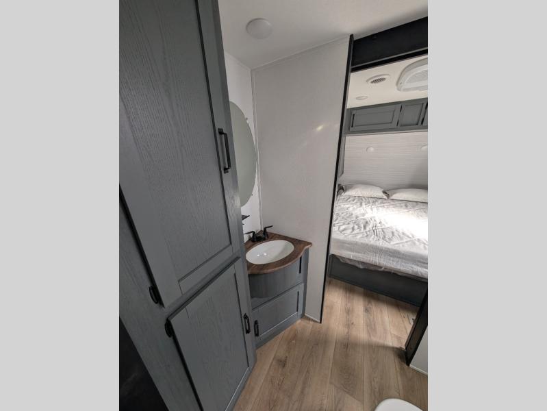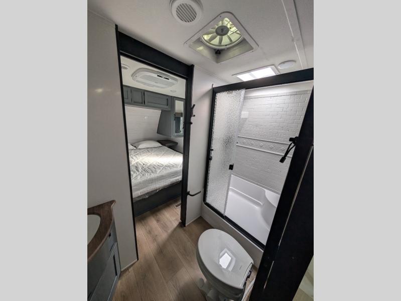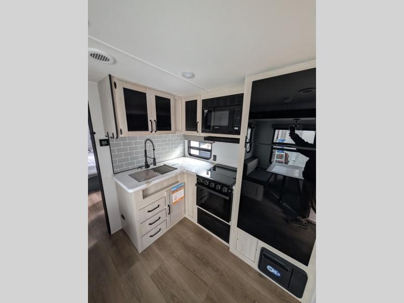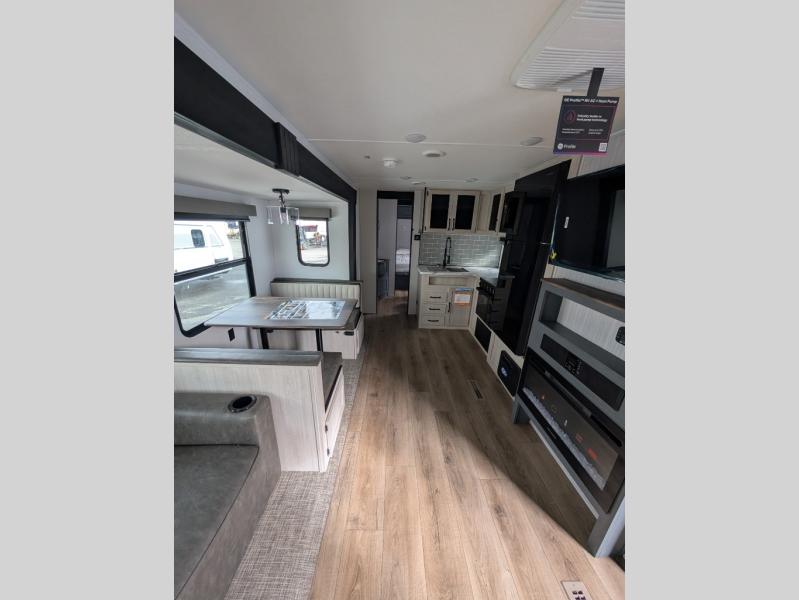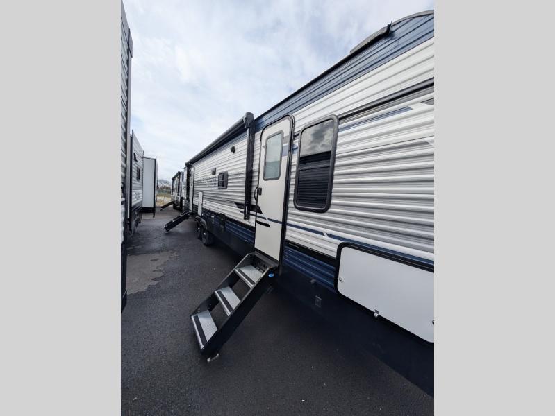 This travel trailer is perfect for camping with a larger group of friends or if you have older kids since there are two private bunkrooms! Each room includes a bunk bed and storage space for clothes, shoes, and more. You'll enjoy your own space up front in the master bedroom that includes a queen bed, dual shirt closets, and one of the dual entry doors to the unit for added convenience. Everyone can come together in the combined living area and kitchen that includes a large slide out with a sofa and booth dinette, plus there is a fireplace to make this space feel more like home. And a full kitchen lets you create home-cooked meals each day.