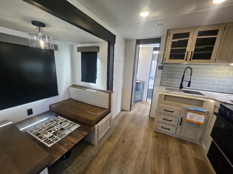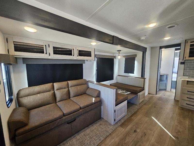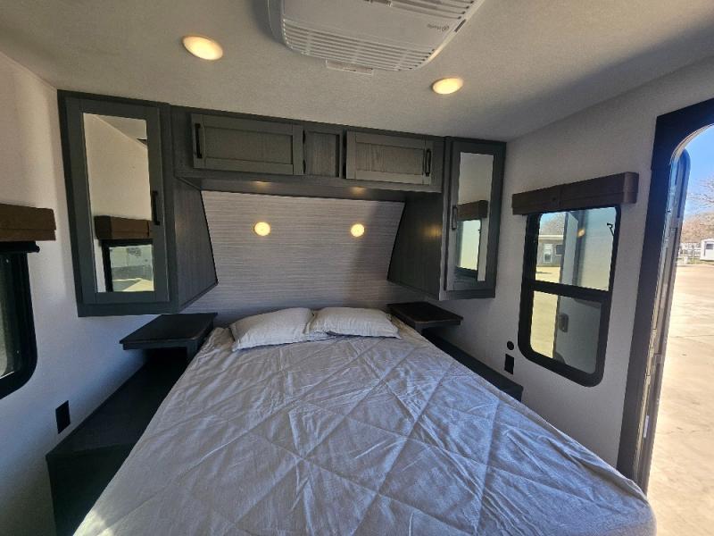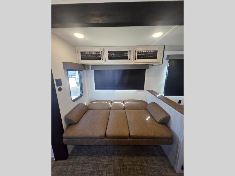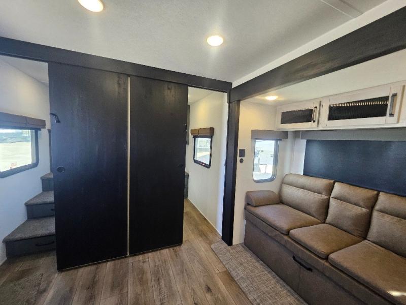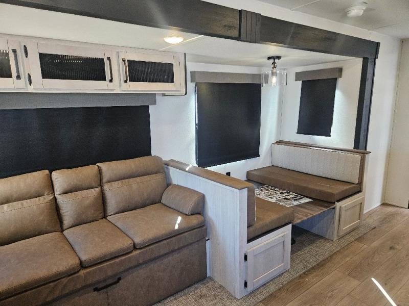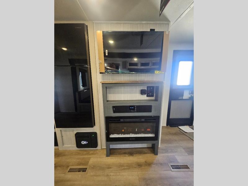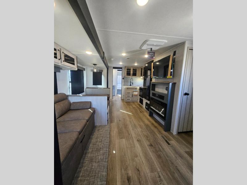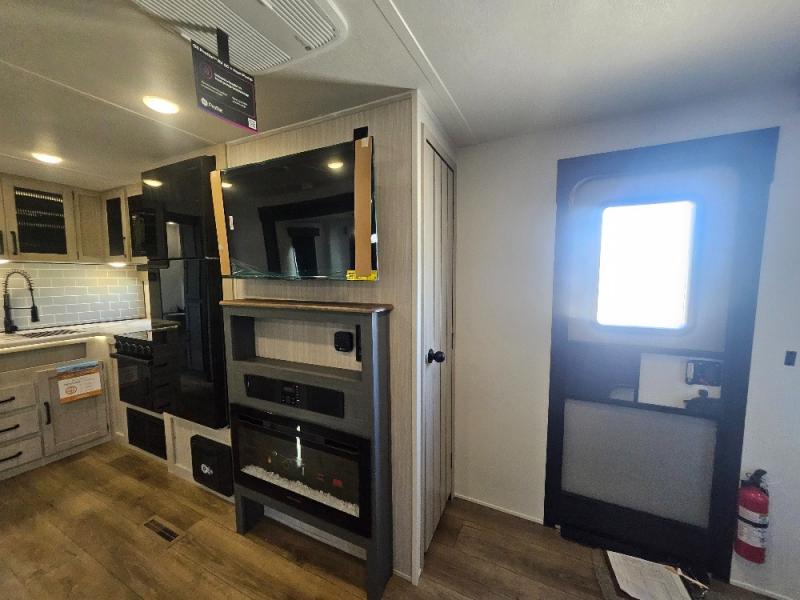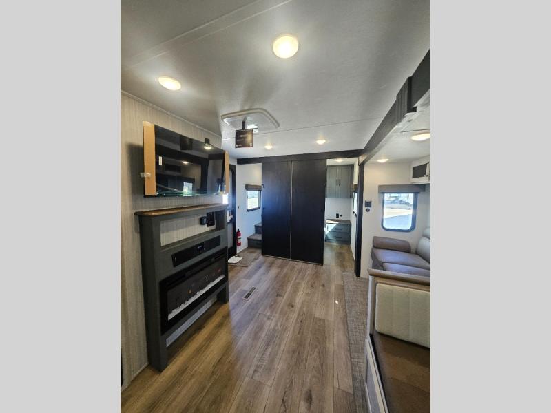 This travel trailer is perfect for camping with a larger group of friends or if you have older kids since there are two private bunkrooms! Each room includes a bunk bed and storage space for clothes, shoes, and more. You'll enjoy your own space up front in the master bedroom that includes a queen bed, dual shirt closets, and one of the dual entry doors to the unit for added convenience. Everyone can come together in the combined living area and kitchen that includes a large slide out with a sofa and booth dinette, plus there is a fireplace to make this space feel more like home. And a full kitchen lets you create home-cooked meals each day.