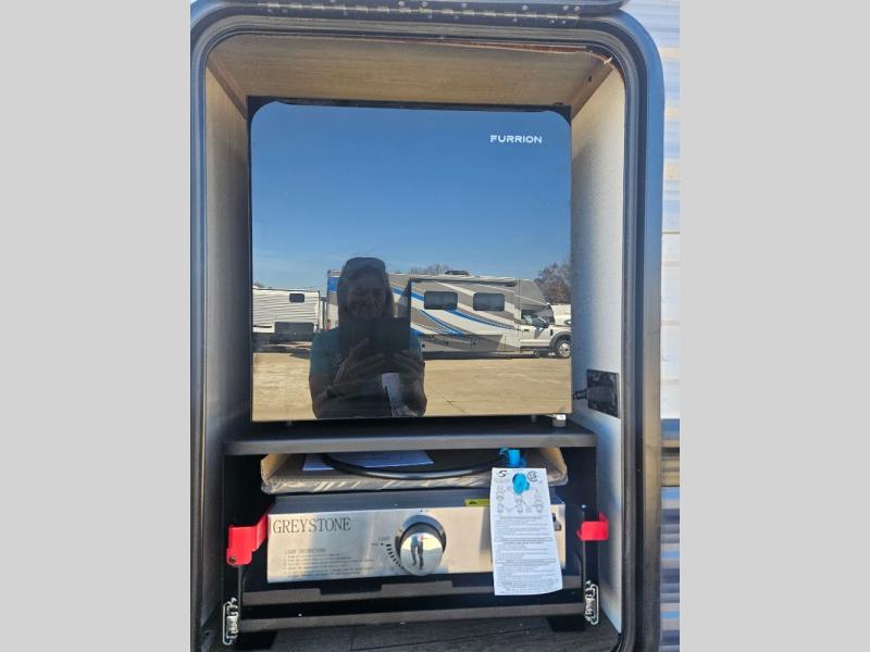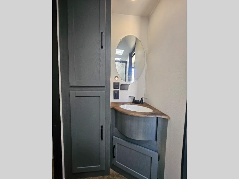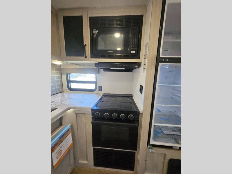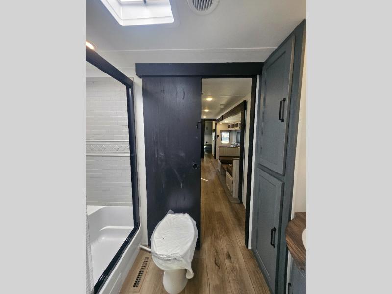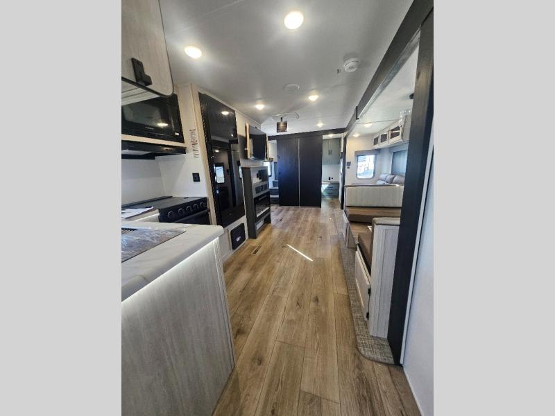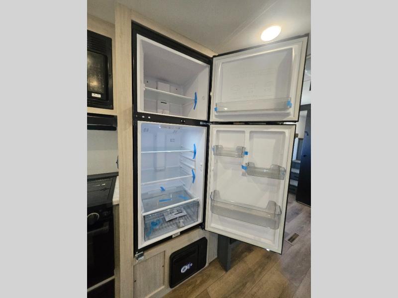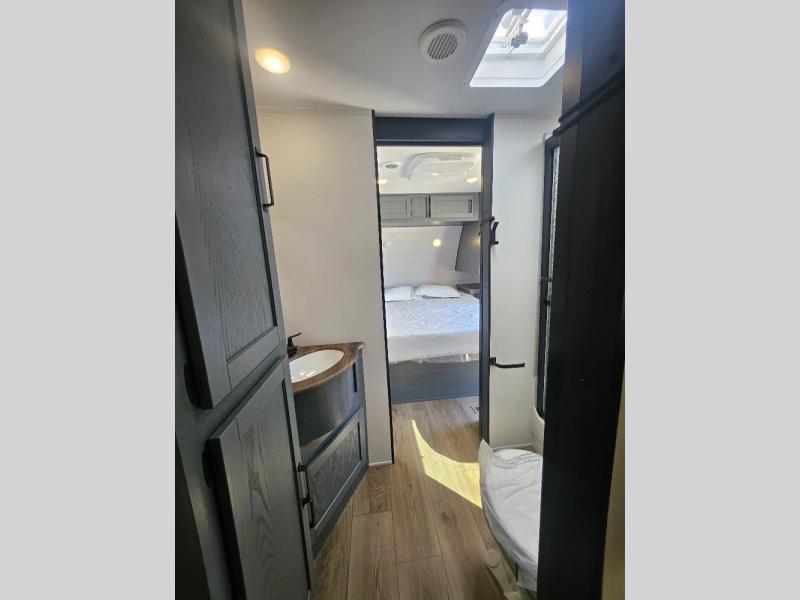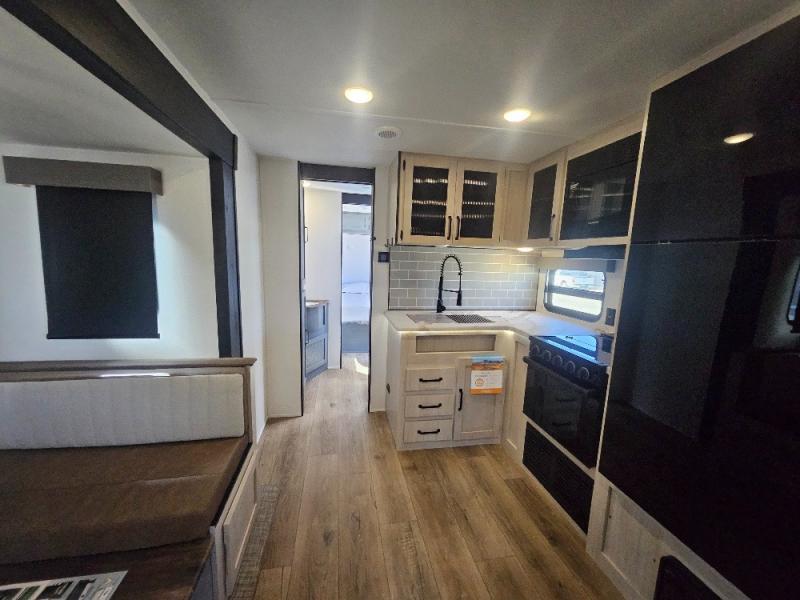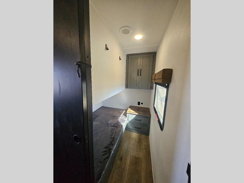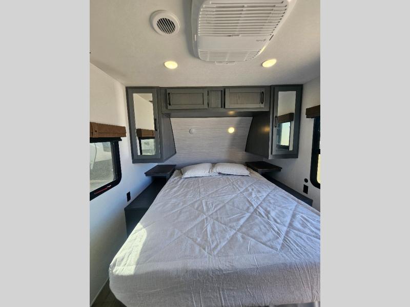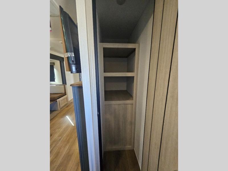 This travel trailer is perfect for camping with a larger group of friends or if you have older kids since there are two private bunkrooms! Each room includes a bunk bed and storage space for clothes, shoes, and more. You'll enjoy your own space up front in the master bedroom that includes a queen bed, dual shirt closets, and one of the dual entry doors to the unit for added convenience. Everyone can come together in the combined living area and kitchen that includes a large slide out with a sofa and booth dinette, plus there is a fireplace to make this space feel more like home. And a full kitchen lets you create home-cooked meals each day.