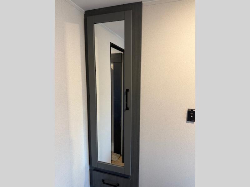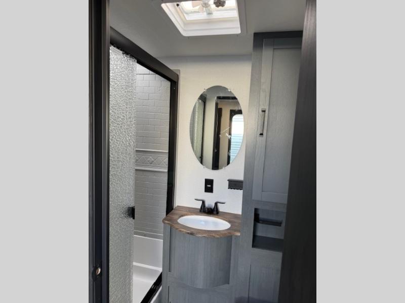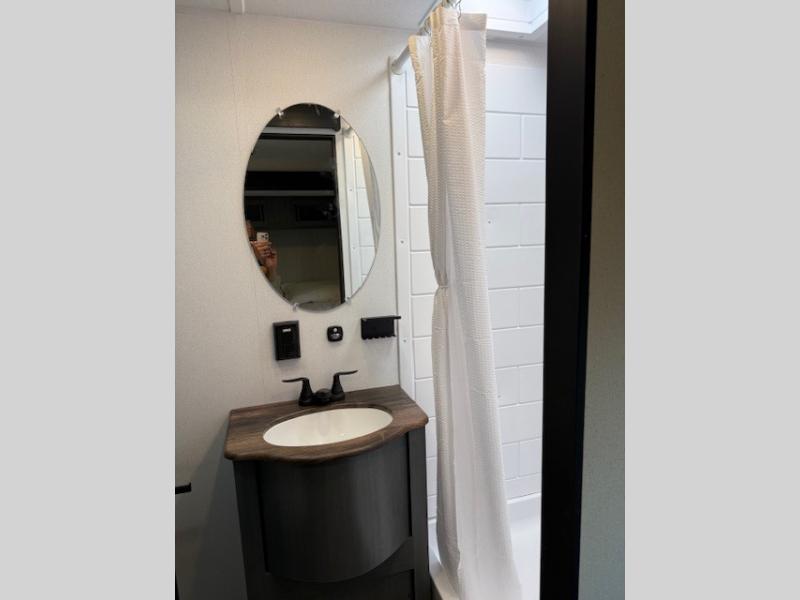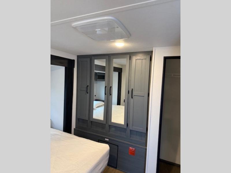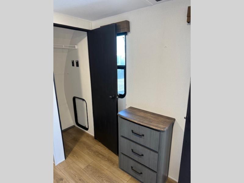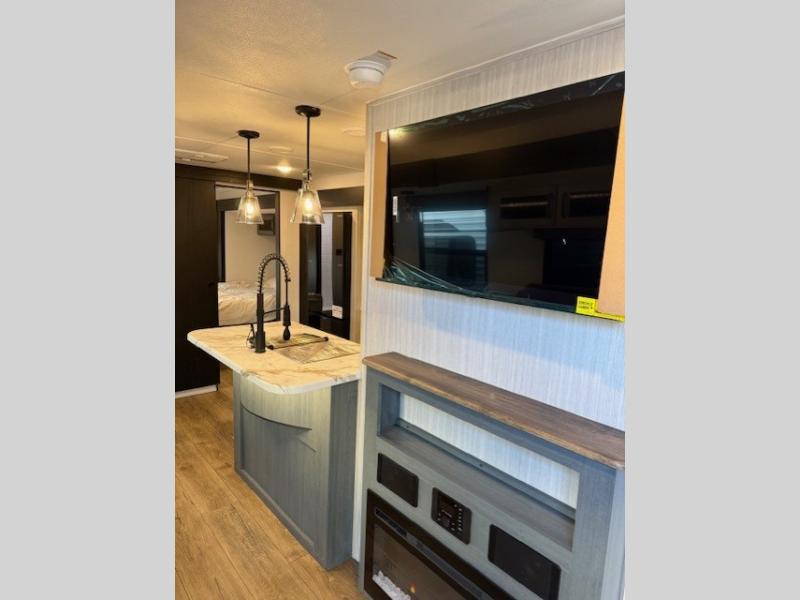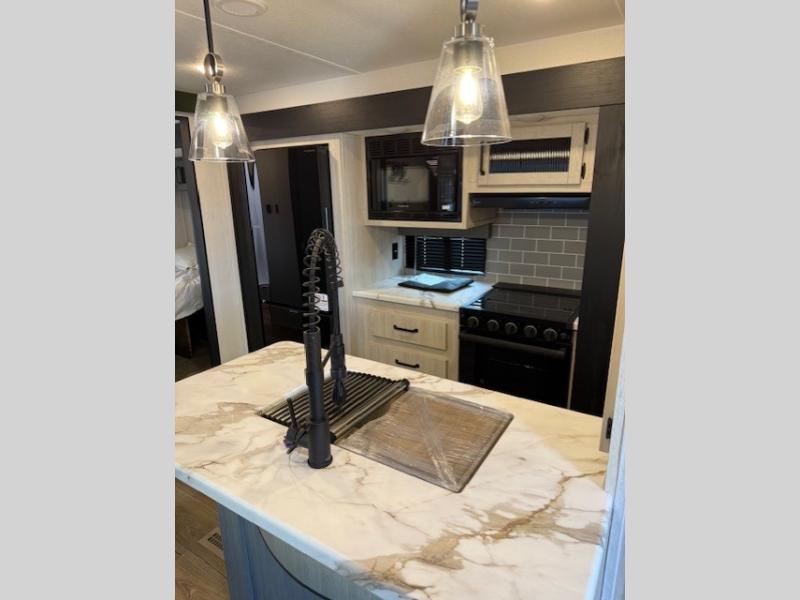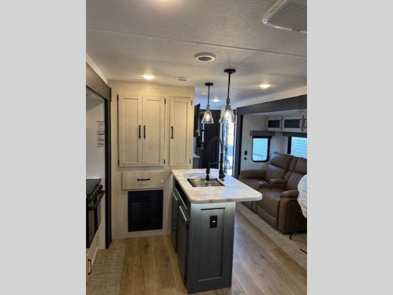 If you enjoy camping with friends or family, this travel trailer will be perfect for you! There are two bedrooms with queen bed slide outs and storage space, plus the rear bedroom includes its own full bath for added comfort. A bunkhouse suite option is also available if you choose the jiffy sofa with a bunk in place of the queen bed in the rear bedroom. Everyone can meet in the combined kitchen and living area that includes a counter peninsula, a spacious pantry, all the kitchen appliances to cook meals, plus a table with chairs and bench seating. There is also a sofa with overhead storage for more seating and sleeping space. Don't let this impressive travel trailer slip away!