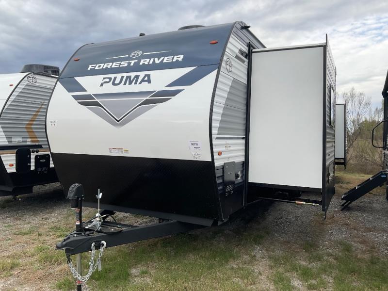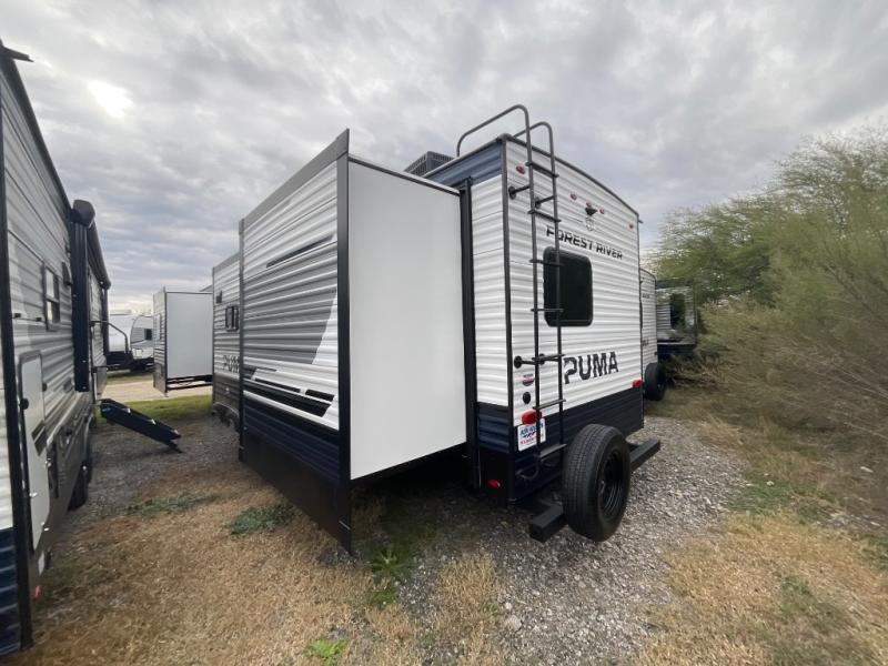 If you're looking for family-fun adventures, then you need one of these Forest River Puma travel trailers! They are built rugged, easy to tow, and jam packed with features. The Darco wrapped underbelly will help protect your unit, and the roof and side mount solar prep gives you the option to add off-grid power. Inside, the Congoleum linoleum will be easy to keep clean, and the night roller shades will provide privacy when it's time to turn in. You'll also enjoy an electric awning with an LED light strip plus an AM/FM/Bluetooth stereo and two outside speakers to keep the party going!
