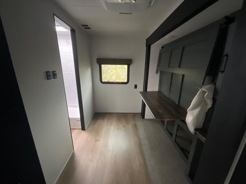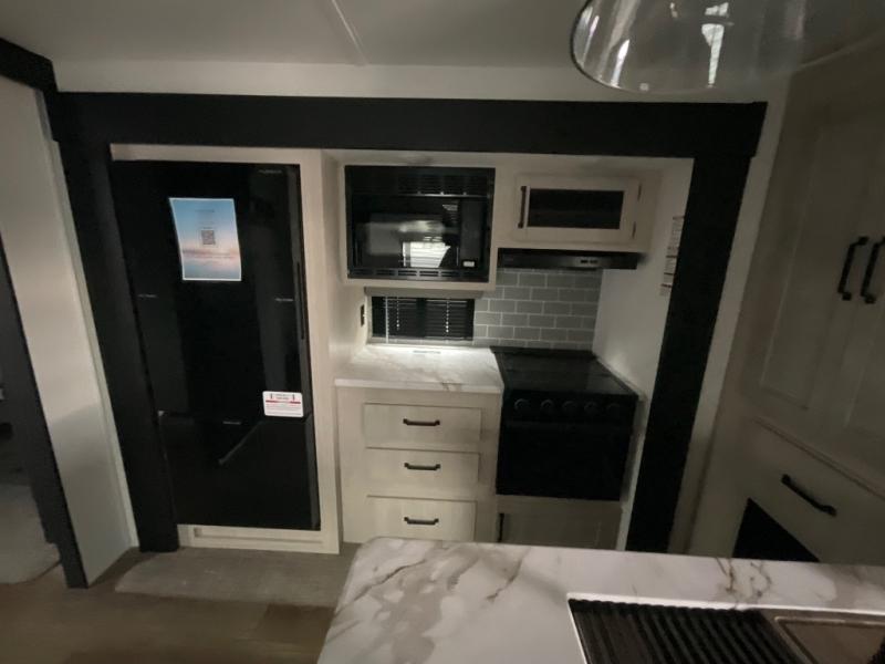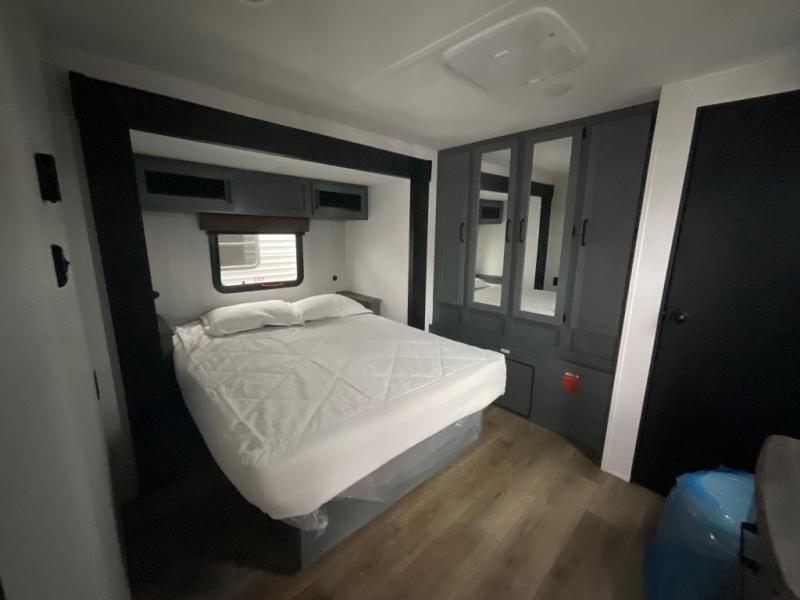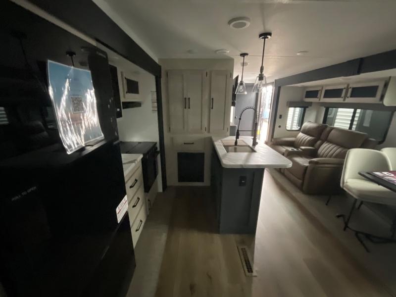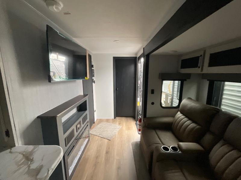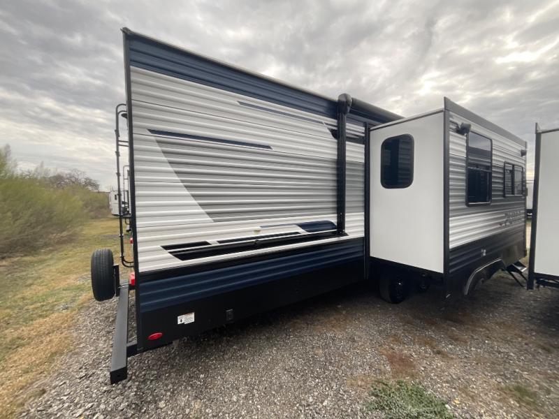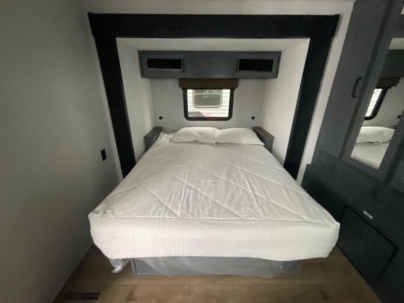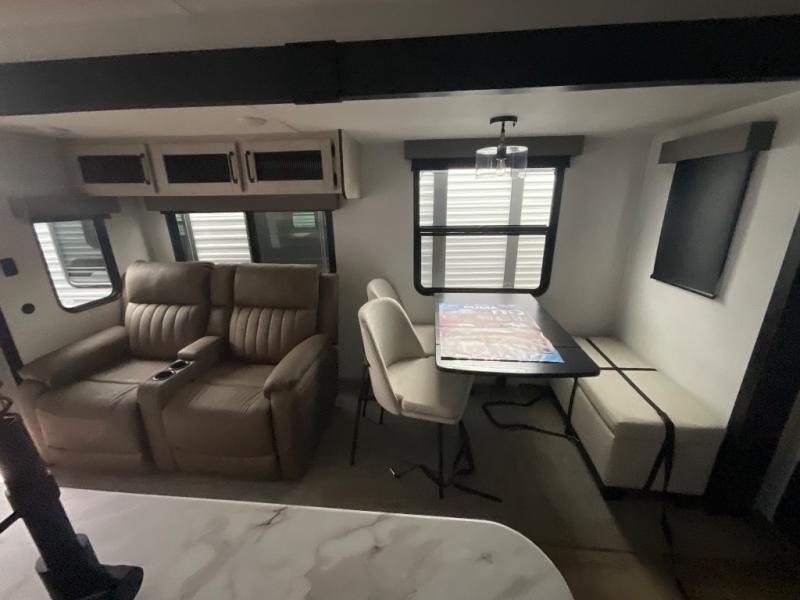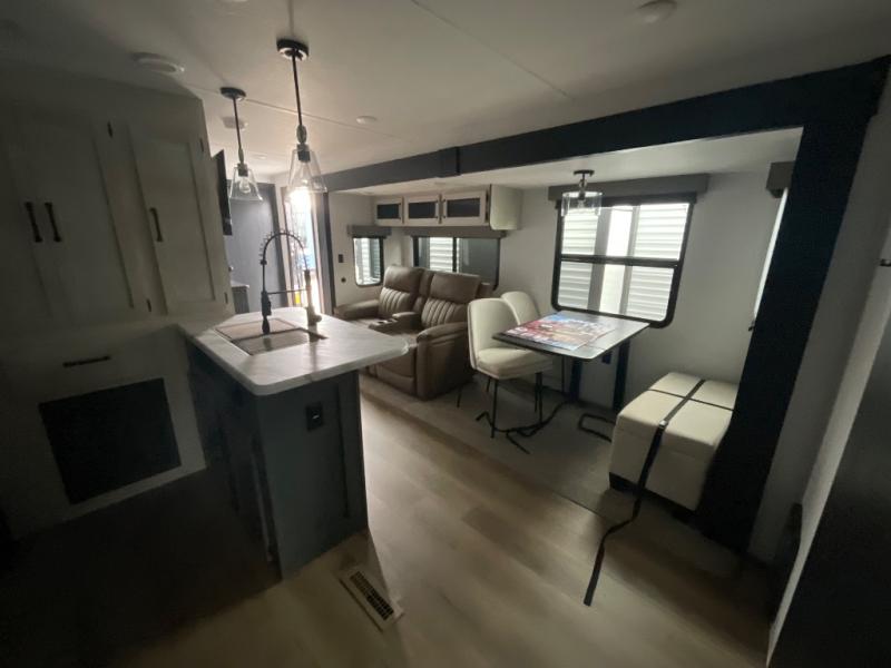 If you enjoy camping with friends or family, this travel trailer will be perfect for you! There are two bedrooms with queen bed slide outs and storage space, plus the rear bedroom includes its own full bath for added comfort. A bunkhouse suite option is also available if you choose the jiffy sofa with a bunk in place of the queen bed in the rear bedroom. Everyone can meet in the combined kitchen and living area that includes a counter peninsula, a spacious pantry, all the kitchen appliances to cook meals, plus a table with chairs and bench seating. There is also a sofa with overhead storage for more seating and sleeping space. Don't let this impressive travel trailer slip away!