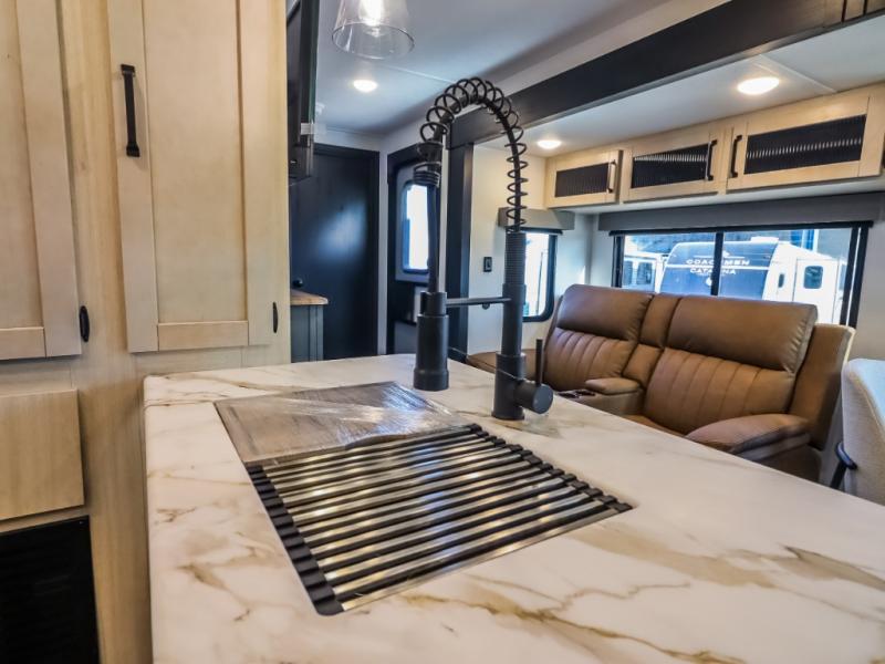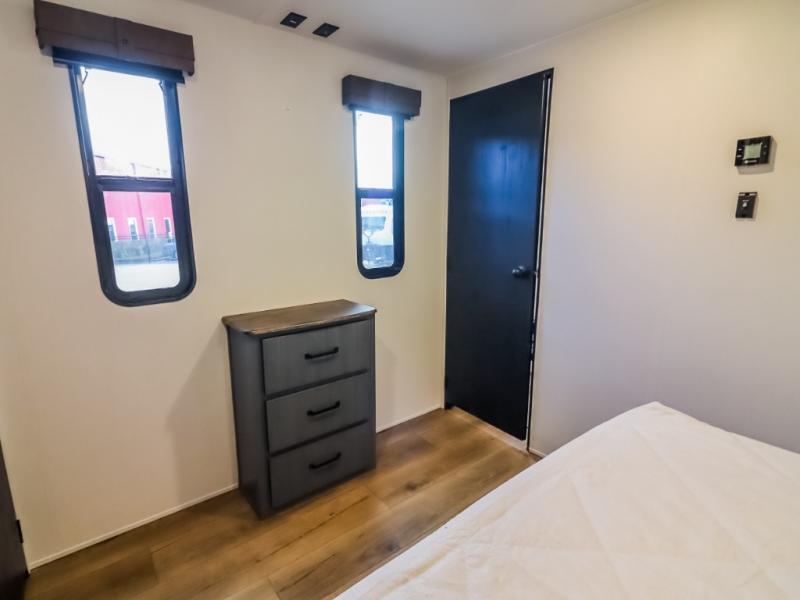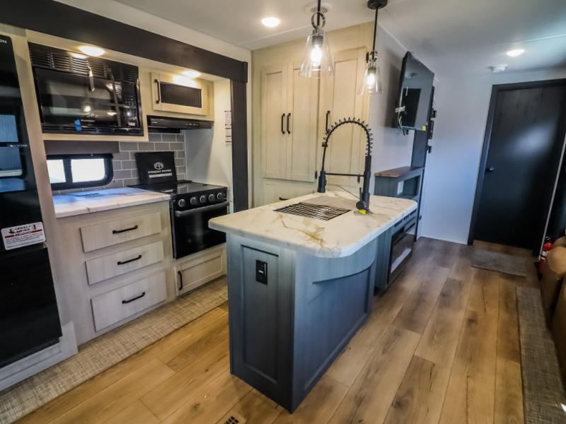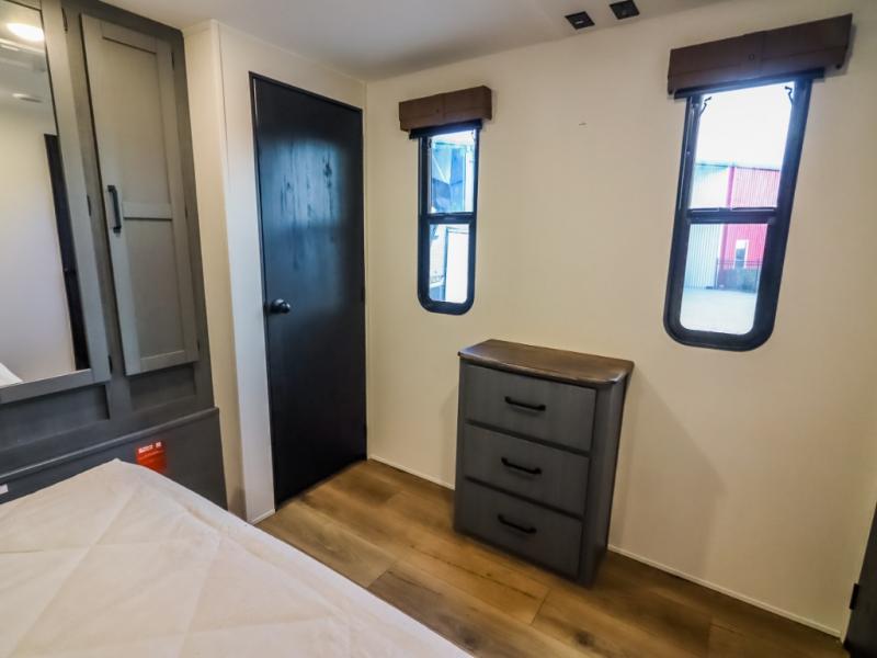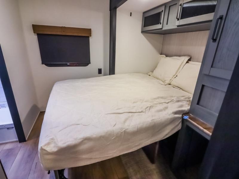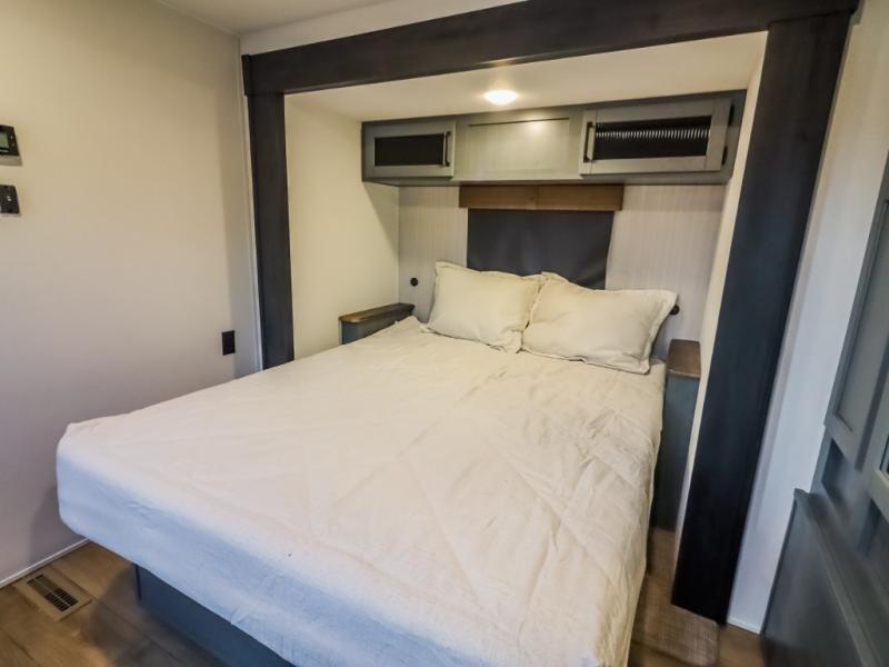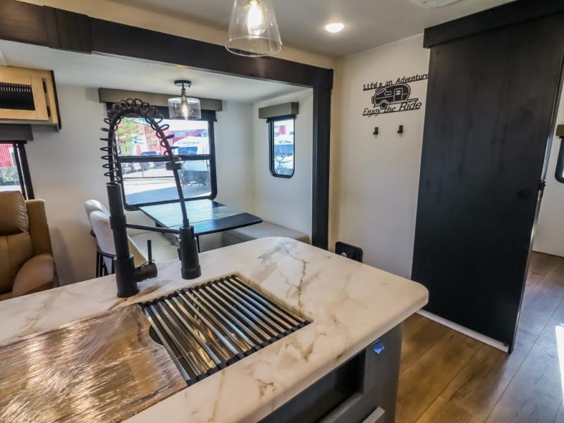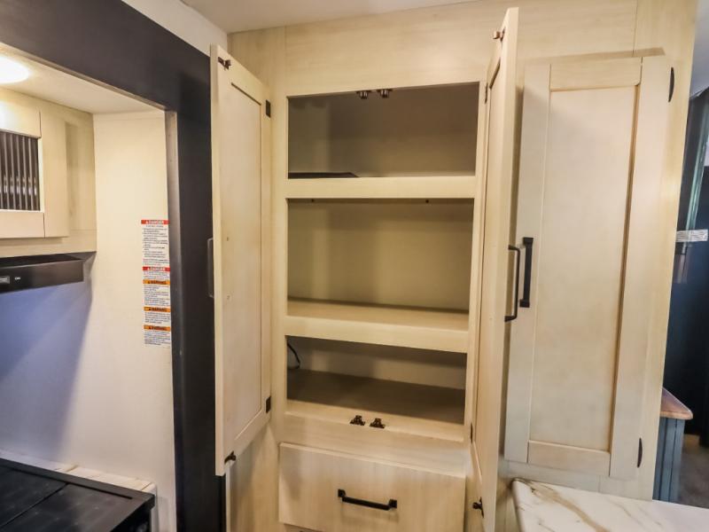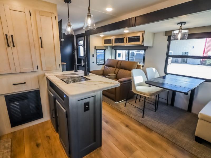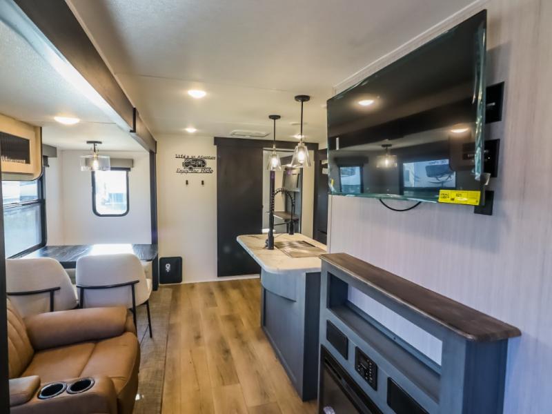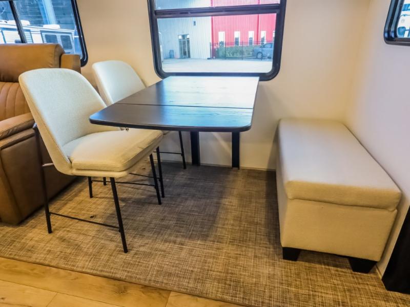 If you enjoy camping with friends or family, this travel trailer will be perfect for you! There are two bedrooms with queen bed slide outs and storage space, plus the rear bedroom includes its own full bath for added comfort. A bunkhouse suite option is also available if you choose the jiffy sofa with a bunk in place of the queen bed in the rear bedroom. Everyone can meet in the combined kitchen and living area that includes a counter peninsula, a spacious pantry, all the kitchen appliances to cook meals, plus a table with chairs and bench seating. There is also a sofa with overhead storage for more seating and sleeping space. Don't let this impressive travel trailer slip away!