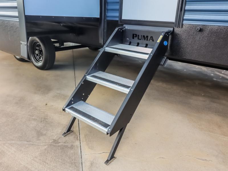 If you're looking for family-fun adventures, then you need one of these Forest River Puma travel trailers! They are built rugged, easy to tow, and jam packed with features. The Darco wrapped underbelly will help protect your unit, and the roof and side mount solar prep gives you the option to add off-grid power. Inside, the Congoleum linoleum will be easy to keep clean, and the night roller shades will provide privacy when it's time to turn in. You'll also enjoy an electric awning with an LED light strip plus an AM/FM/Bluetooth stereo and two outside speakers to keep the party going!