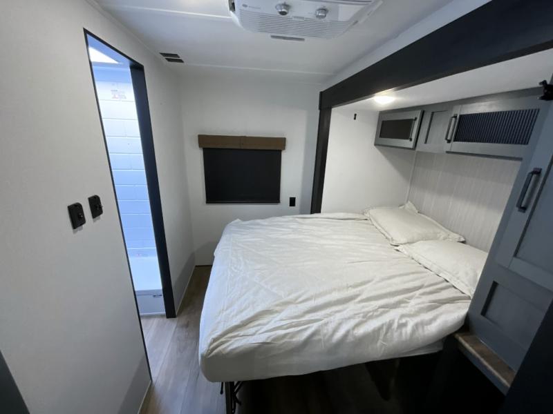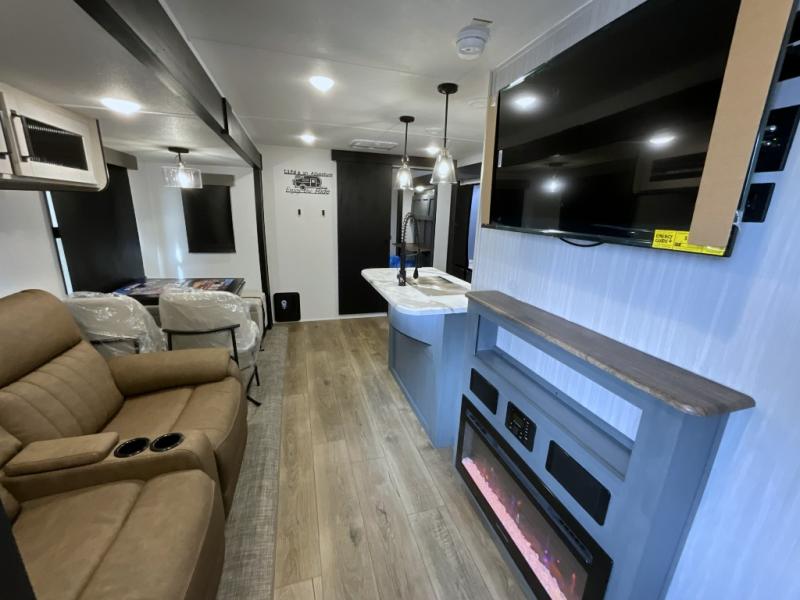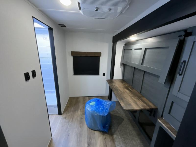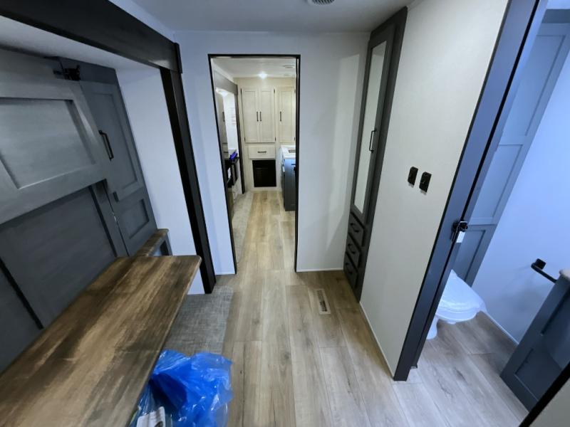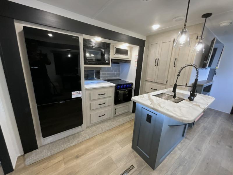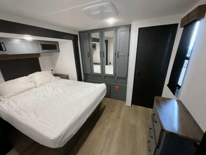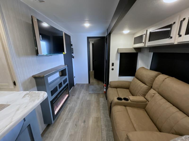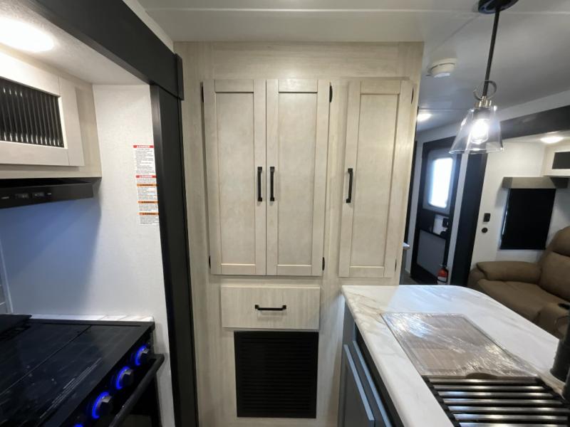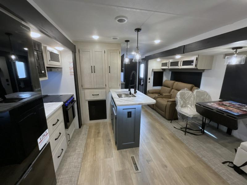 If you enjoy camping with friends or family, this travel trailer will be perfect for you! There are two bedrooms with queen bed slide outs and storage space, plus the rear bedroom includes its own full bath for added comfort. A bunkhouse suite option is also available if you choose the jiffy sofa with a bunk in place of the queen bed in the rear bedroom. Everyone can meet in the combined kitchen and living area that includes a counter peninsula, a spacious pantry, all the kitchen appliances to cook meals, plus a table with chairs and bench seating. There is also a sofa with overhead storage for more seating and sleeping space. Don't let this impressive travel trailer slip away!