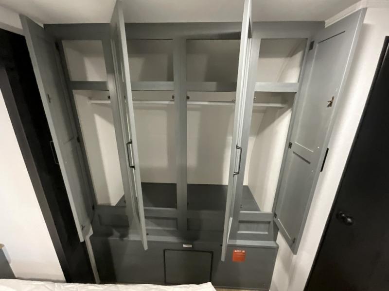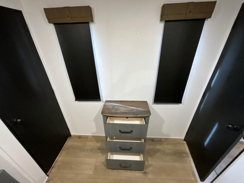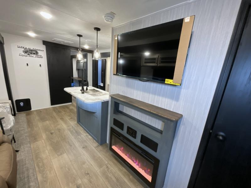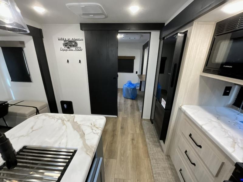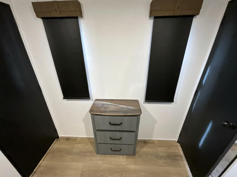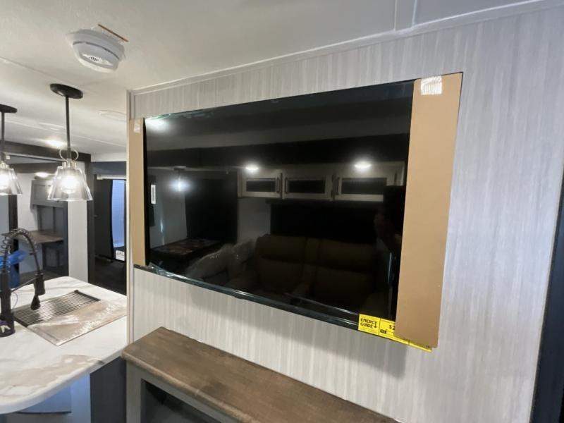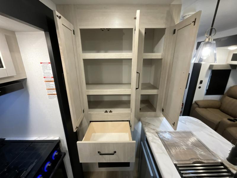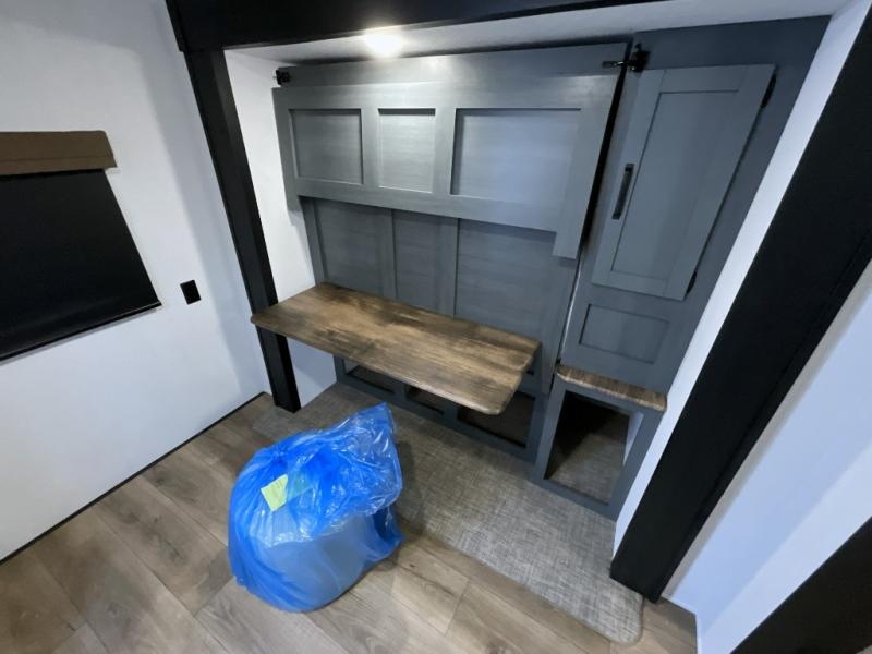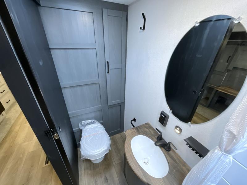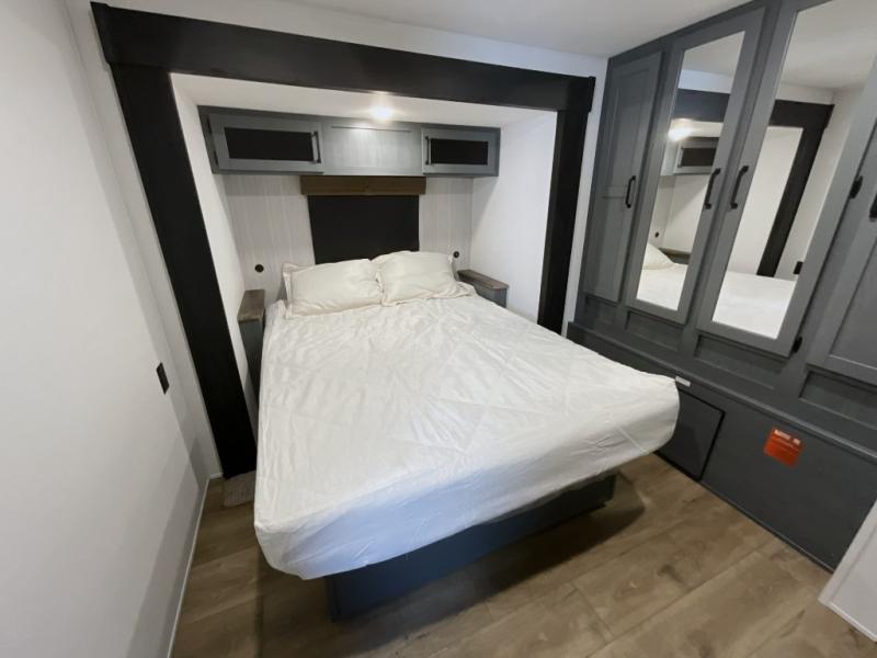 If you enjoy camping with friends or family, this travel trailer will be perfect for you! There are two bedrooms with queen bed slide outs and storage space, plus the rear bedroom includes its own full bath for added comfort. A bunkhouse suite option is also available if you choose the jiffy sofa with a bunk in place of the queen bed in the rear bedroom. Everyone can meet in the combined kitchen and living area that includes a counter peninsula, a spacious pantry, all the kitchen appliances to cook meals, plus a table with chairs and bench seating. There is also a sofa with overhead storage for more seating and sleeping space. Don't let this impressive travel trailer slip away!