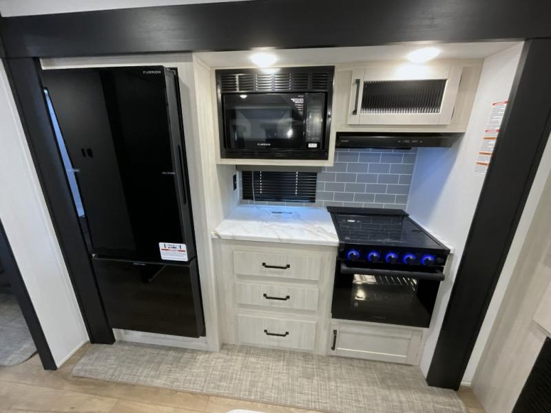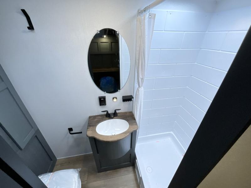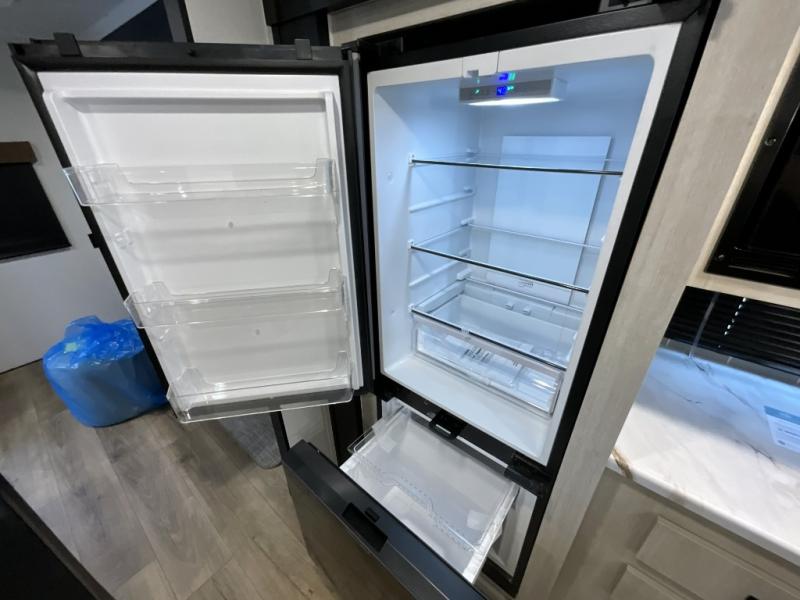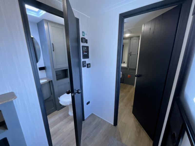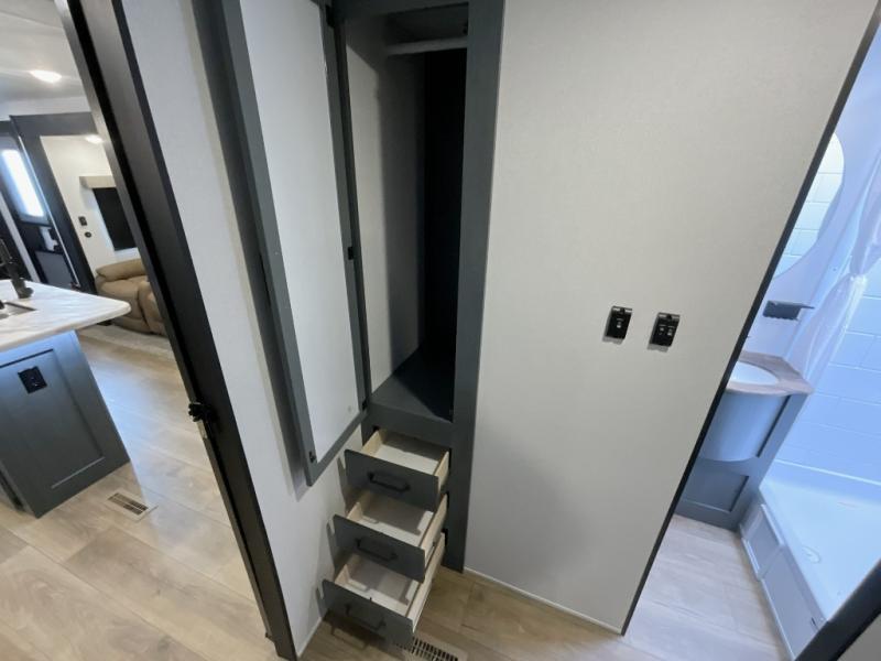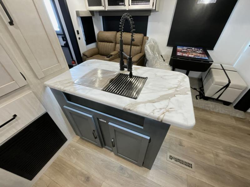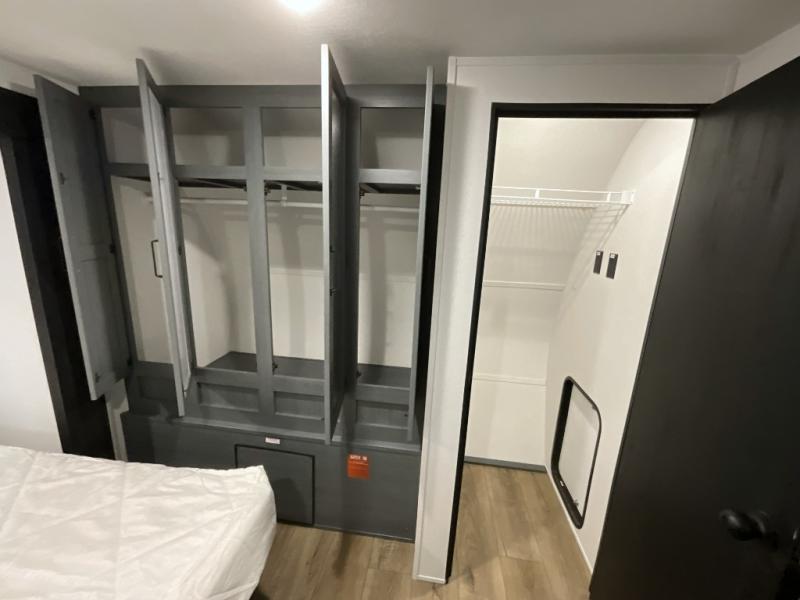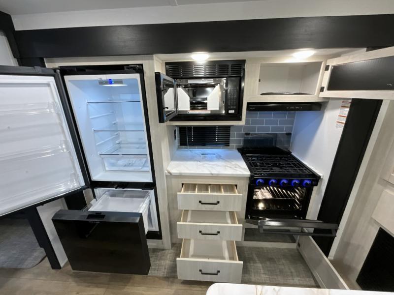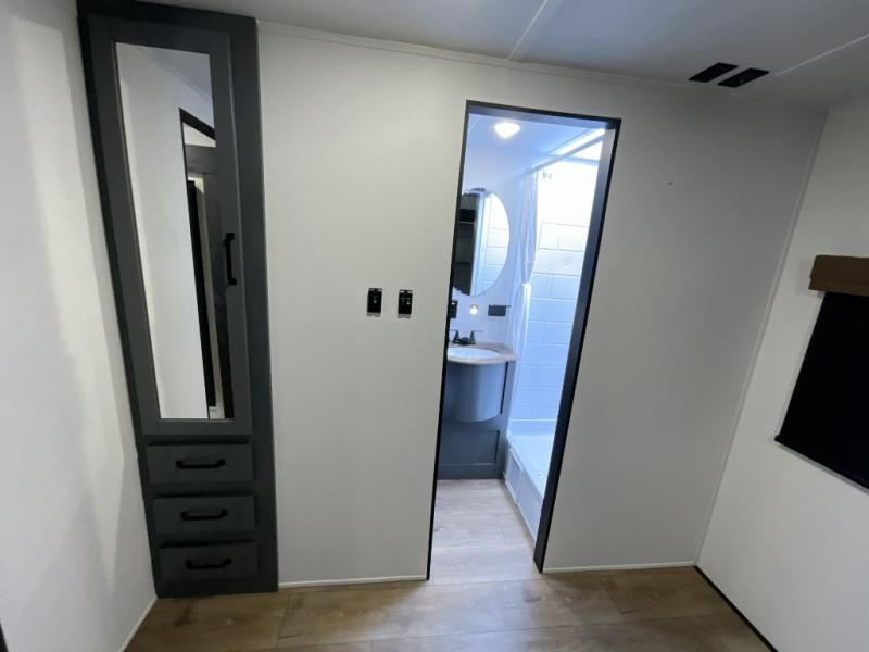 If you enjoy camping with friends or family, this travel trailer will be perfect for you! There are two bedrooms with queen bed slide outs and storage space, plus the rear bedroom includes its own full bath for added comfort. A bunkhouse suite option is also available if you choose the jiffy sofa with a bunk in place of the queen bed in the rear bedroom. Everyone can meet in the combined kitchen and living area that includes a counter peninsula, a spacious pantry, all the kitchen appliances to cook meals, plus a table with chairs and bench seating. There is also a sofa with overhead storage for more seating and sleeping space. Don't let this impressive travel trailer slip away!
