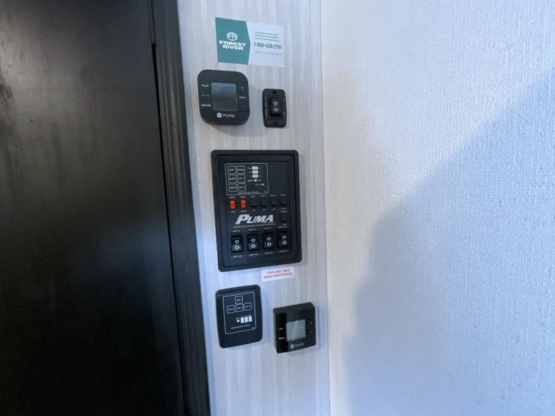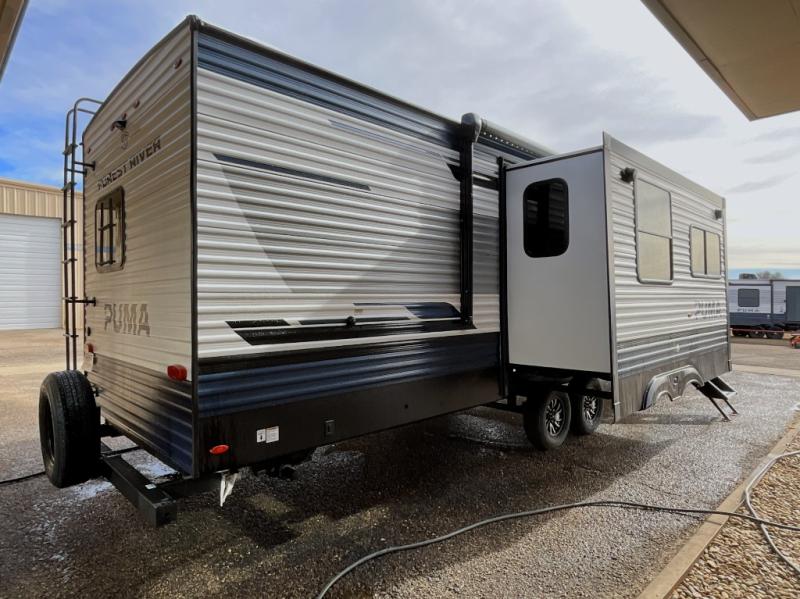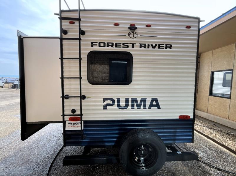 If you're looking for family-fun adventures, then you need one of these Forest River Puma travel trailers! They are built rugged, easy to tow, and jam packed with features. The Darco wrapped underbelly will help protect your unit, and the roof and side mount solar prep gives you the option to add off-grid power. Inside, the Congoleum linoleum will be easy to keep clean, and the night roller shades will provide privacy when it's time to turn in. You'll also enjoy an electric awning with an LED light strip plus an AM/FM/Bluetooth stereo and two outside speakers to keep the party going!