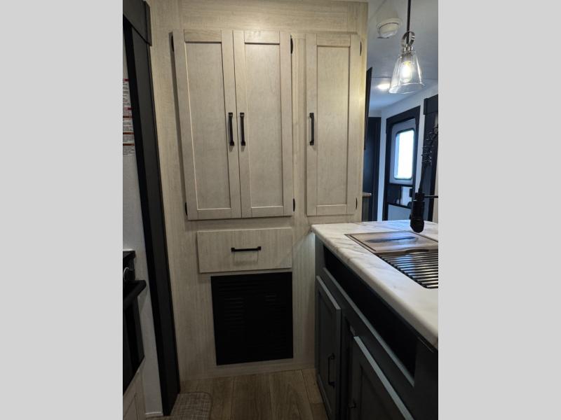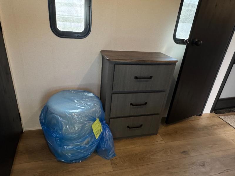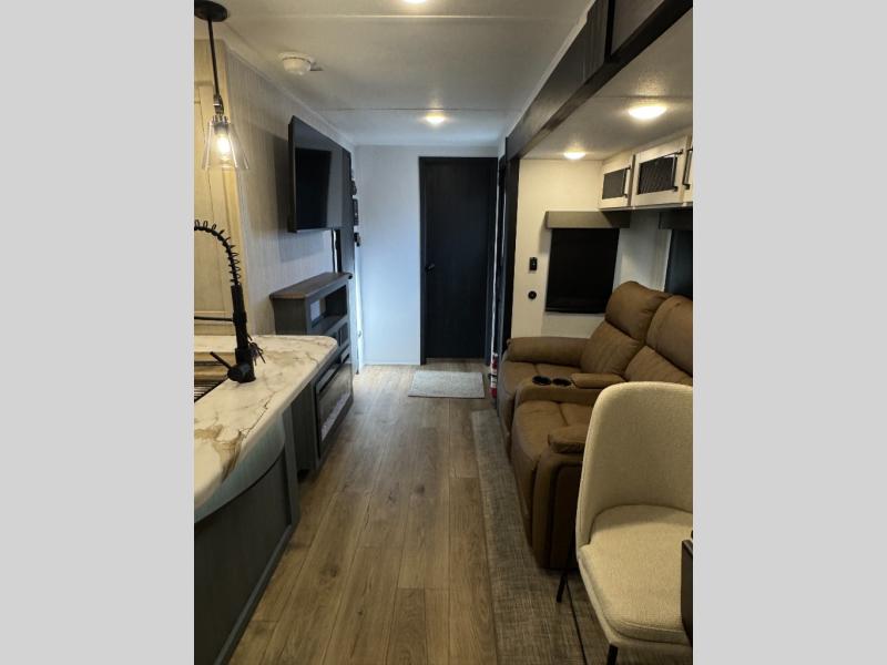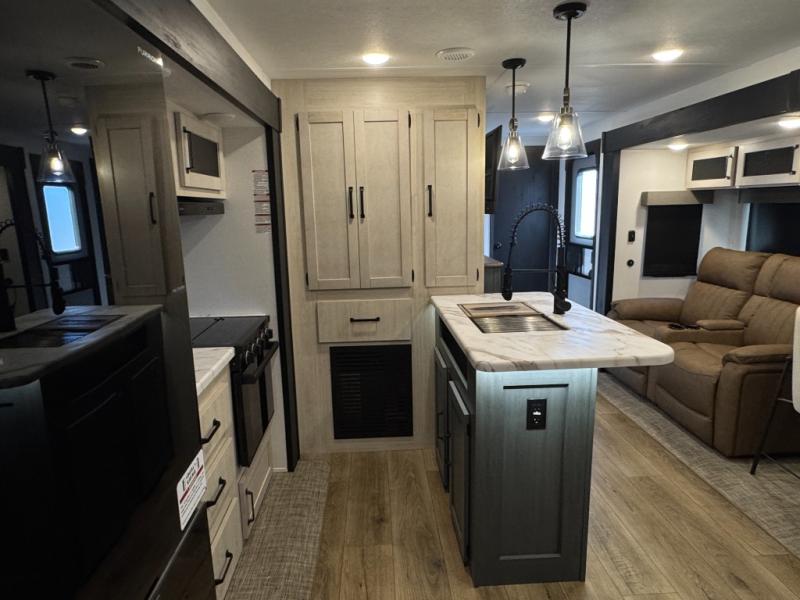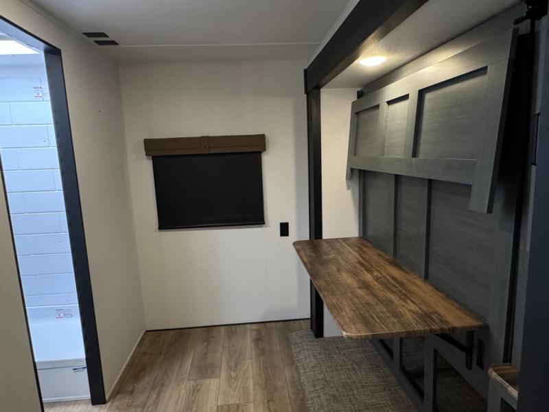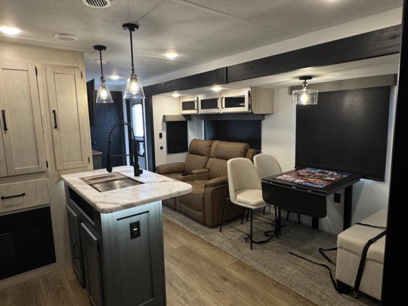 If you enjoy camping with friends or family, this travel trailer will be perfect for you! There are two bedrooms with queen bed slide outs and storage space, plus the rear bedroom includes its own full bath for added comfort. A bunkhouse suite option is also available if you choose the jiffy sofa with a bunk in place of the queen bed in the rear bedroom. Everyone can meet in the combined kitchen and living area that includes a counter peninsula, a spacious pantry, all the kitchen appliances to cook meals, plus a table with chairs and bench seating. There is also a sofa with overhead storage for more seating and sleeping space. Don't let this impressive travel trailer slip away!