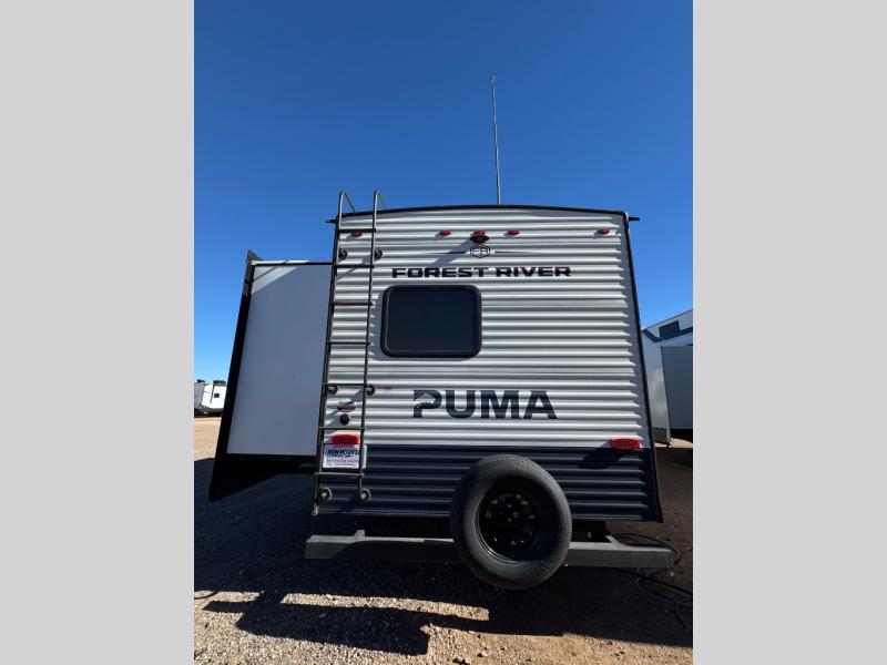 If you're looking for family-fun adventures, then you need one of these Forest River Puma travel trailers! They are built rugged, easy to tow, and jam packed with features. The Darco wrapped underbelly will help protect your unit, and the roof and side mount solar prep gives you the option to add off-grid power. Inside, the Congoleum linoleum will be easy to keep clean, and the night roller shades will provide privacy when it's time to turn in. You'll also enjoy an electric awning with an LED light strip plus an AM/FM/Bluetooth stereo and two outside speakers to keep the party going!