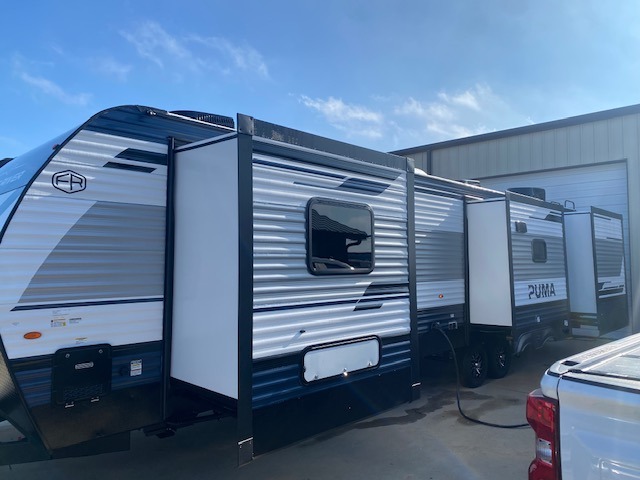 If you're looking for family-fun adventures, then you need one of these Forest River Puma travel trailers! They are built rugged, easy to tow, and jam packed with features. The Darco wrapped underbelly will help protect your unit, and the roof and side mount solar prep gives you the option to add off-grid power. Inside, the Congoleum linoleum will be easy to keep clean, and the night roller shades will provide privacy when it's time to turn in. You'll also enjoy an electric awning with an LED light strip plus an AM/FM/Bluetooth stereo and two outside speakers to keep the party going!
