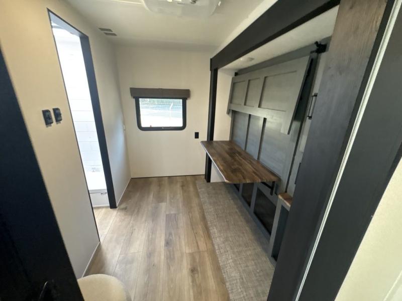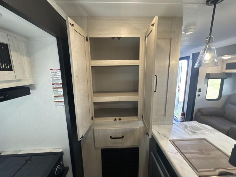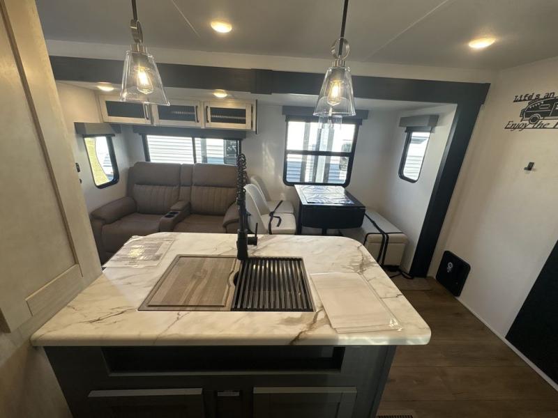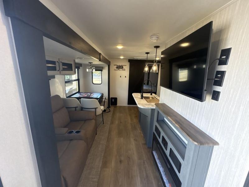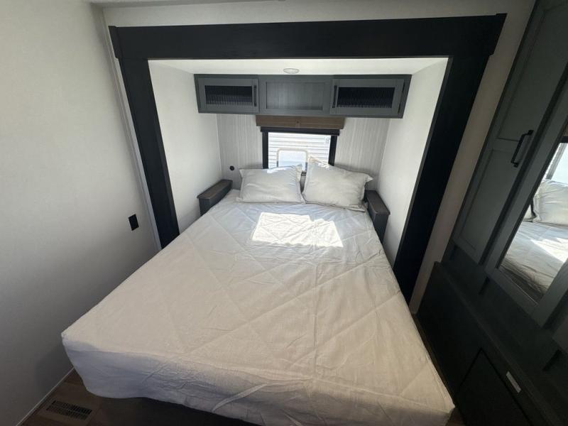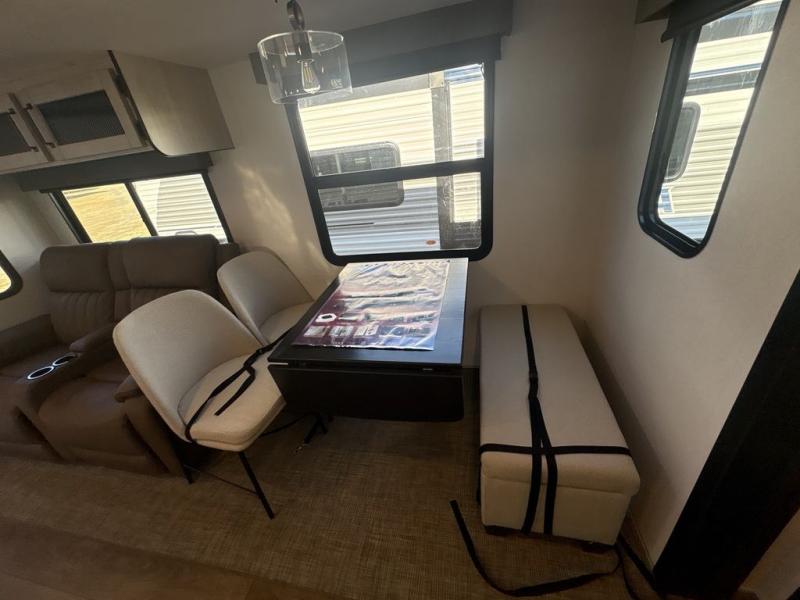 If you enjoy camping with friends or family, this travel trailer will be perfect for you! There are two bedrooms with queen bed slide outs and storage space, plus the rear bedroom includes its own full bath for added comfort. A bunkhouse suite option is also available if you choose the jiffy sofa with a bunk in place of the queen bed in the rear bedroom. Everyone can meet in the combined kitchen and living area that includes a counter peninsula, a spacious pantry, all the kitchen appliances to cook meals, plus a table with chairs and bench seating. There is also a sofa with overhead storage for more seating and sleeping space. Don't let this impressive travel trailer slip away!
