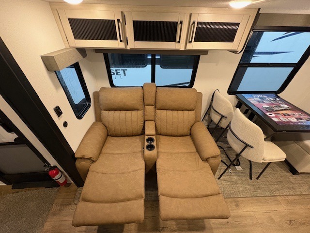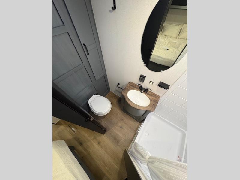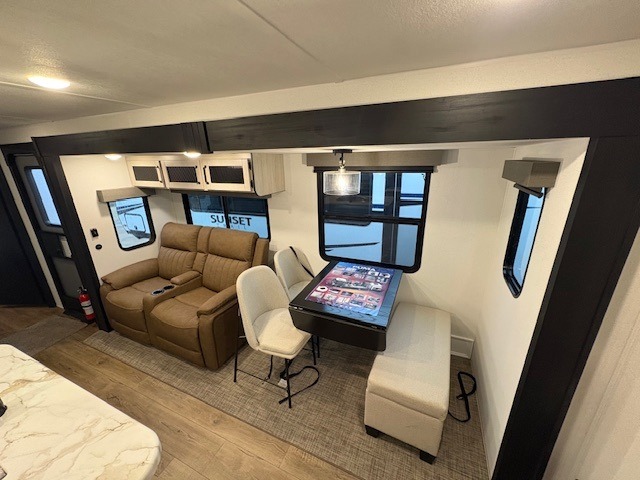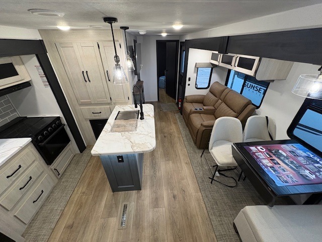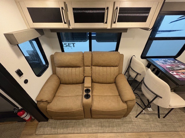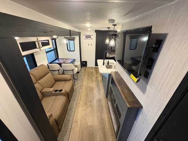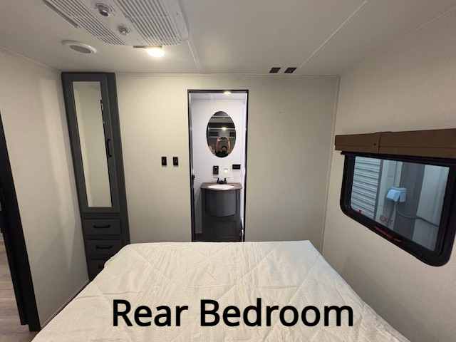 If you enjoy camping with friends or family, this travel trailer will be perfect for you! There are two bedrooms with queen bed slide outs and storage space, plus the rear bedroom includes its own full bath for added comfort. A bunkhouse suite option is also available if you choose the jiffy sofa with a bunk in place of the queen bed in the rear bedroom. Everyone can meet in the combined kitchen and living area that includes a counter peninsula, a spacious pantry, all the kitchen appliances to cook meals, plus a table with chairs and bench seating. There is also a sofa with overhead storage for more seating and sleeping space. Don't let this impressive travel trailer slip away!