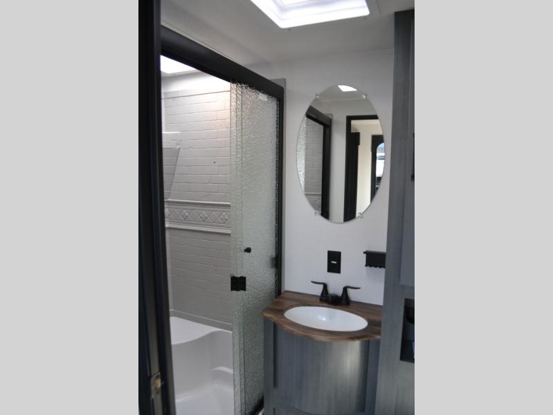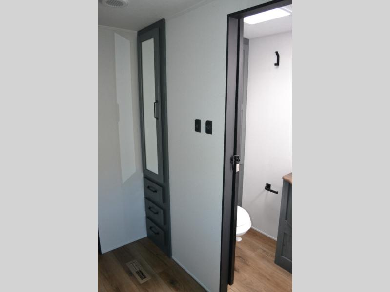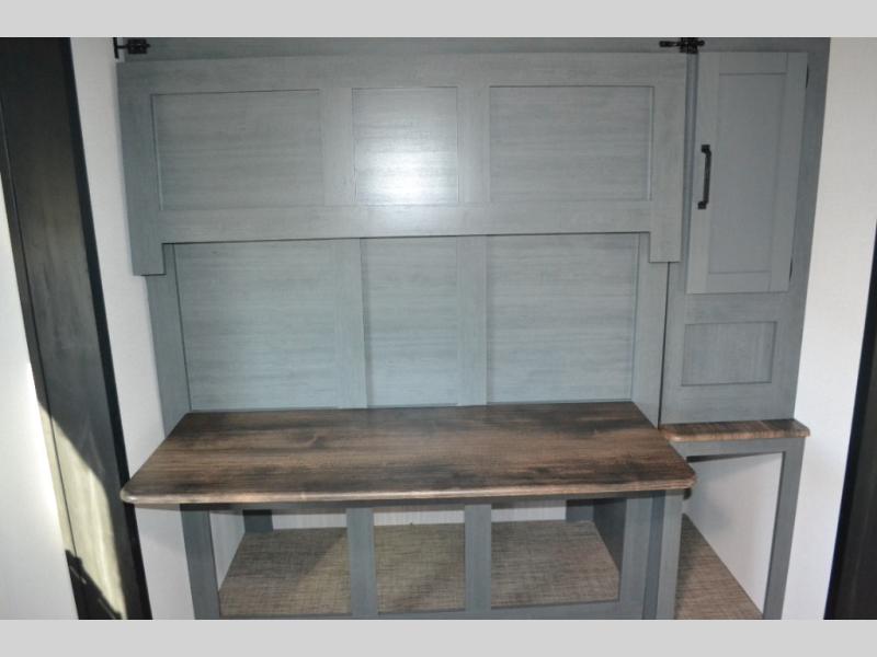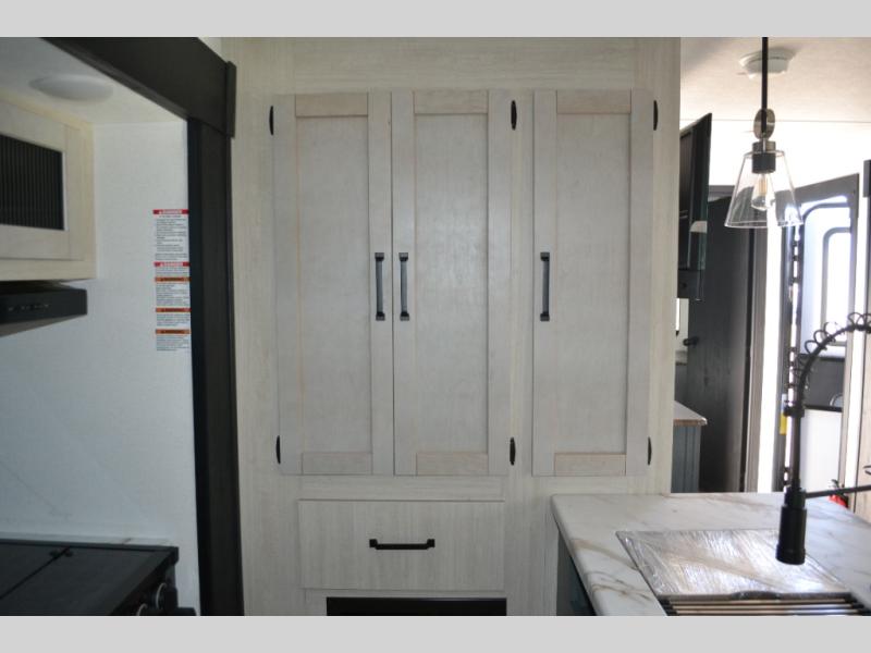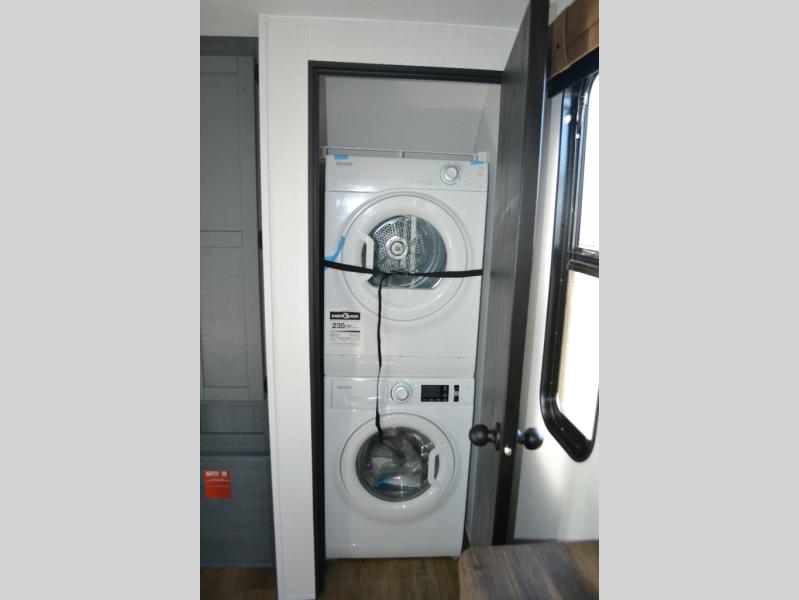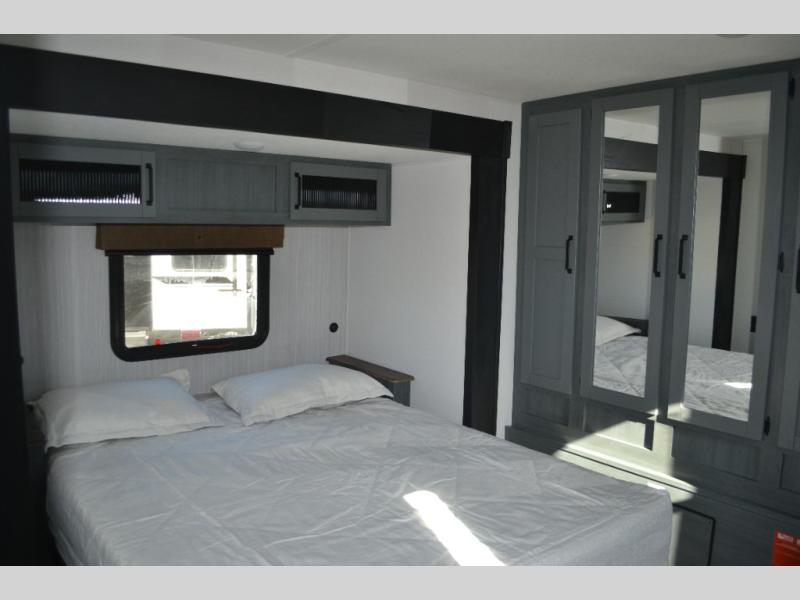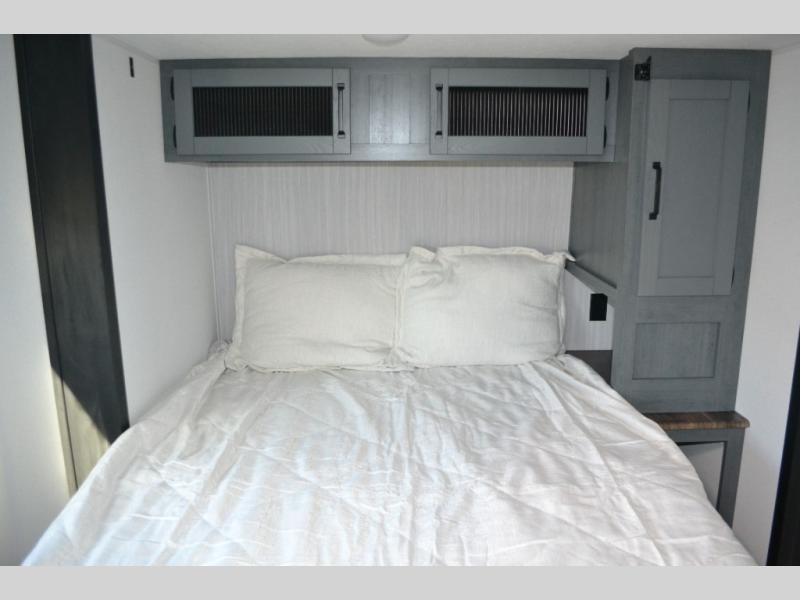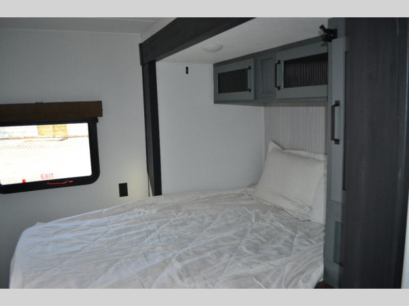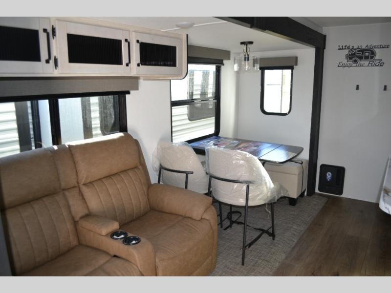 If you enjoy camping with friends or family, this travel trailer will be perfect for you! There are two bedrooms with queen bed slide outs and storage space, plus the rear bedroom includes its own full bath for added comfort. A bunkhouse suite option is also available if you choose the jiffy sofa with a bunk in place of the queen bed in the rear bedroom. Everyone can meet in the combined kitchen and living area that includes a counter peninsula, a spacious pantry, all the kitchen appliances to cook meals, plus a table with chairs and bench seating. There is also a sofa with overhead storage for more seating and sleeping space. Don't let this impressive travel trailer slip away!